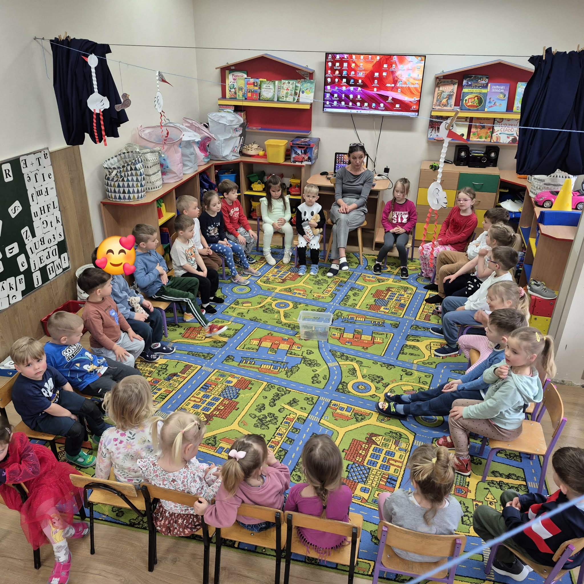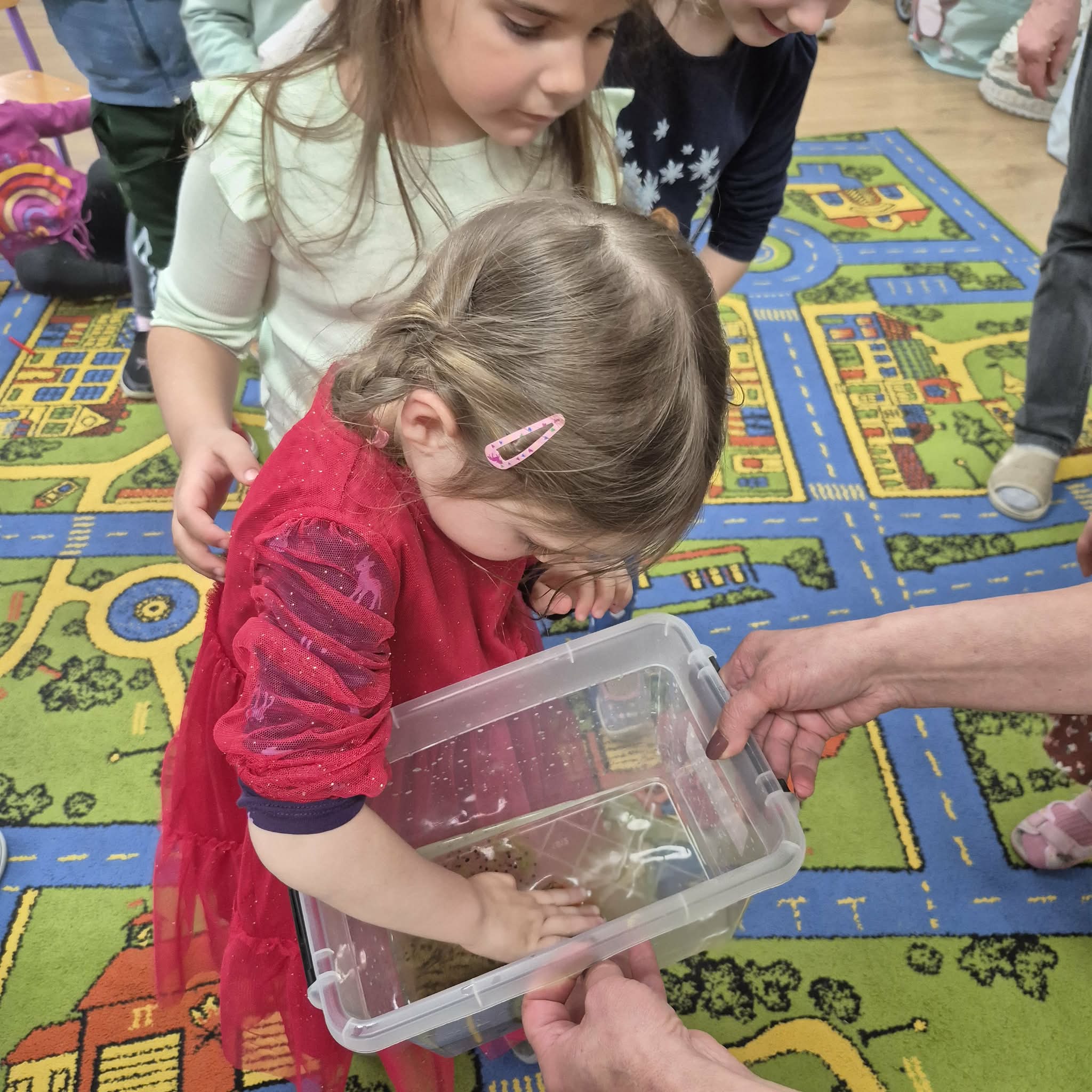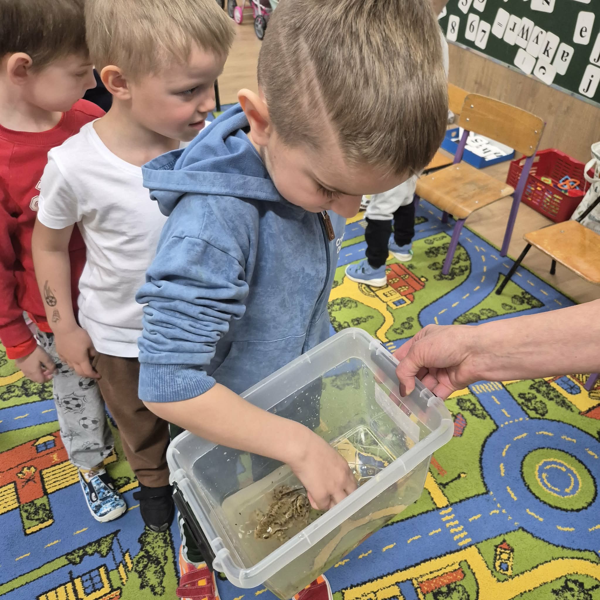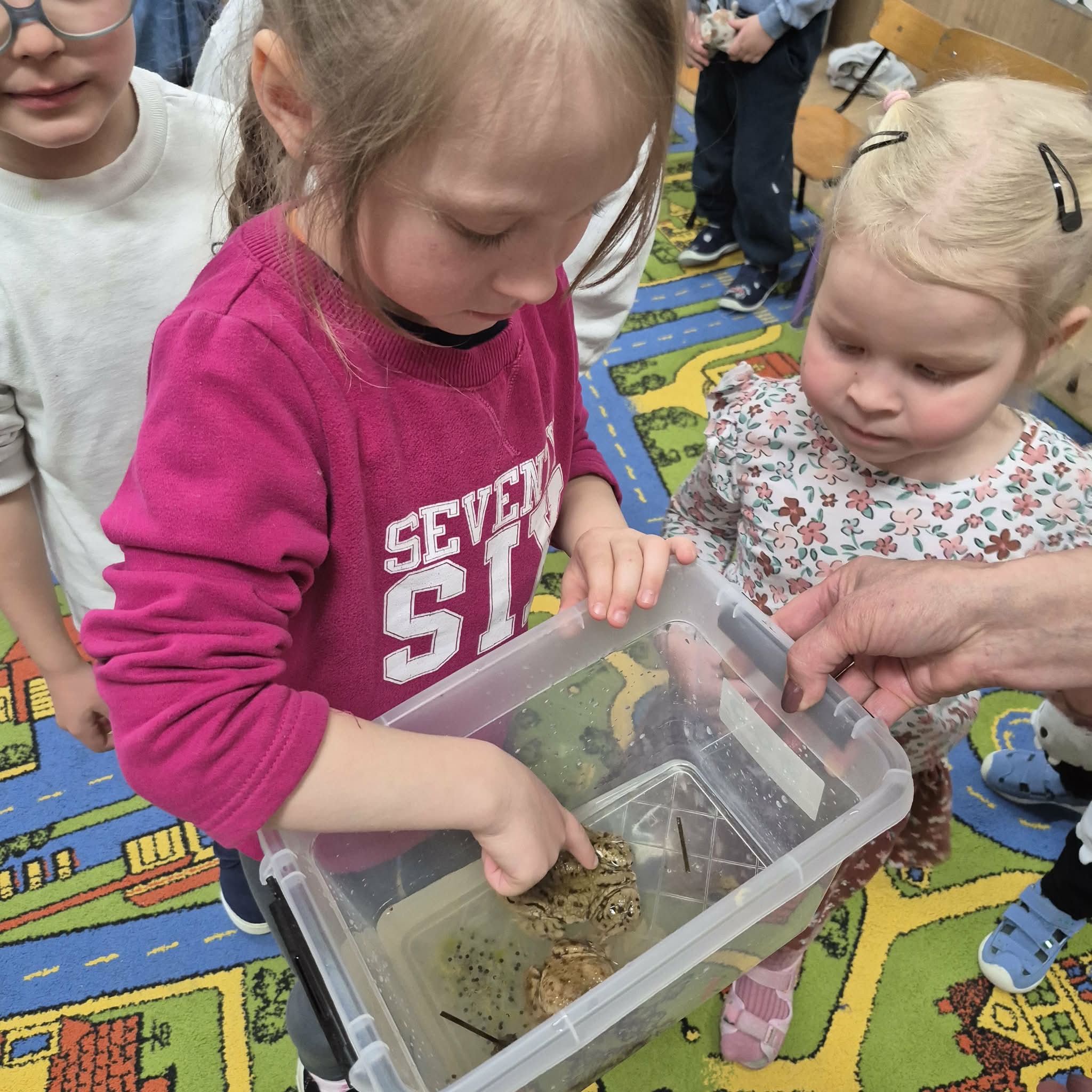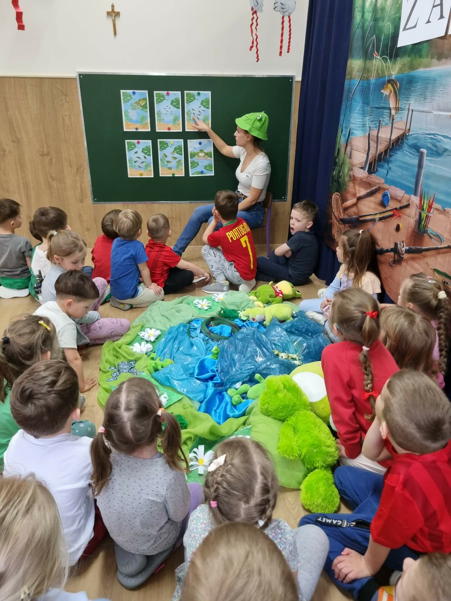 Dzień ŻABY, a właściwie dwa dni, w naszym przedszkolu upłynęły pod znakiem koloru zielonego i wielkich skoków. Dostarczyły one dzieciom mnóstwo emocji i nowej wiedzy. Największą atrakcją okazało się spotkanie z prawdziwymi żabami. Tutaj podziękowania należą się mamie Hubercika – p. Kasi. Przedszkolaki z ogromnym zaciekawieniem (i dużą odwagą!) przyglądały się naszym gościom, poznając z bliska ich zwyczaje oraz to, jak miła w dotyku i niezwykła jest ich skóra. W części edukacyjnej dzieci zamieniły się w małych przyrodników. Dowiedziały się m.in.: jak wygląda niezwykła przemiana od kijanki do dorosłej żaby, dlaczego żaby są pożyteczne i jak pomagają nam w ogrodach, że nie wszystkie żaby są zielone! To były dni pełne uśmiechu, nauki empatii wobec zwierząt i wspólnej, “rozskakanej” zabawy!