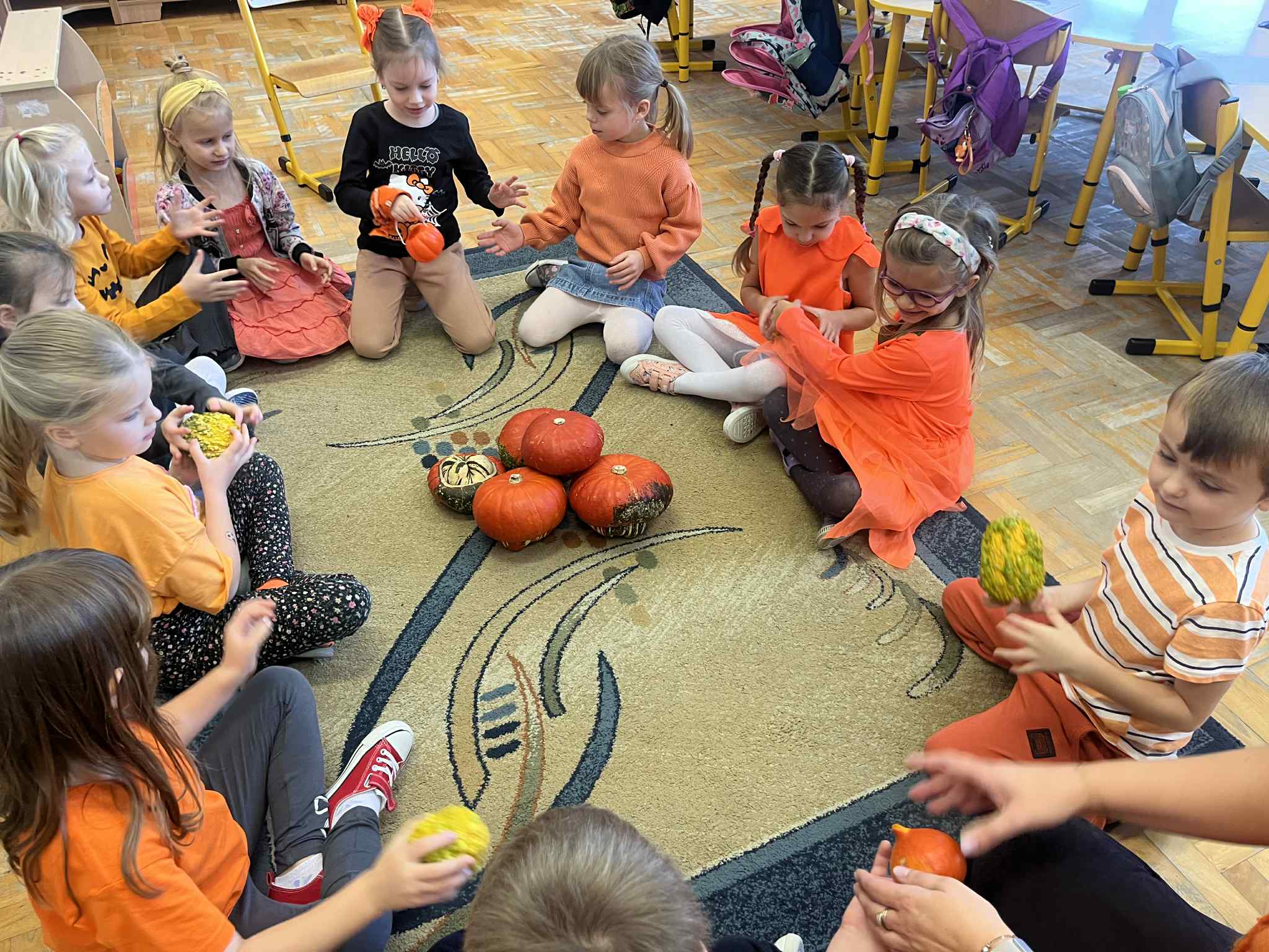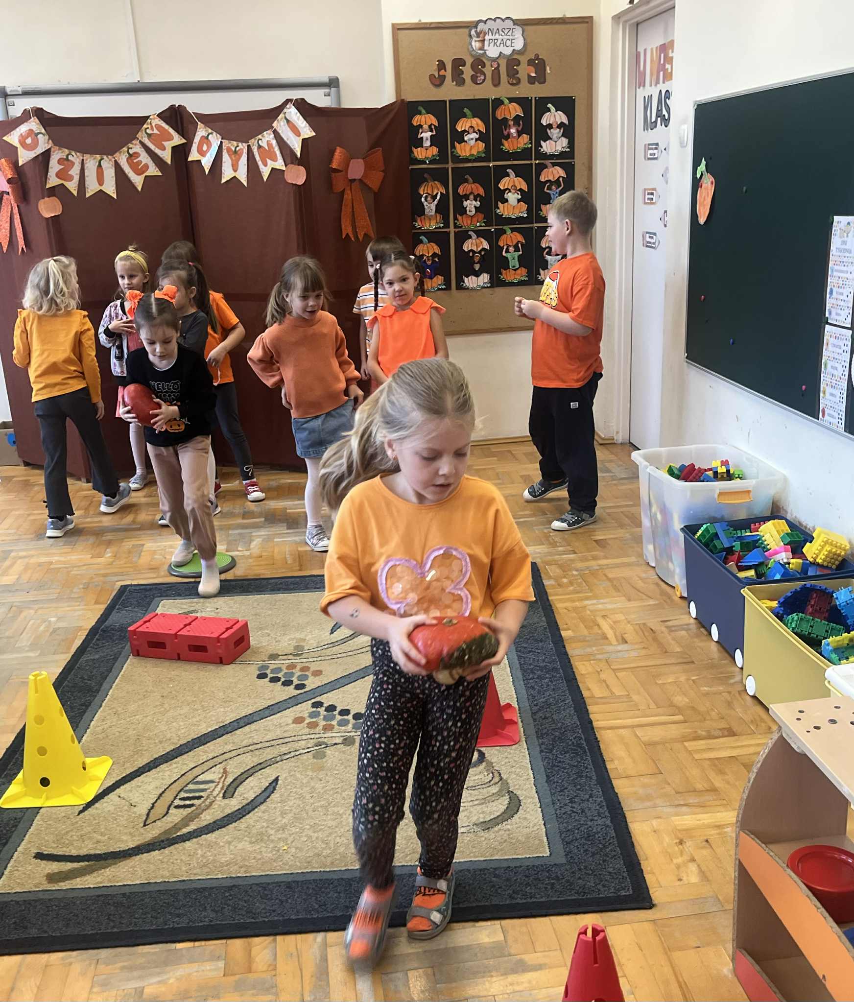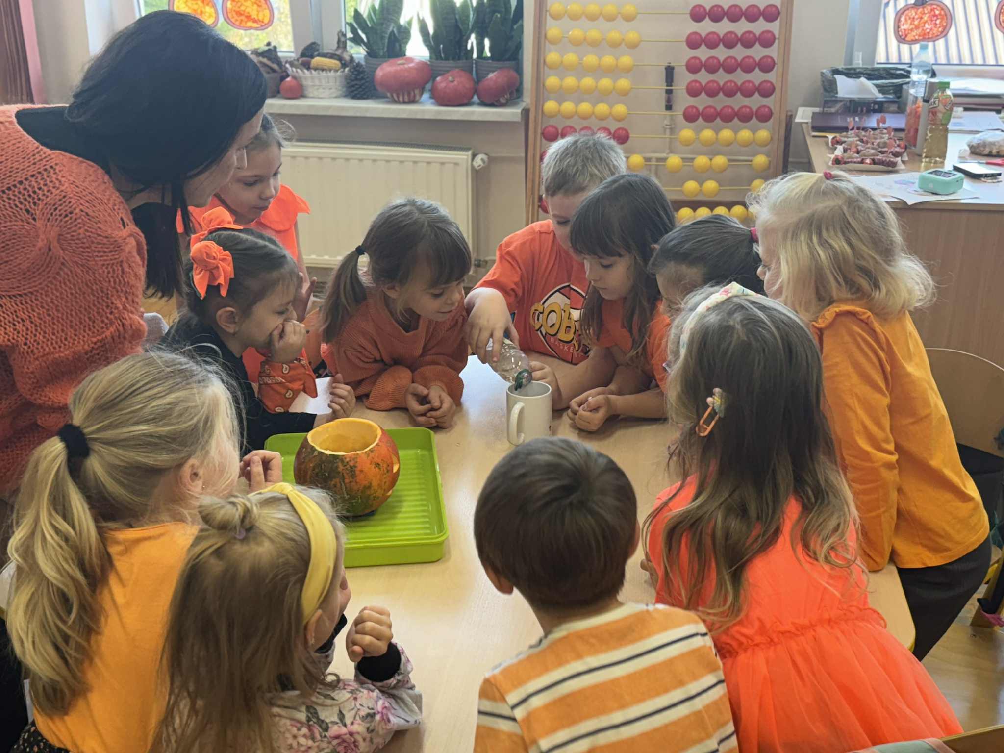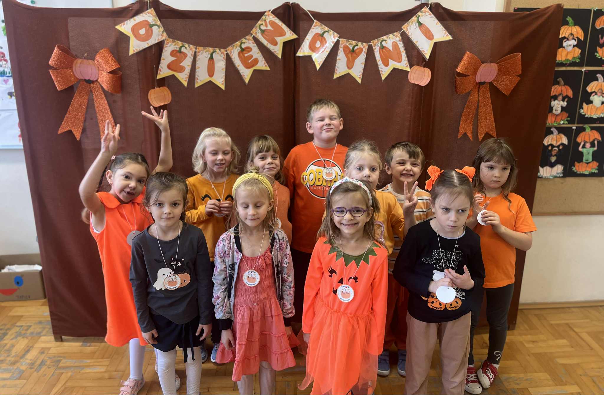 W naszej sali zrobiło się wyjątkowo pomarańczowo! Świętowaliśmy Dzień Dyni, czyli dzień pełen zabawy, nauki i smakowitych przygód. Dzieci przyszły ubrane w kolorach pomarańczowych, dzięki czemu sala wyglądała jak prawdziwe dyniowe pole. Na początek poznaliśmy różne odmiany dyń – duże, małe, okrągłe i podłużne. Dzieci miały okazję je dotknąć, porównać ciężar i kształty. Następnie rozpoczęły się dyniowe zabawy ruchowe – wesoły tor przeszkód z dyniami, który wymagał zręczności i równowagi, dostarczył mnóstwo śmiechu i emocji. Nie mogło zabraknąć prac plastycznych z dynią. Był też czas na odrobinę nauki! Podczas eksperymentu z dynią dzieci obserwowały, co się z nią dzieje. Wspólnie odkryliśmy dyniowe tajemnice i dowiedzieliśmy się, co kryje się w środku tego niezwykłego warzywa. Na zakończenie odbyła się degustacja muffinek dyniowych, które wszystkim bardzo smakowały. Było zdrowo, kolorowo i bardzo wesoło! To był naprawdę udany, pełen radości Dzień Dyni – święto, które przypomniało nam, że jesień też może być pełna barw, zapachów i smaków.