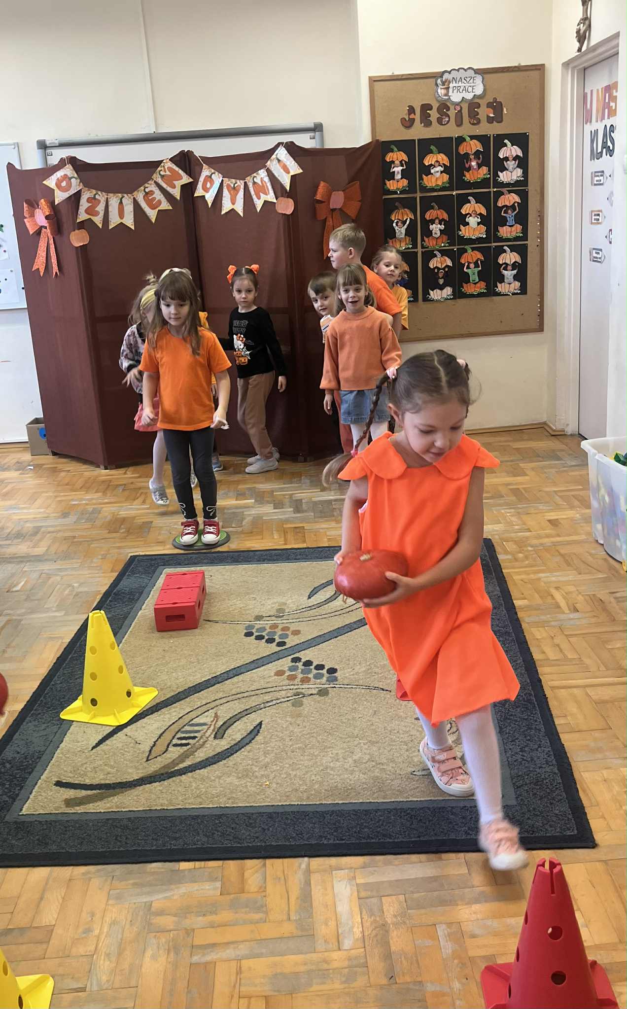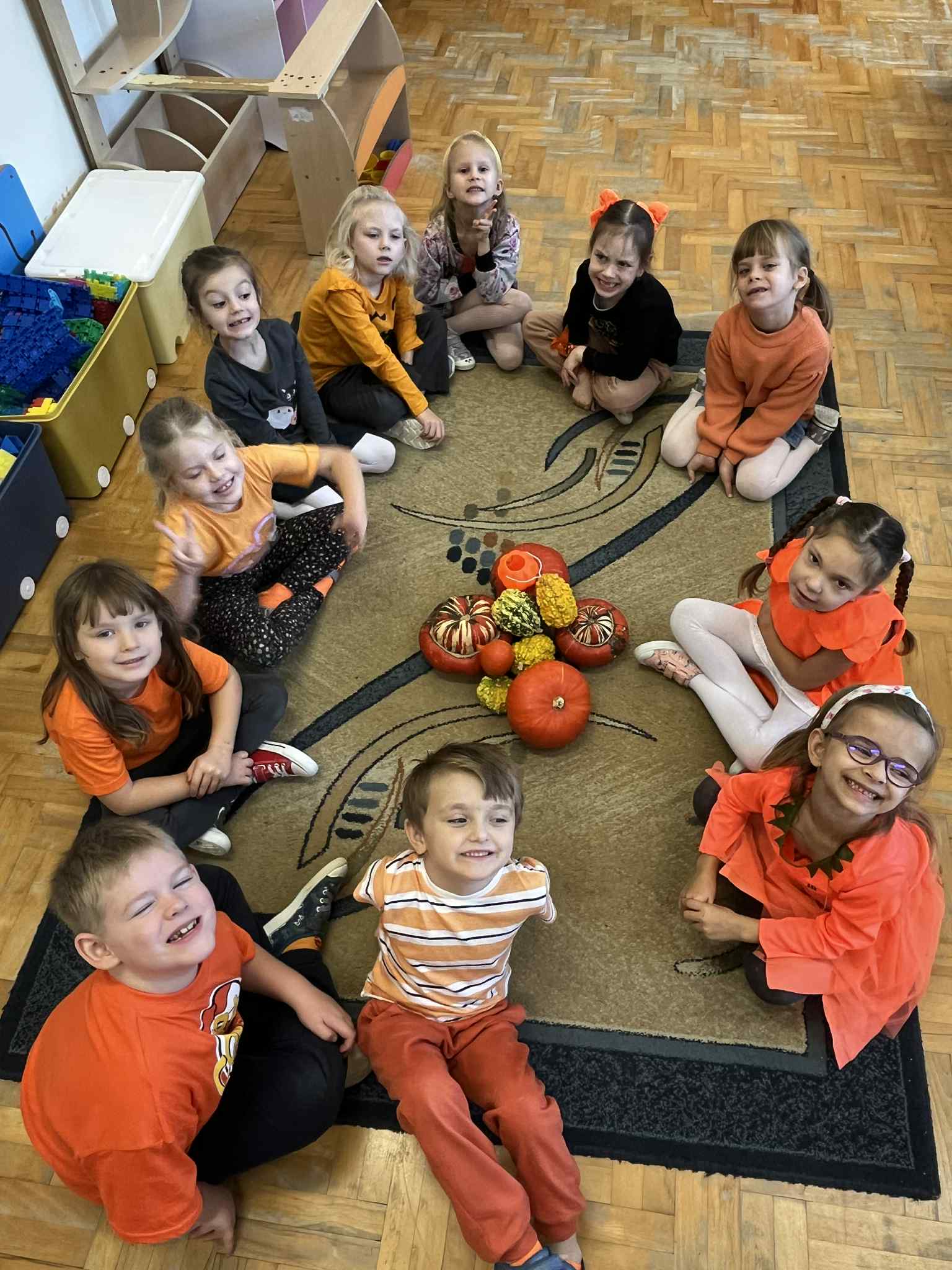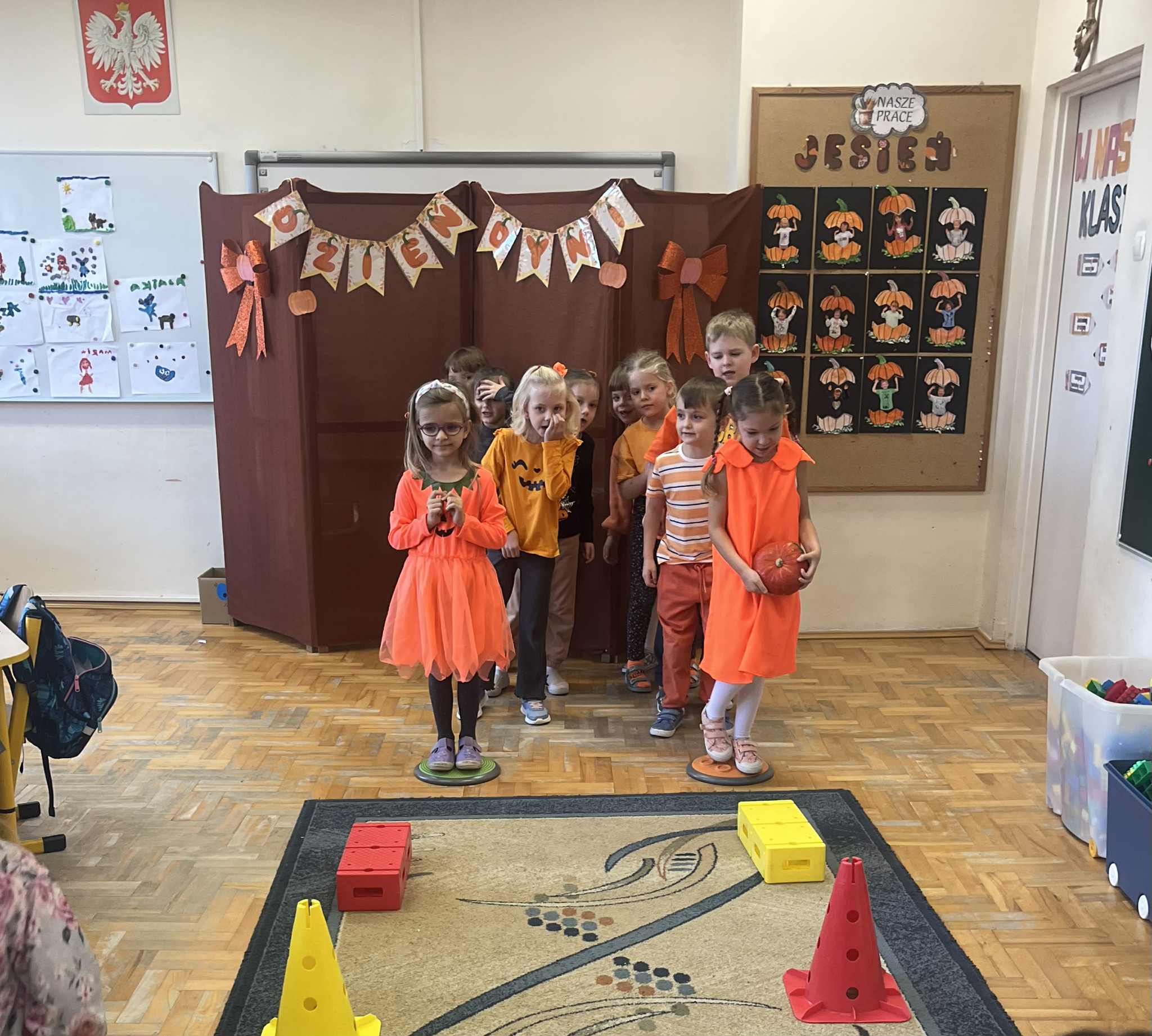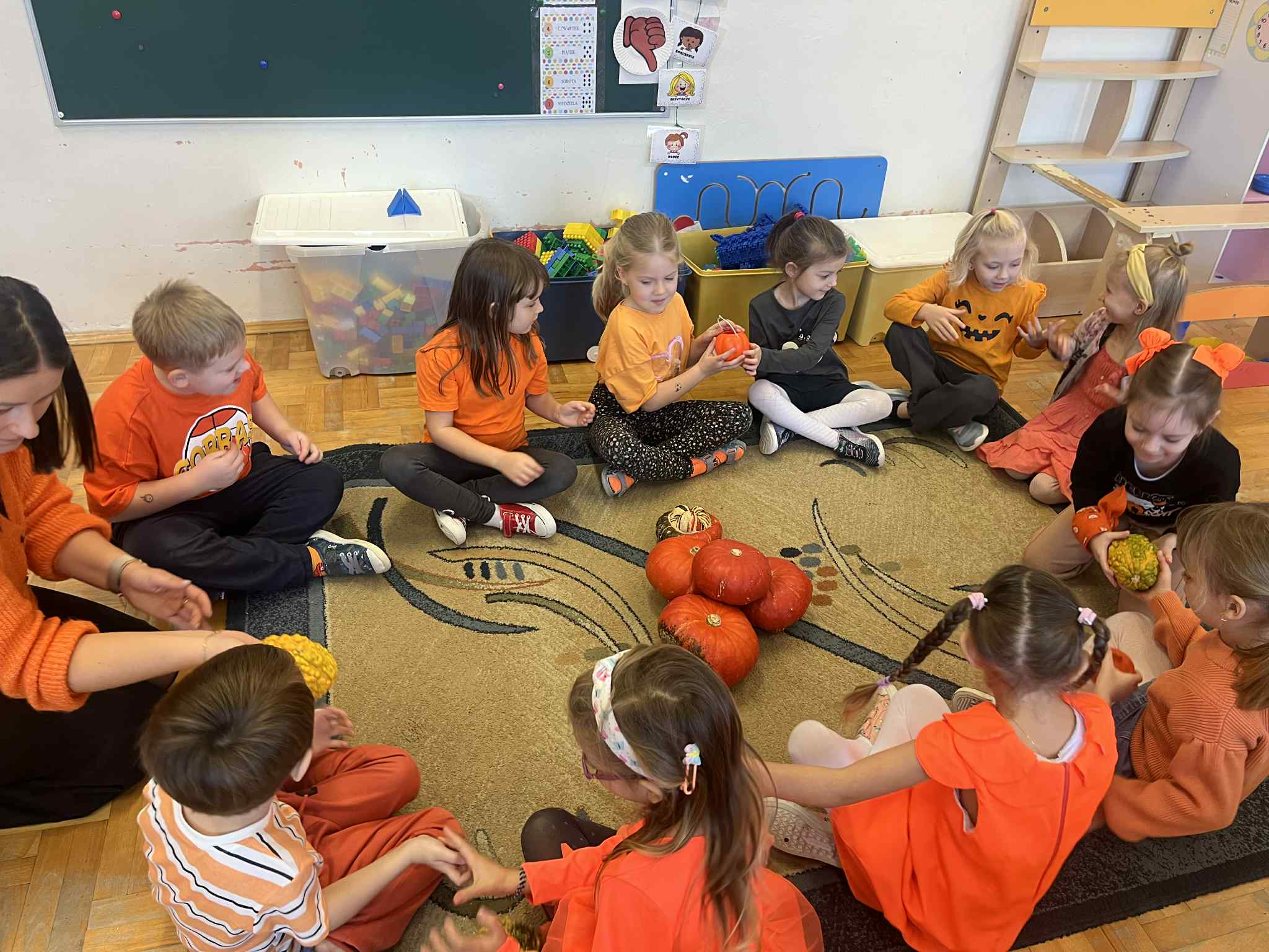 W naszej sali zrobiło się wyjątkowo pomarańczowo! Świętowaliśmy Dzień Dyni, czyli dzień pełen zabawy, nauki i smakowitych przygód. Dzieci przyszły ubrane w kolorach pomarańczowych, dzięki czemu sala wyglądała jak prawdziwe dyniowe pole. Na początek poznaliśmy różne odmiany dyń – duże, małe, okrągłe i podłużne. Dzieci miały okazję je dotknąć, porównać ciężar i kształty. Następnie rozpoczęły się dyniowe zabawy ruchowe – wesoły tor przeszkód z dyniami, który wymagał zręczności i równowagi, dostarczył mnóstwo śmiechu i emocji. Nie mogło zabraknąć prac plastycznych z dynią. Był też czas na odrobinę nauki! Podczas eksperymentu z dynią dzieci obserwowały, co się z nią dzieje. Wspólnie odkryliśmy dyniowe tajemnice i dowiedzieliśmy się, co kryje się w środku tego niezwykłego warzywa. Na zakończenie odbyła się degustacja muffinek dyniowych, które wszystkim bardzo smakowały. Było zdrowo, kolorowo i bardzo wesoło! To był naprawdę udany, pełen radości Dzień Dyni – święto, które przypomniało nam, że jesień też może być pełna barw, zapachów i smaków.