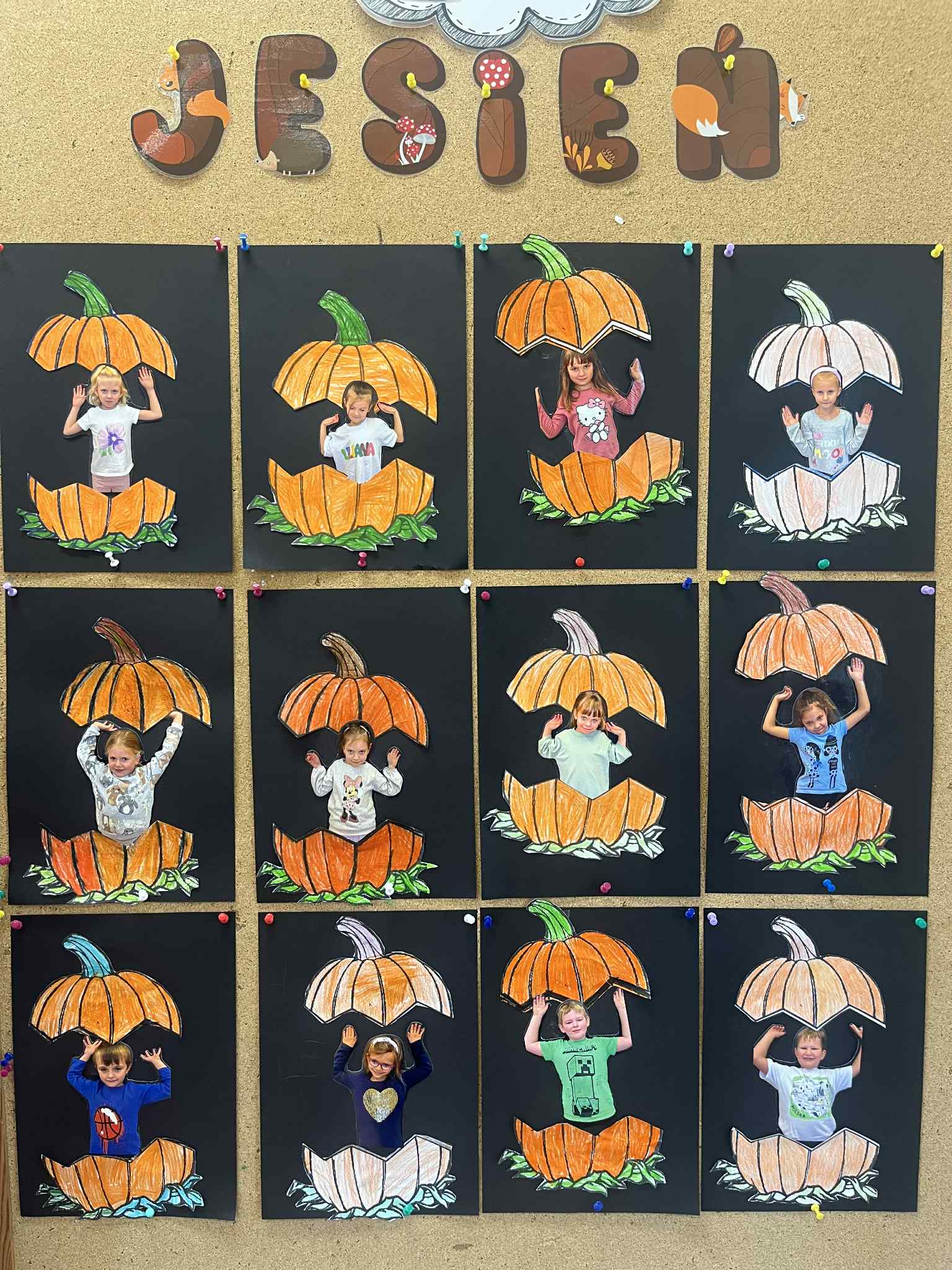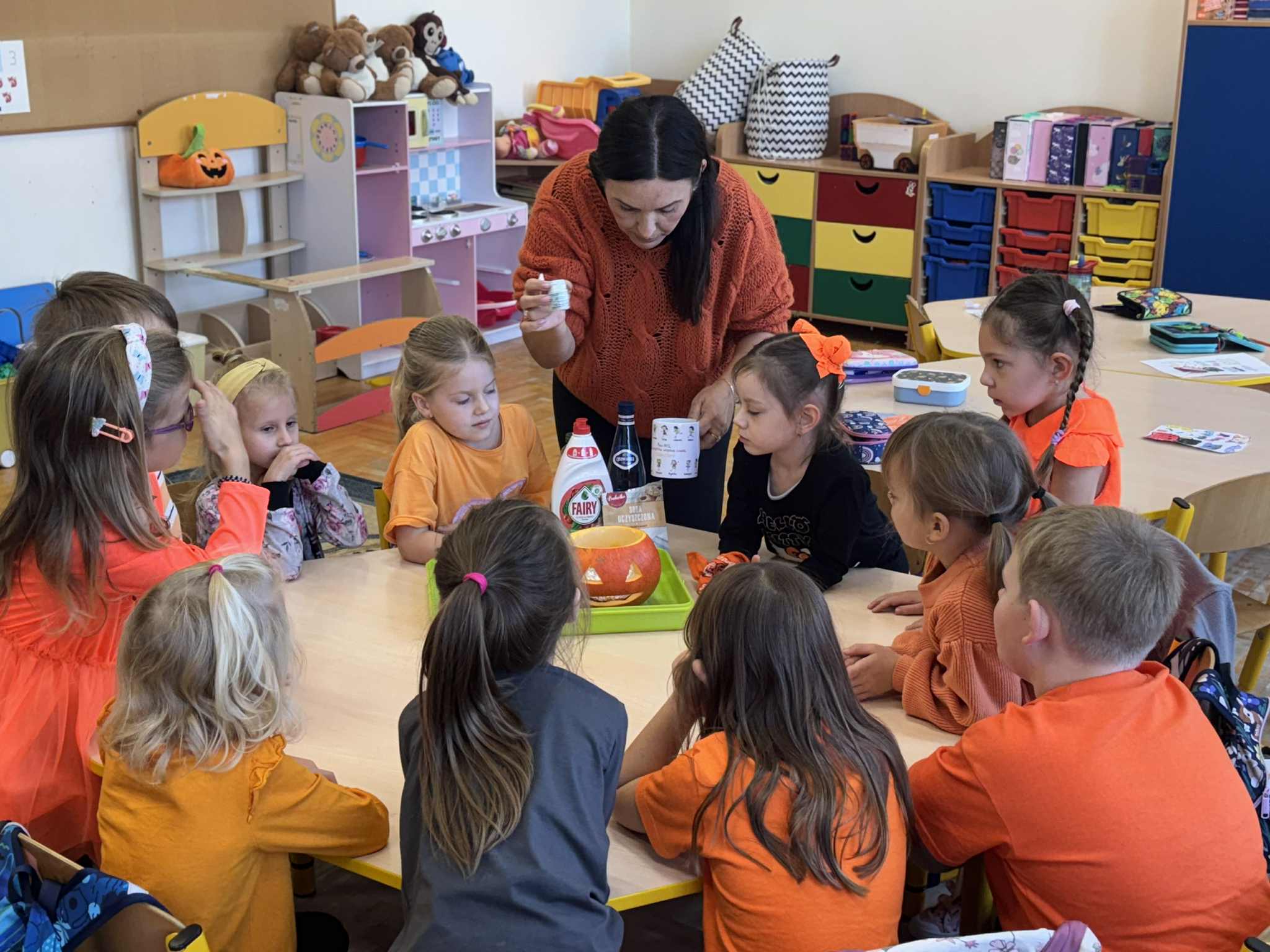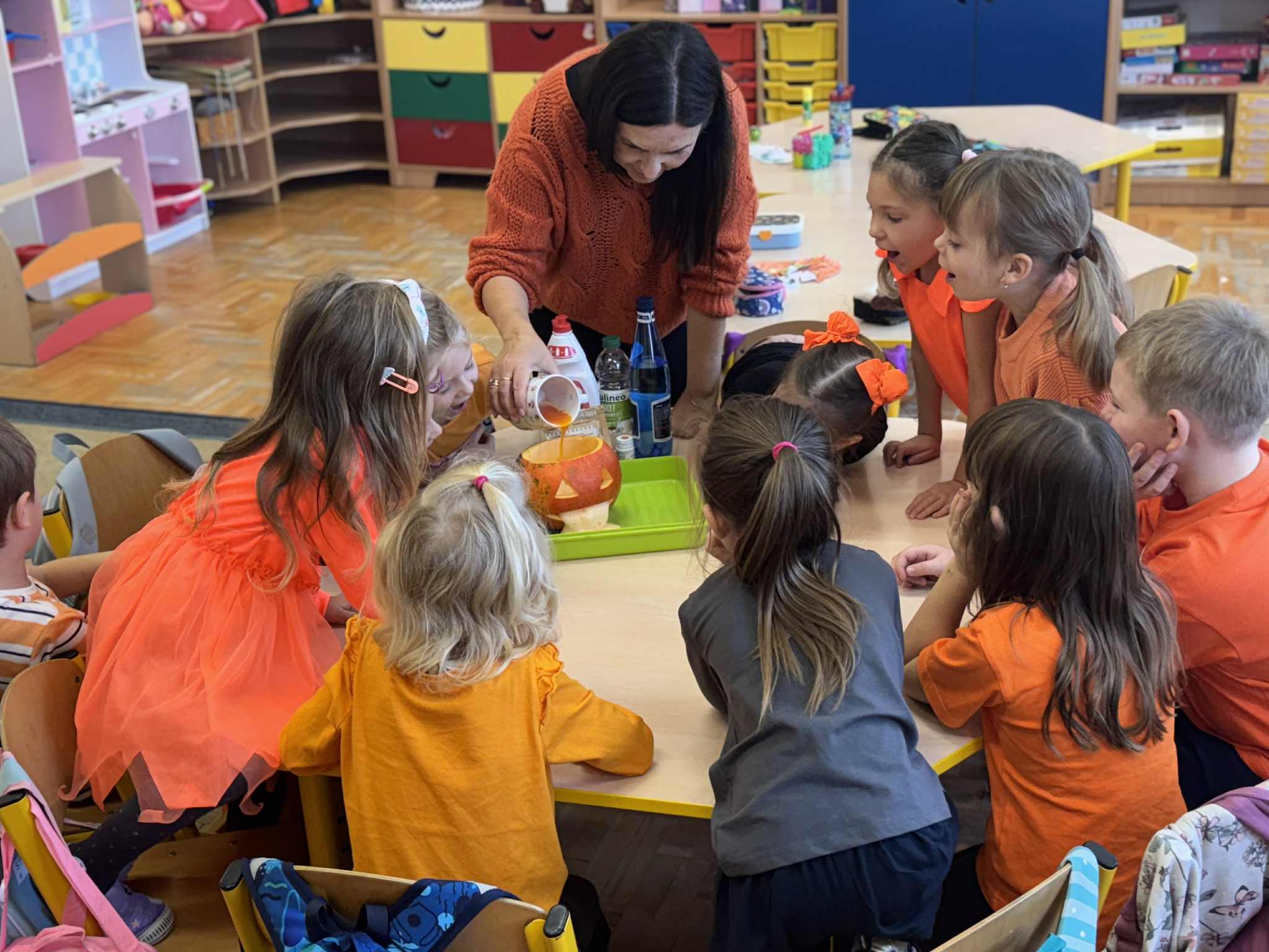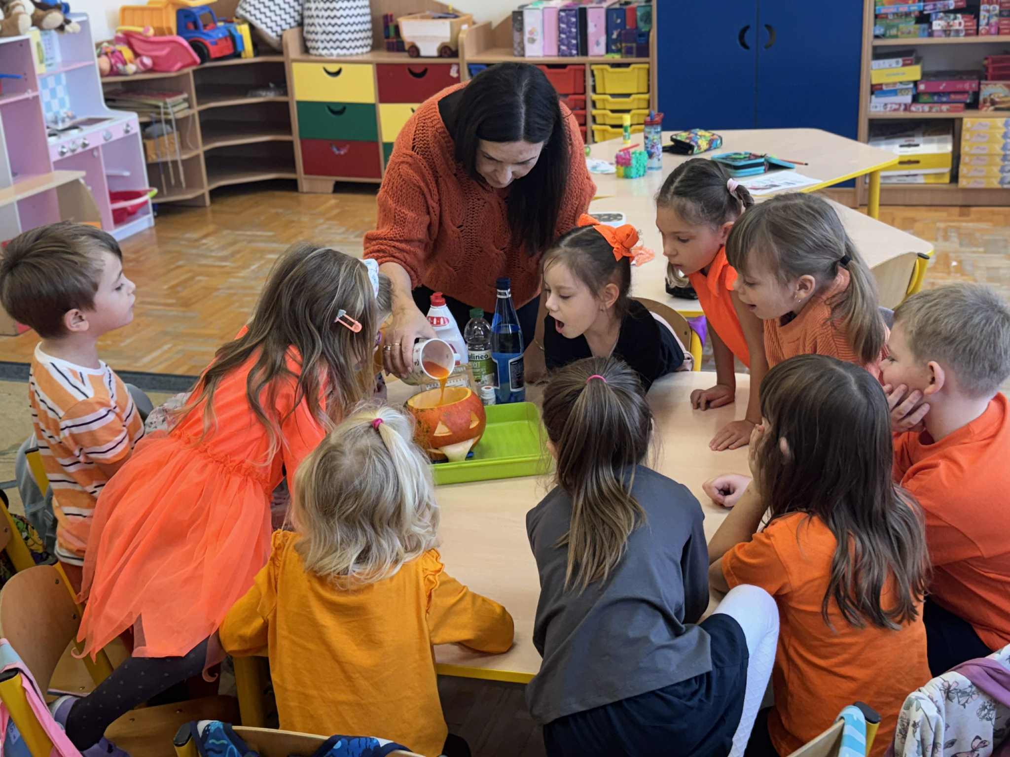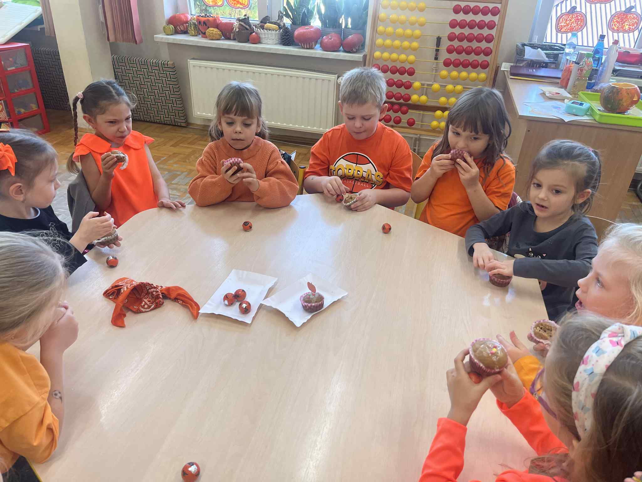 W naszej sali zrobiło się wyjątkowo pomarańczowo! Świętowaliśmy Dzień Dyni, czyli dzień pełen zabawy, nauki i smakowitych przygód. Dzieci przyszły ubrane w kolorach pomarańczowych, dzięki czemu sala wyglądała jak prawdziwe dyniowe pole. Na początek poznaliśmy różne odmiany dyń – duże, małe, okrągłe i podłużne. Dzieci miały okazję je dotknąć, porównać ciężar i kształty. Następnie rozpoczęły się dyniowe zabawy ruchowe – wesoły tor przeszkód z dyniami, który wymagał zręczności i równowagi, dostarczył mnóstwo śmiechu i emocji. Nie mogło zabraknąć prac plastycznych z dynią. Był też czas na odrobinę nauki! Podczas eksperymentu z dynią dzieci obserwowały, co się z nią dzieje. Wspólnie odkryliśmy dyniowe tajemnice i dowiedzieliśmy się, co kryje się w środku tego niezwykłego warzywa. Na zakończenie odbyła się degustacja muffinek dyniowych, które wszystkim bardzo smakowały. Było zdrowo, kolorowo i bardzo wesoło! To był naprawdę udany, pełen radości Dzień Dyni – święto, które przypomniało nam, że jesień też może być pełna barw, zapachów i smaków.