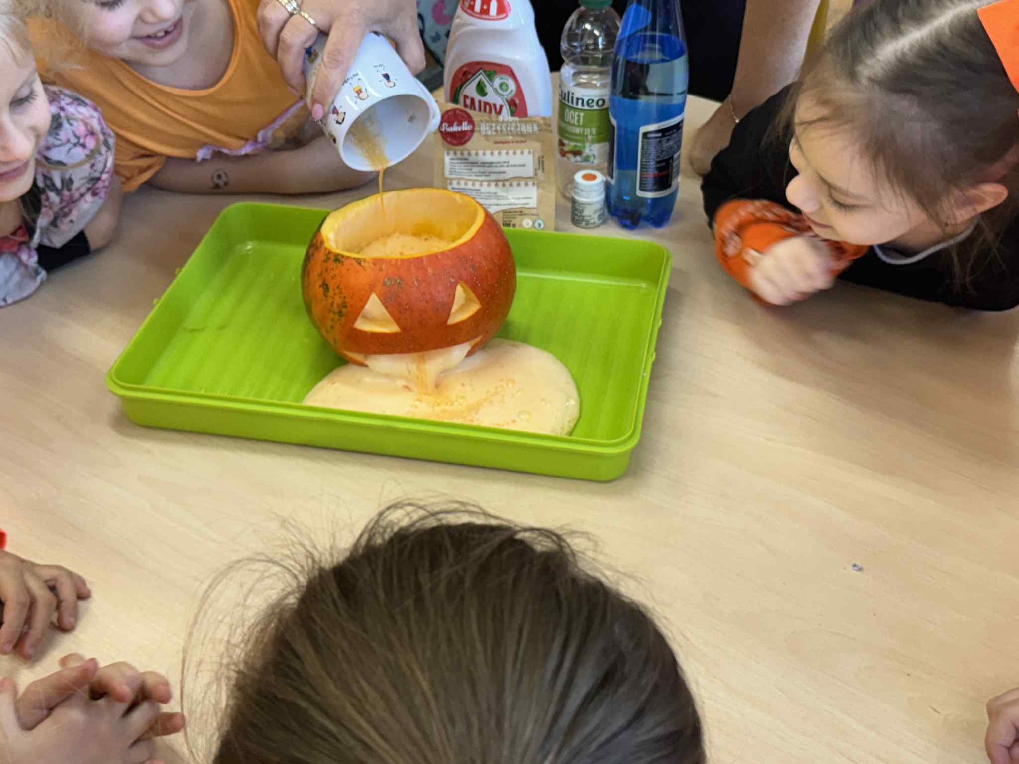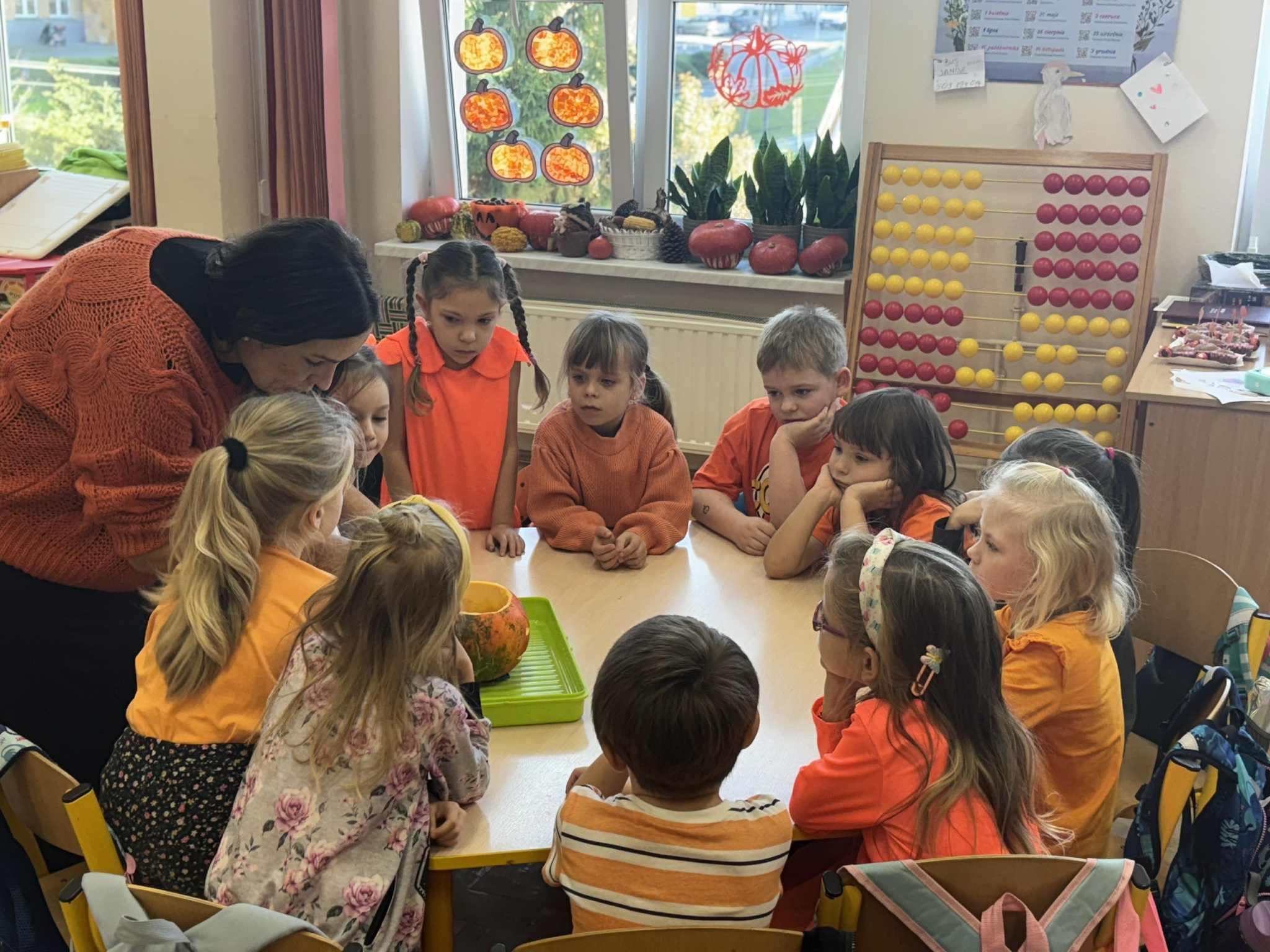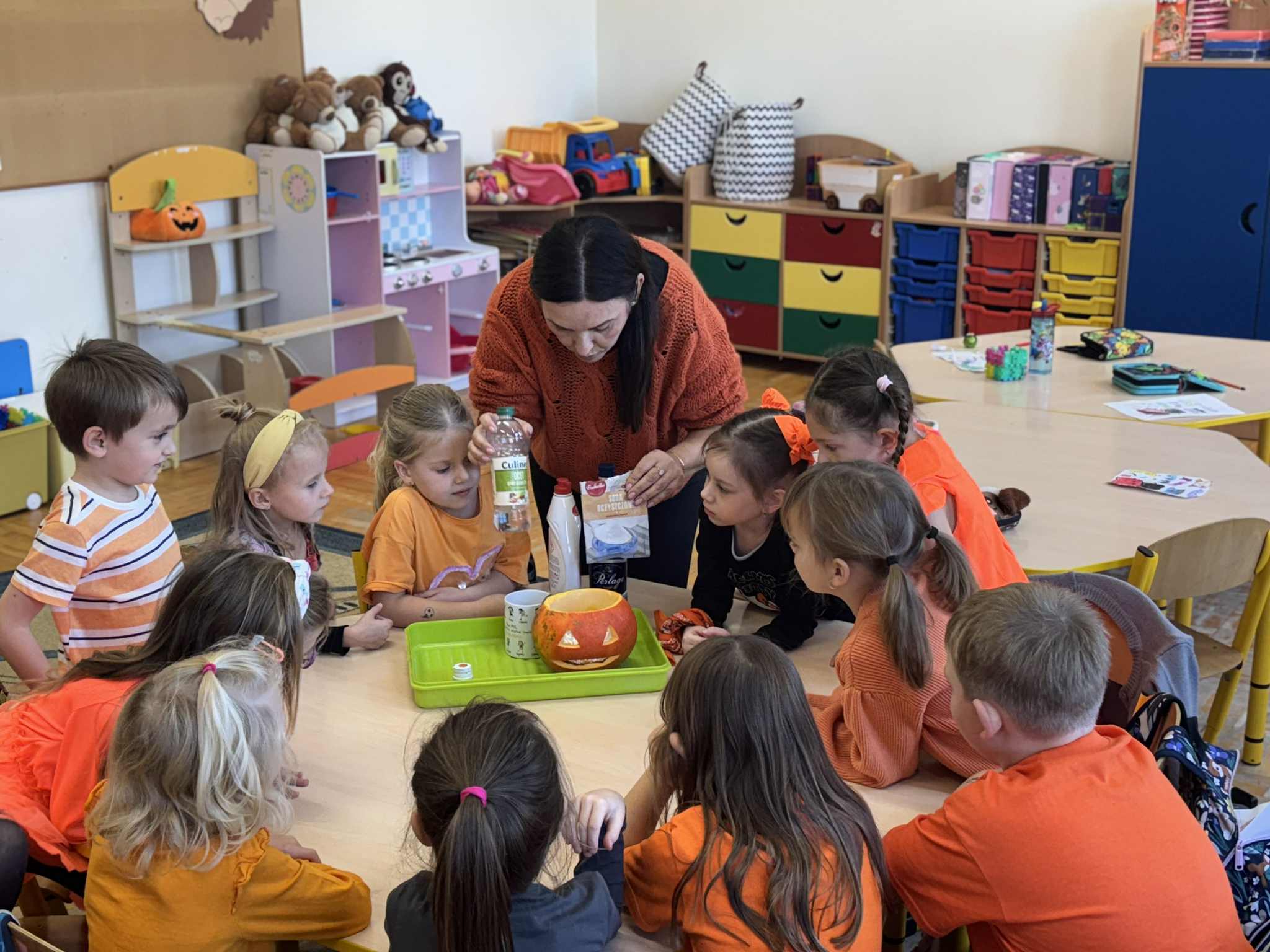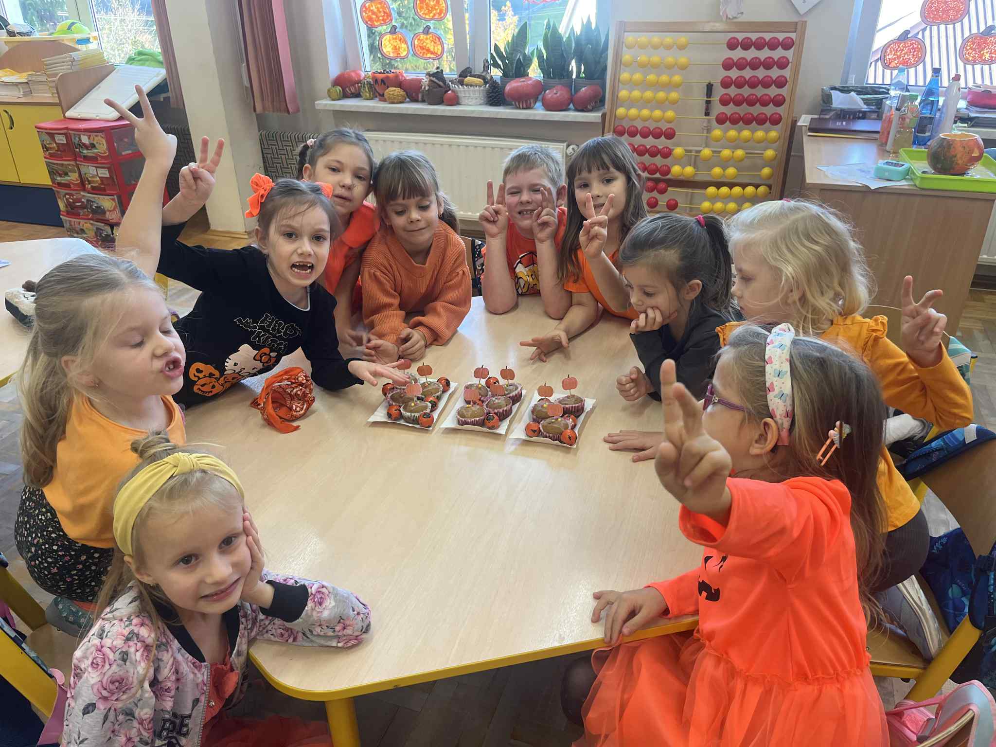 W naszej sali zrobiło się wyjątkowo pomarańczowo! Świętowaliśmy Dzień Dyni, czyli dzień pełen zabawy, nauki i smakowitych przygód. Dzieci przyszły ubrane w kolorach pomarańczowych, dzięki czemu sala wyglądała jak prawdziwe dyniowe pole. Na początek poznaliśmy różne odmiany dyń – duże, małe, okrągłe i podłużne. Dzieci miały okazję je dotknąć, porównać ciężar i kształty. Następnie rozpoczęły się dyniowe zabawy ruchowe – wesoły tor przeszkód z dyniami, który wymagał zręczności i równowagi, dostarczył mnóstwo śmiechu i emocji. Nie mogło zabraknąć prac plastycznych z dynią. Był też czas na odrobinę nauki! Podczas eksperymentu z dynią dzieci obserwowały, co się z nią dzieje. Wspólnie odkryliśmy dyniowe tajemnice i dowiedzieliśmy się, co kryje się w środku tego niezwykłego warzywa. Na zakończenie odbyła się degustacja muffinek dyniowych, które wszystkim bardzo smakowały. Było zdrowo, kolorowo i bardzo wesoło! To był naprawdę udany, pełen radości Dzień Dyni – święto, które przypomniało nam, że jesień też może być pełna barw, zapachów i smaków.