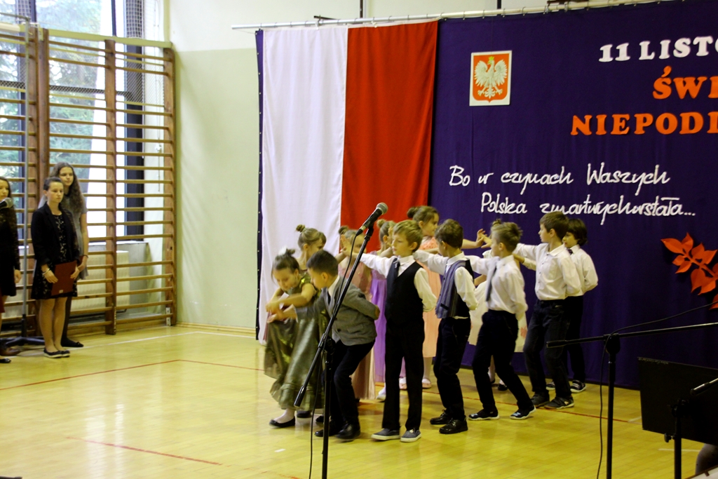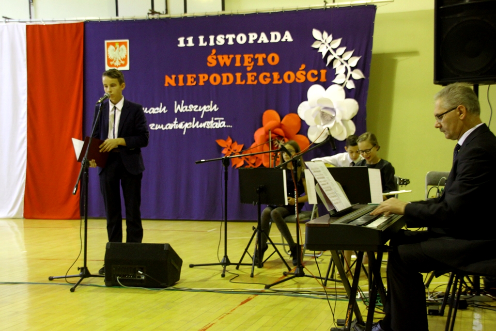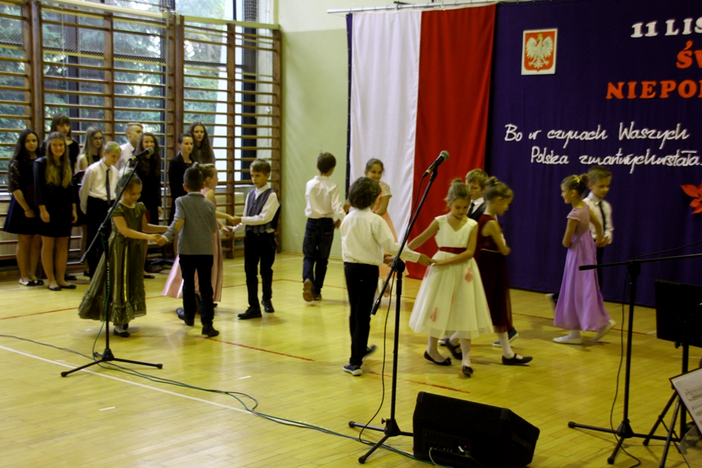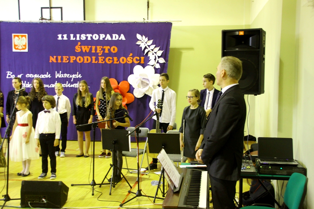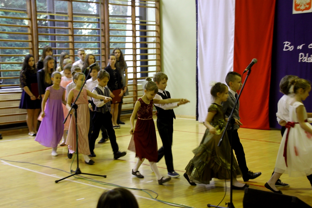 Goście przybyli na uroczystość zostali podjęci grochówką- wojskową, chociaż ugotowaną w naszej szkolnej kuchni, następnie wszystkich zgromadzonych powitał dyrektor Dębińskiego Centrum Kultury, pan Włodzimierz Gurgul. W końcu, po wypełnionym obowiązku wobec Poległych i uczcie dla ciała, przyszedł czas na ucztę dla ducha. I tutaj uczniowie Zespołu Szkolno-Przedszkolnego pod opieką i przewodnictwem dyrektora, pana Artura Potępy, jak zawsze stanęli na wysokości zadania. Montaż słowno-muzyczny, z wzruszającymi recytacjami, patriotycznymi piosenkami pięknie śpiewanymi i granymi „na żywo” oraz „Gwóźdź” programu – Polonez w wykonaniu dzieci z klasy III zasłużyły na gromkie brawa