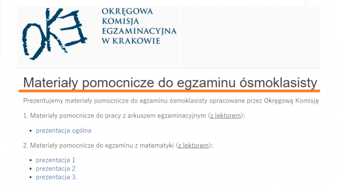 Aktualności Egzamin ósmoklasisty – materiały pomocnicze 4 czerwca 2020 admin Dodaj komentarz Materiały pomocnicze do egzaminu ósmoklasisty opracowane przez Okręgową Komisję Egzaminacyjną w Krakowie: http://www.oke.krakow.pl/inf/staticpages/index.php?page=20200529150446582