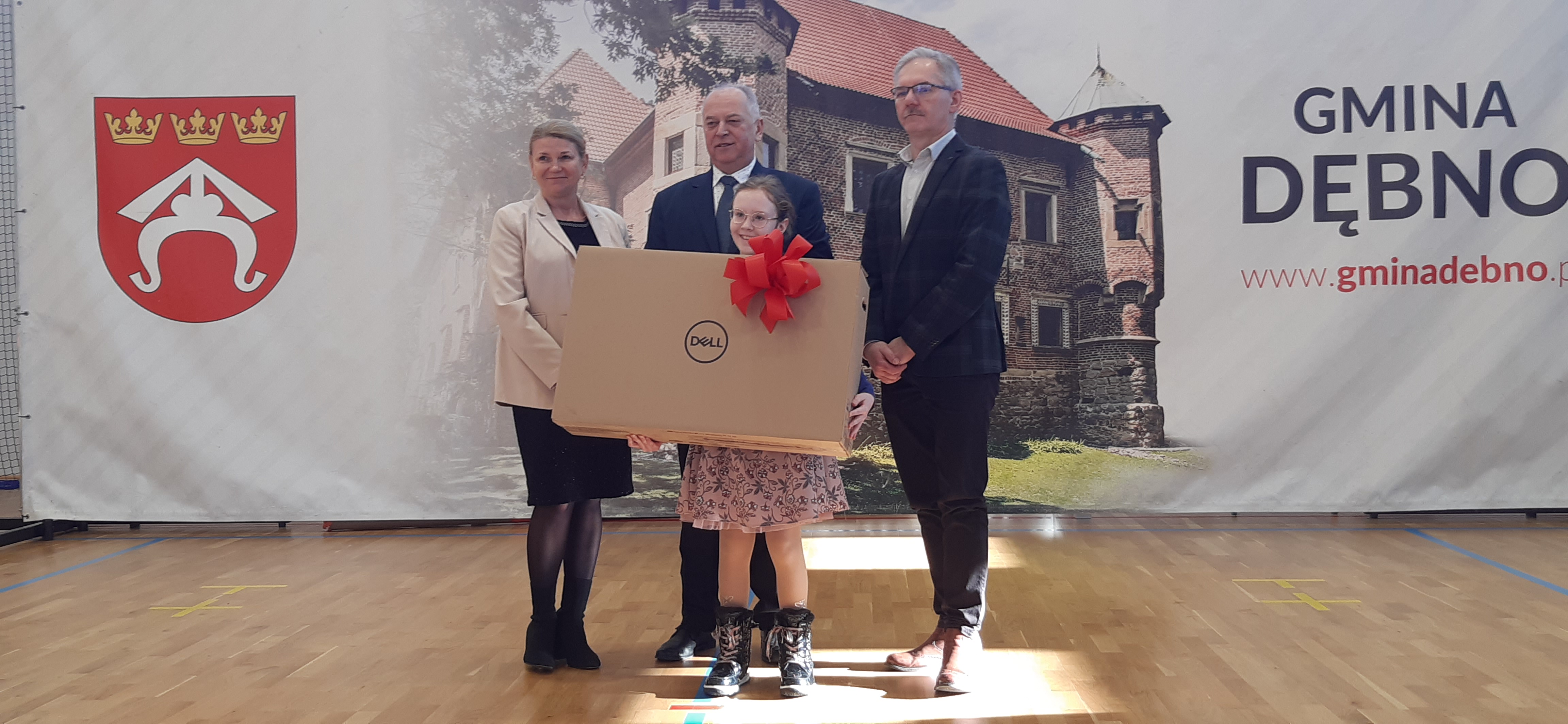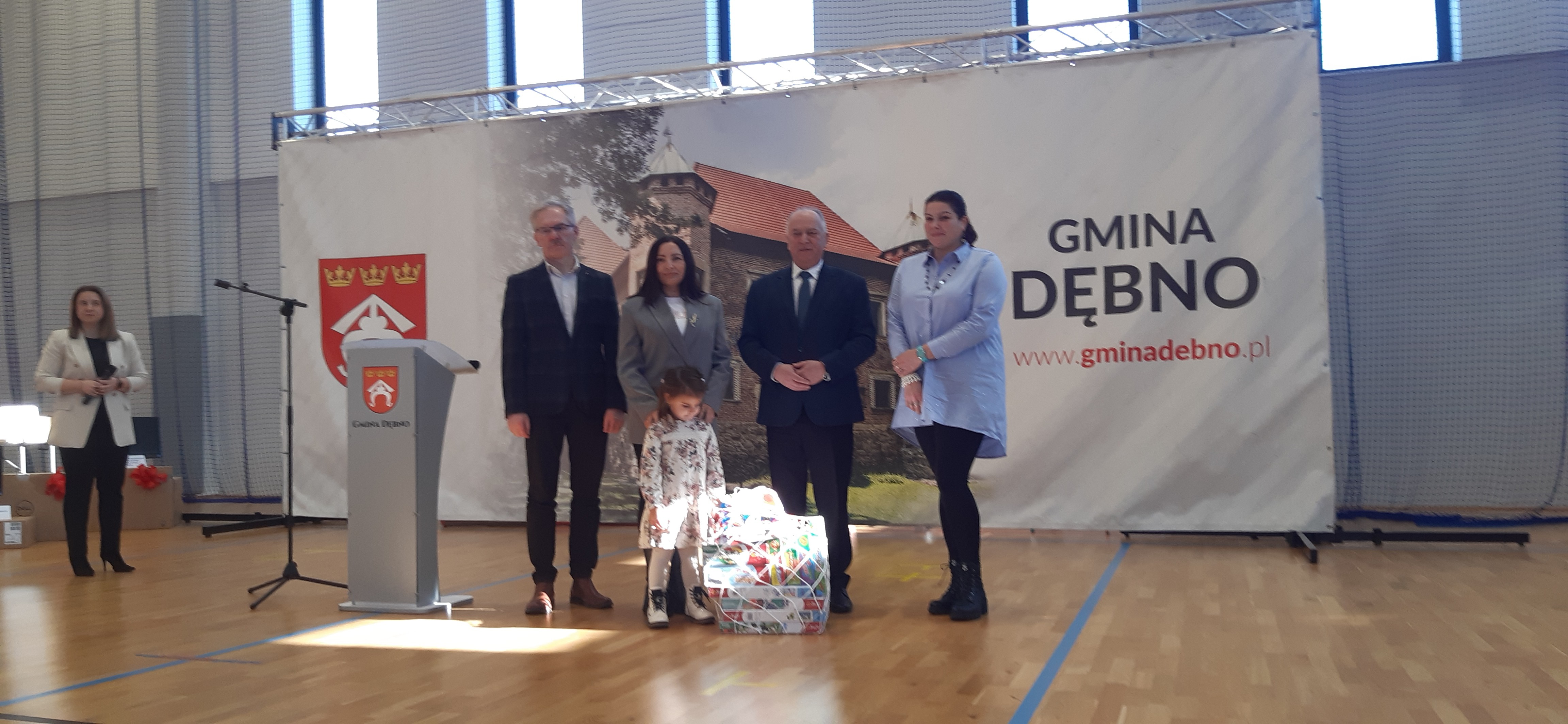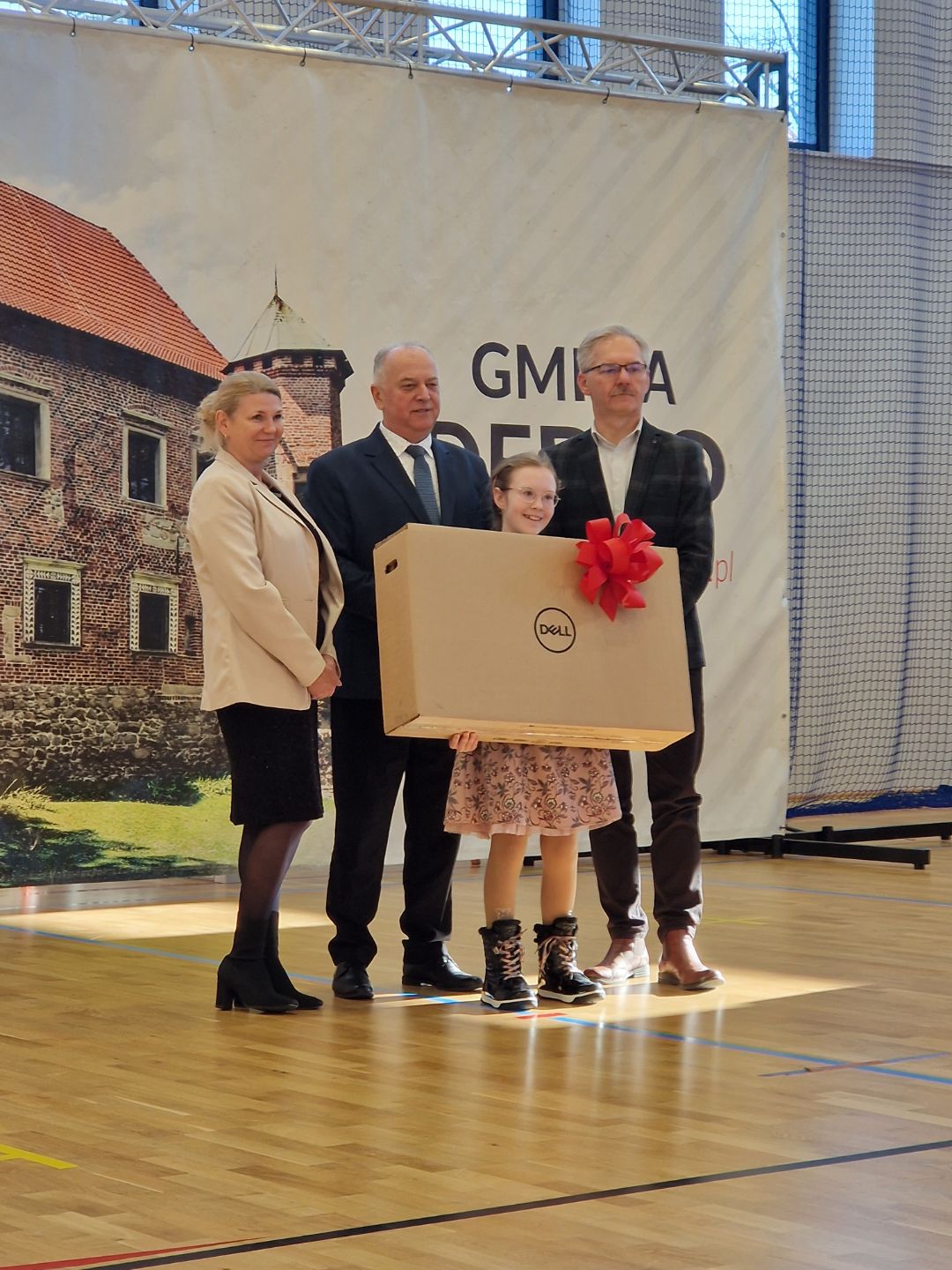 Finał tegorocznego Gminnego Konkursu Ekologicznego “Miej zasady – segreguj odpady” odbył się 17 stycznia br. na Hali Widowiskowo-Sportowej w Dębnie, w trakcie którego Wójt Gminy Dębno, pan Wiesław Kozłowski uroczyście wręczył nagrody na ręce dyrektorów, nauczycieli, uczniów i ich rodziców zwycięskim szkołom. Zadania konkursowe podzielone były na 4 kategorie wiekowe. W pierwszej, skierowanej do przedszkoli, należało wykonać ECO-ROBOTA. Nasze przedszkole uzyskało w tej kategorii wyróżnienie, a nagrodzeni zostaliśmy zestawami zabawek oraz nowoczesną tablicą multimedialną. Kolejna kategoria, dla klas I – III, miała być inspirowana bajką ekologiczną dotyczącą segregacji śmieci. Natomiast, dla klas IV – VI, zadanie dotyczyło stworzenia ekostroju, z wykorzystaniem materiałów recyklingowych. Nasza szkoła zajęła tu III miejsce – uczniowie, wykonali kreację damską z praktycznymi dodatkami garderoby. Nagrodą było obdarowanie nas 5 nowoczesnymi komputerami, które pomogą w doskonaleniu kompetencji cyfrowych. Ostatnia kategoria, dla klas VII – VIII, polegała na stworzeniu trójwymiarowej makiety Ekologicznego Miasta Przyszłości. Więcej o konkursie można przeczytać i obejrzeć na stronie UG Dębno: https://gminadebno.pl/news-general,rozdanie-nagrod-w-gminnym-konkursie-ekologicznym,6675.html