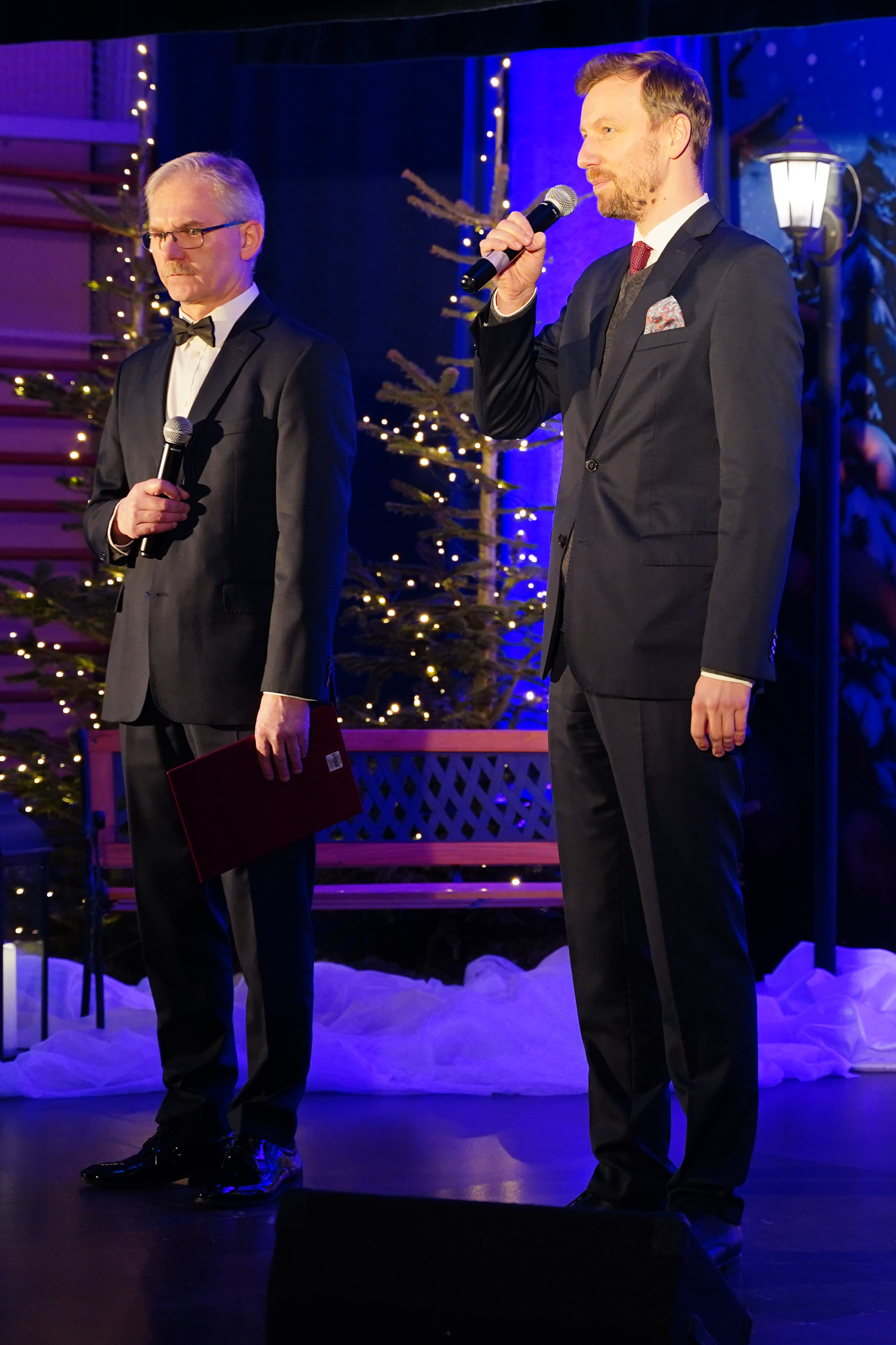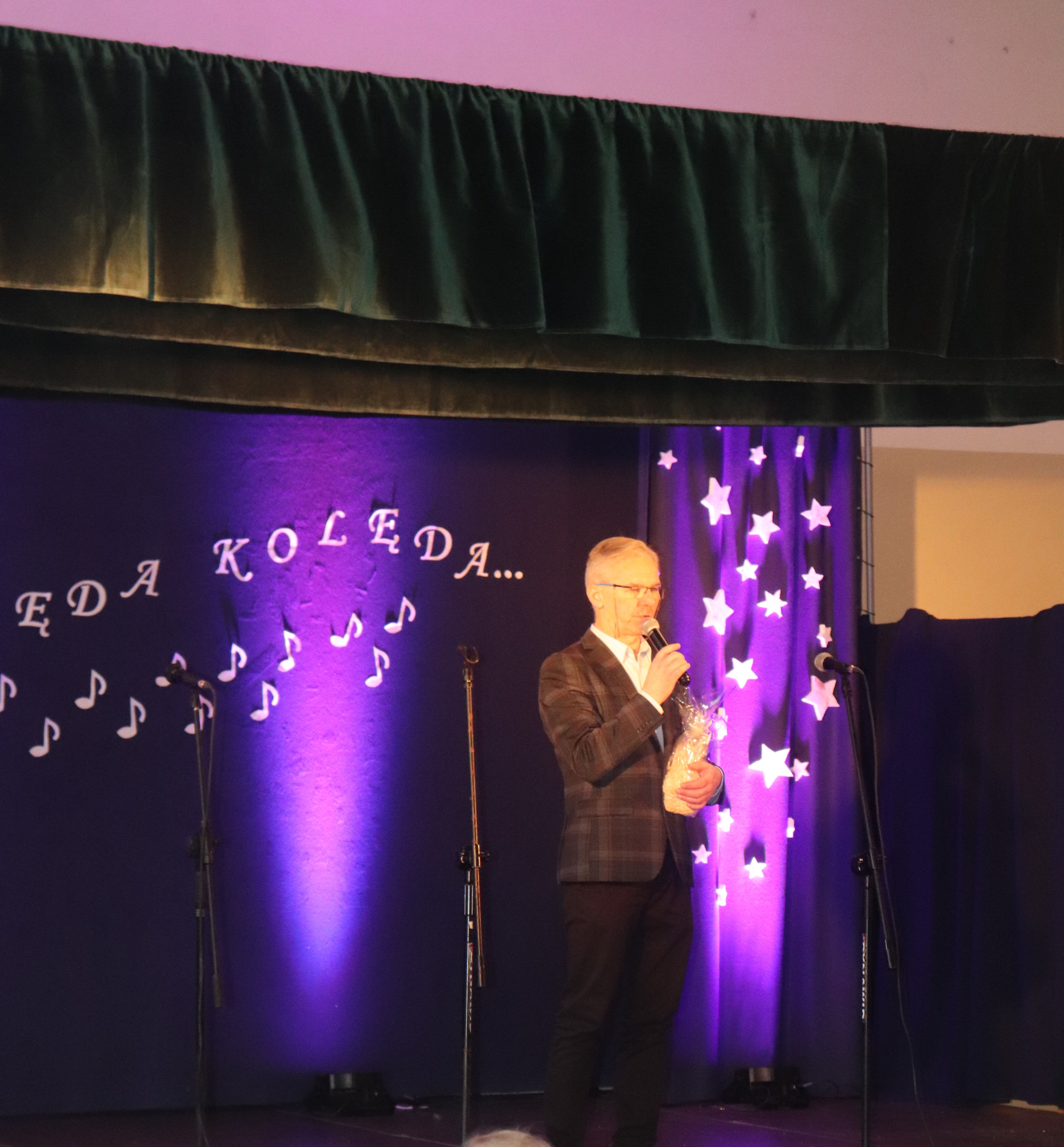 Podziękowania wszystkim zaangażowanym w organizację Konkursu złożył również pan dyrektor Artur Potępa; nie sposób wymienić wszystkich pracowników Placówki z imienia i nazwiska, bo naprawdę mogliśmy liczyć na wszelką pomoc, a pracy było sporo- od aranżacji scenografii, poprzez strojenie, oprawianie choinek, wieszanie, podwieszanie, przypinanie i sprzątanie, więc ukłony i serdeczności należą się wszystkim. Jednak bez udziału niektórych- w szczególności pana dyrektora Artura Potępy, który poza wszystkim innym czuwał nad nagłośnieniem i oświetleniem, pań Bożeny Czajkowskiej- Bugaj i Anety Sowy, które włożyły mnóstwo pracy i zaangażowania w przygotowanie scenografii, pani Renaty Wis, która pomagała przy napisaniu scenariusza konferansjerów, wreszcie pani Aleksandry Tyrkiel, która przygotowała prezentację multimedialną, akcentującą Laureatów Koncertu, trudno wyobrazić sobie jubileuszową galę.