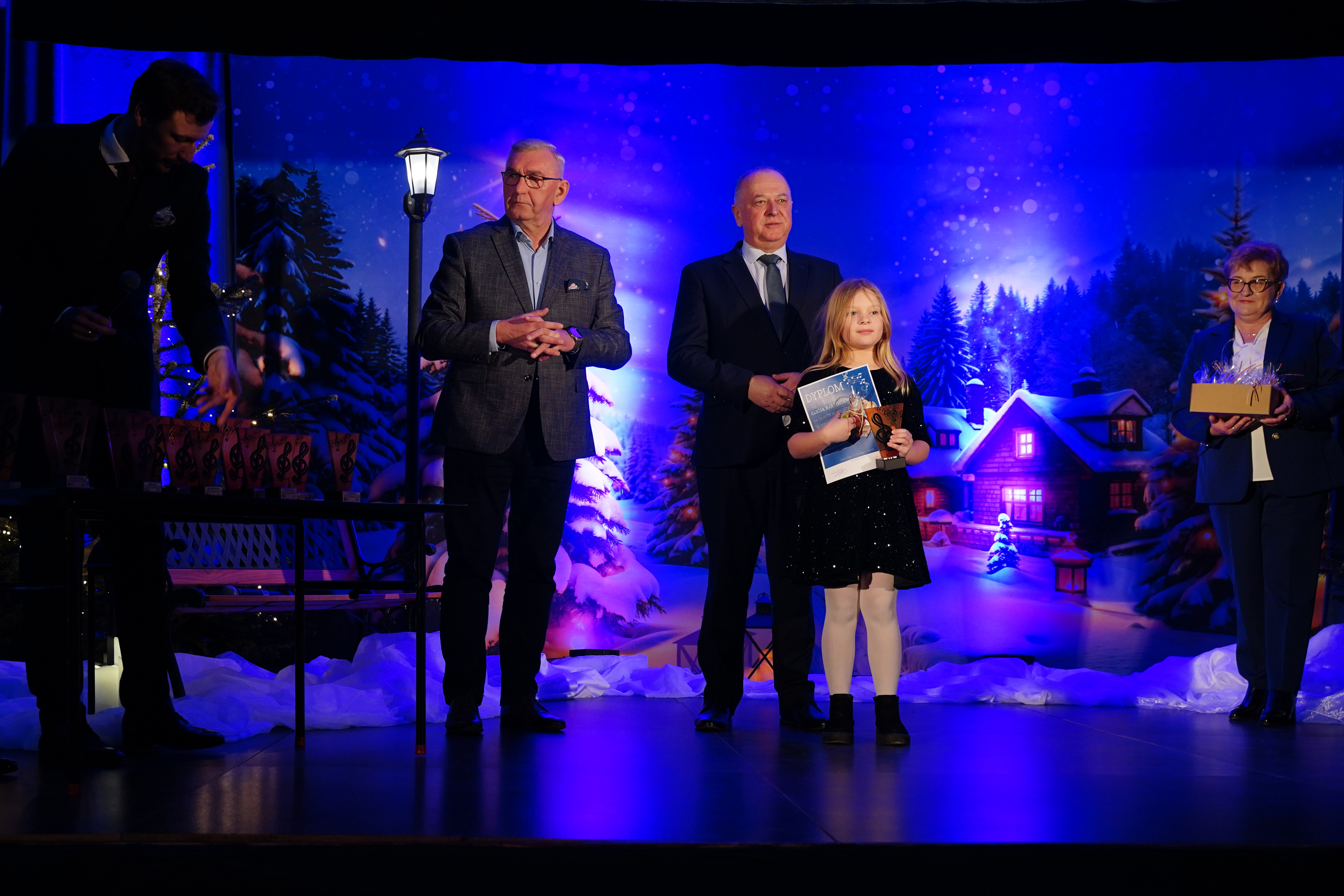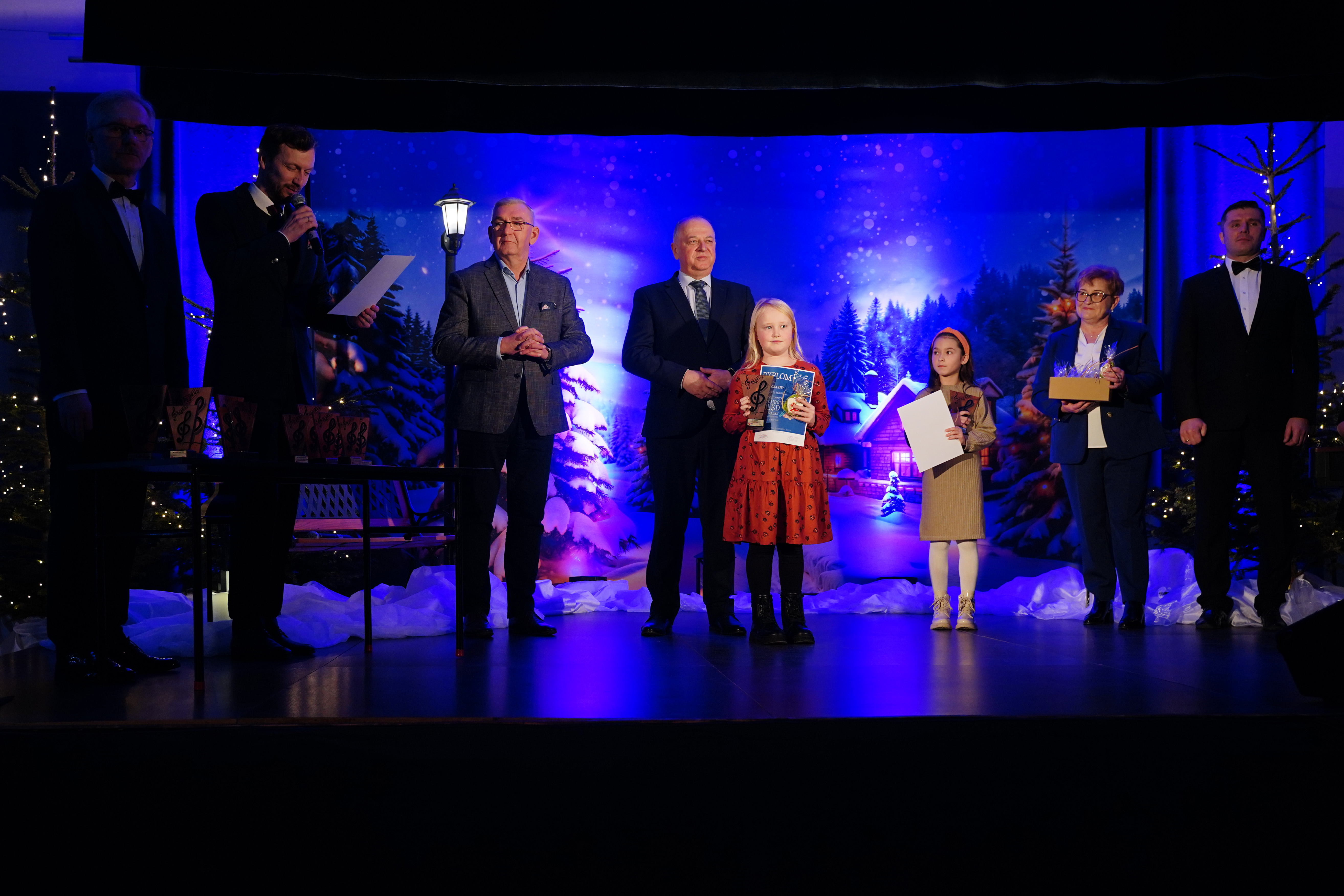 Oprócz wyjątkowo lirycznych w tym roku kolęd i pastorałek popłynęły ze sceny także wspomnienia, a przez te 25 lat nazbierało się ich niemało. Było więc lirycznie, muzycznie, magicznie i wzruszająco. Niestety czas w dobrym towarzystwie i w wyjątkowych okolicznościach biegnie jakby szybciej, więc i ostatnia nuta Koncertu w końcu wybrzmiała. Przyszedł czas na wręczenie Laureatom pamiątkowych dyplomów i statuetek ufundowanych przez wójta Gminy Dębno, pana Wiesława Kozłowskiego. Laureaci otrzymali je z rąk pana wójta oraz starosty Powiatu Brzeskiego, pana Andrzeja Potępy. Panowie, korzystając z okazji, złożyli zebranym życzenia noworoczne oraz podziękowania za wiele lat wspólnych wzruszeń. Oczywiście znalazła się chwila dla fotoreporterów – serdecznie dziękujemy panu Krzysztofowi Gałkowi za urokliwe zdjęcia, które będą piękną pamiątką z Jubileuszu. Wspaniałą niespodziankę sprawiła wszystkim sołtys wsi Łysa Góra, pani Bożena Sacha, wręczając i Laureatom, i organizatorom anielskie upominki . Na tym nie koniec! Pan Piotr Matura- tego wieczoru w roli konferansjera, ale na co dzień Przewodniczący Rady Gminy Dębno, z okazji Jubileuszu wręczył panu Dyrektorowi bon na zakup książek do szkolnej biblioteki na kwotę 500 złotych. Serdecznie dziękujemy!