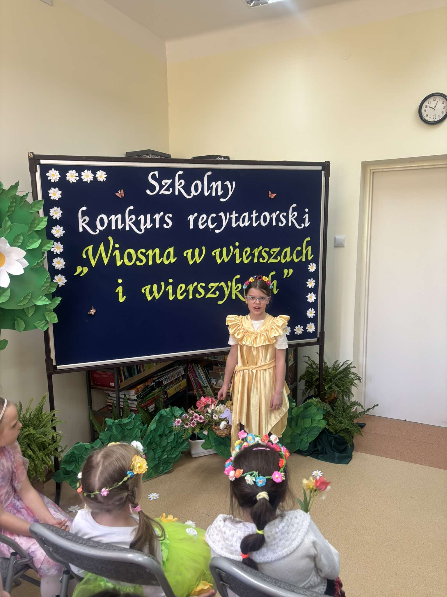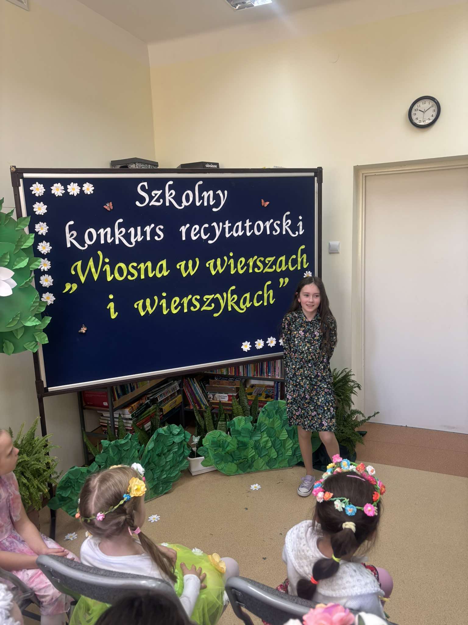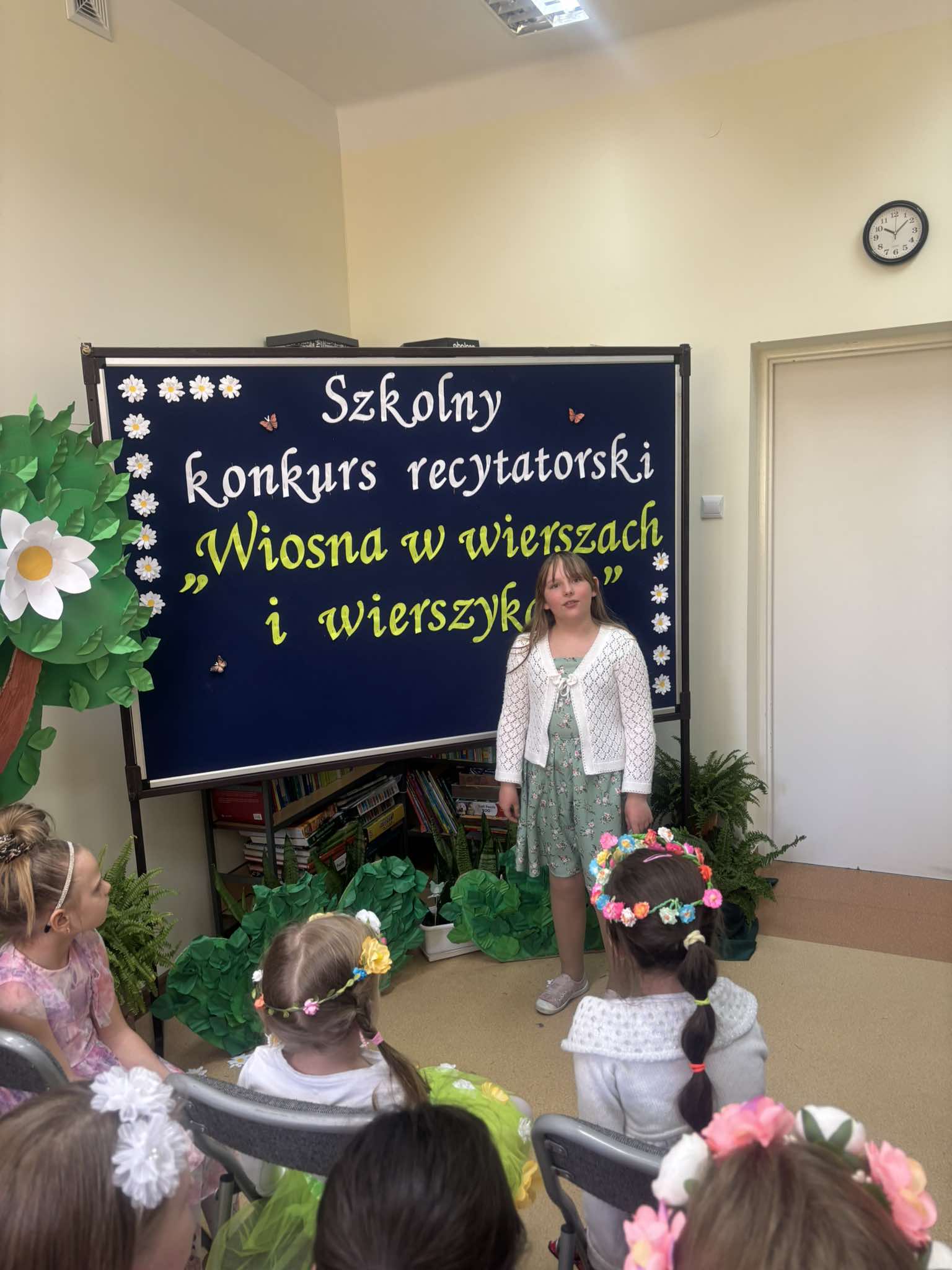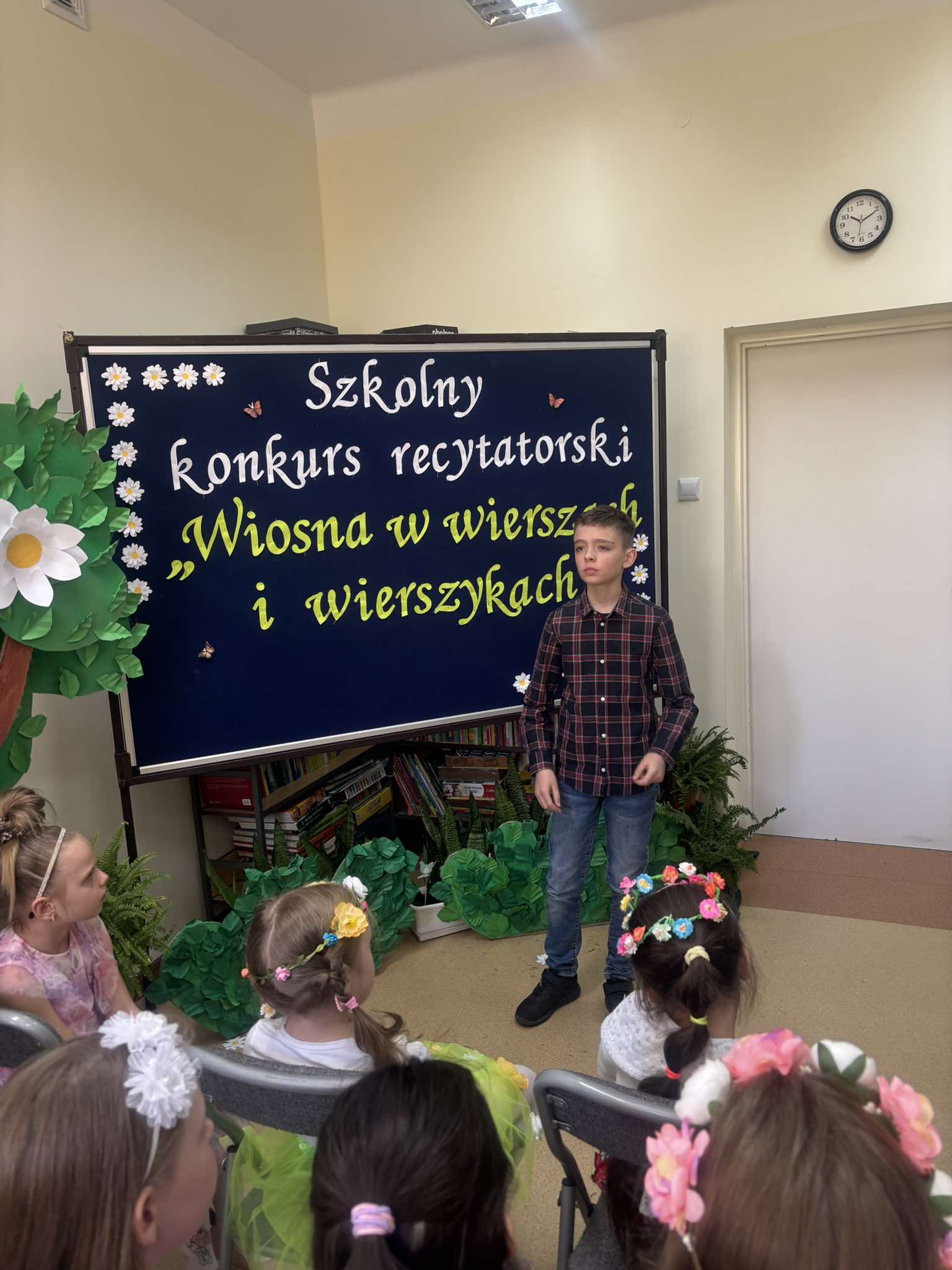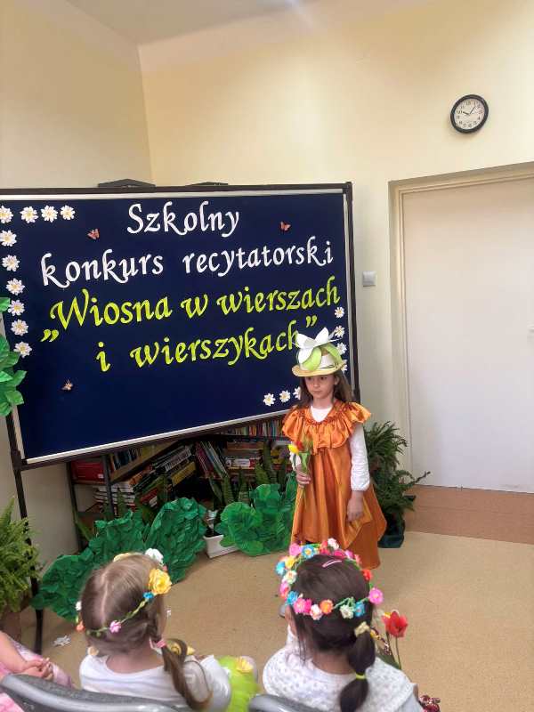 W tegorocznej edycji szkolnego konkursu recytatorskiego pod hasłem: „Wiosna w wierszach i wierszykach” wzięło udział 15 uczestników z klas młodszych i starszych. Pięknych wierszy o tematyce wiosennej wysłuchała komisja w składzie: przewodnicząca – p. Dorota Prokop, nauczyciel polonista –Mirosława Sacha oraz organizator konkursu – bibliotekarz szkolny Sabina Pantera- Migda. W repertuarze pojawili się popularni twórcy poezji dziecięcej, jak: Maria Konopnicka, Dorota Gellener, Julian Tuwim, Maria Terlikowska i inni. Ogólny wyraz artystyczny wzbogaciły wiosenne przebrania i kwiatowe dodatki niektórych uczestników. Po wyrecytowaniu przygotowanych wierszy przez wszystkich uczestników komisja zdecydowała o przyznaniu miejsc i wyróżnień.