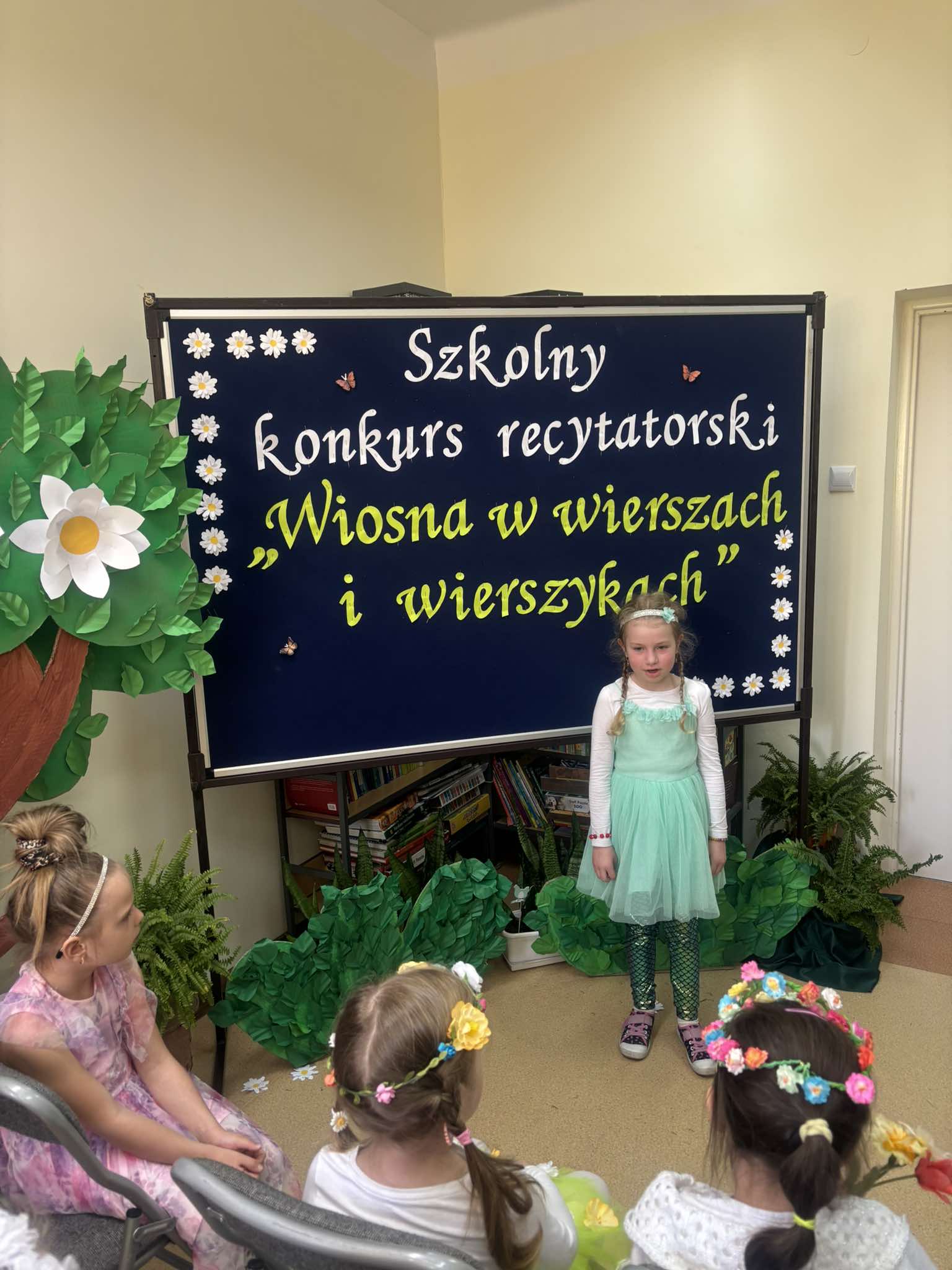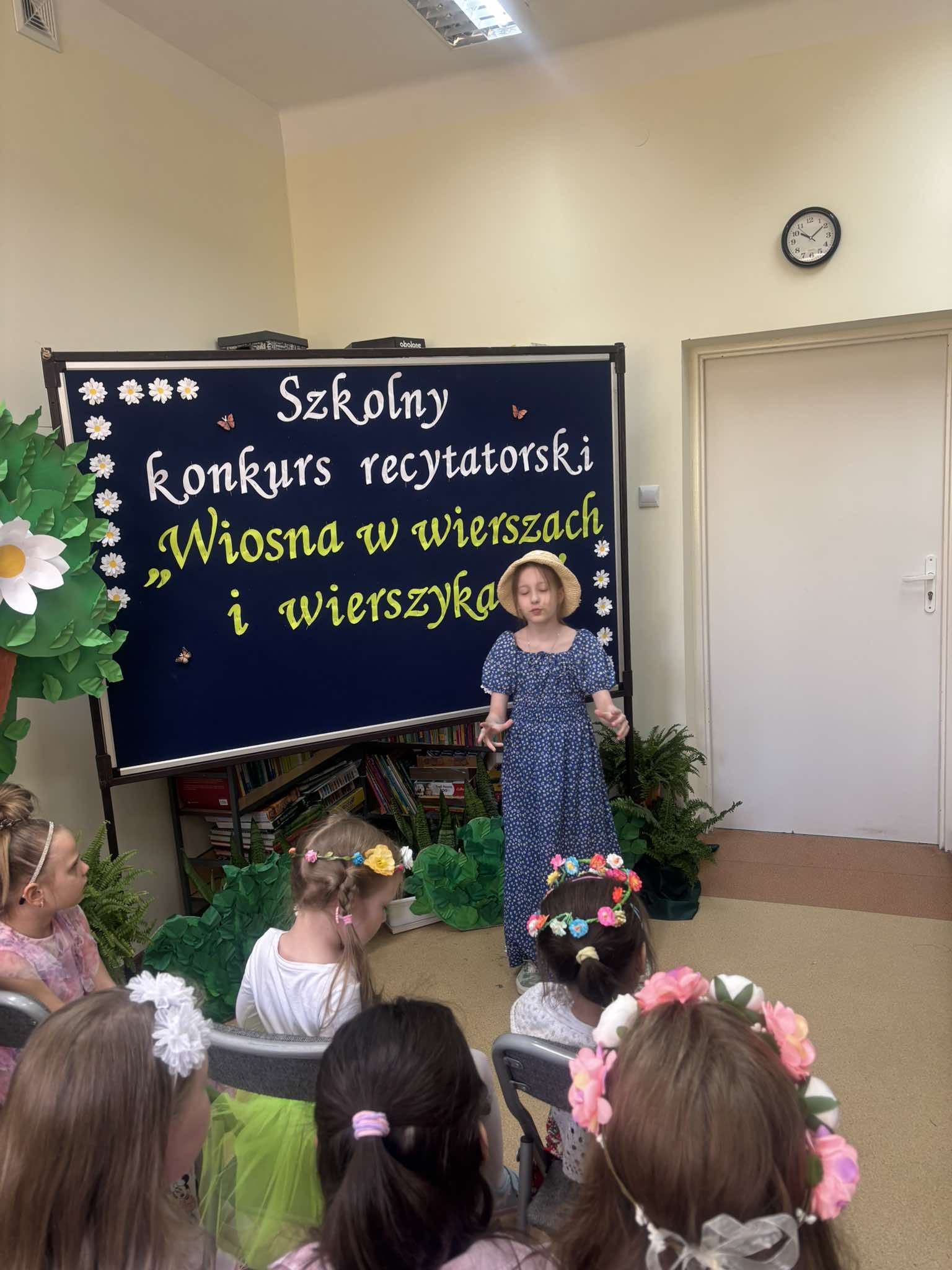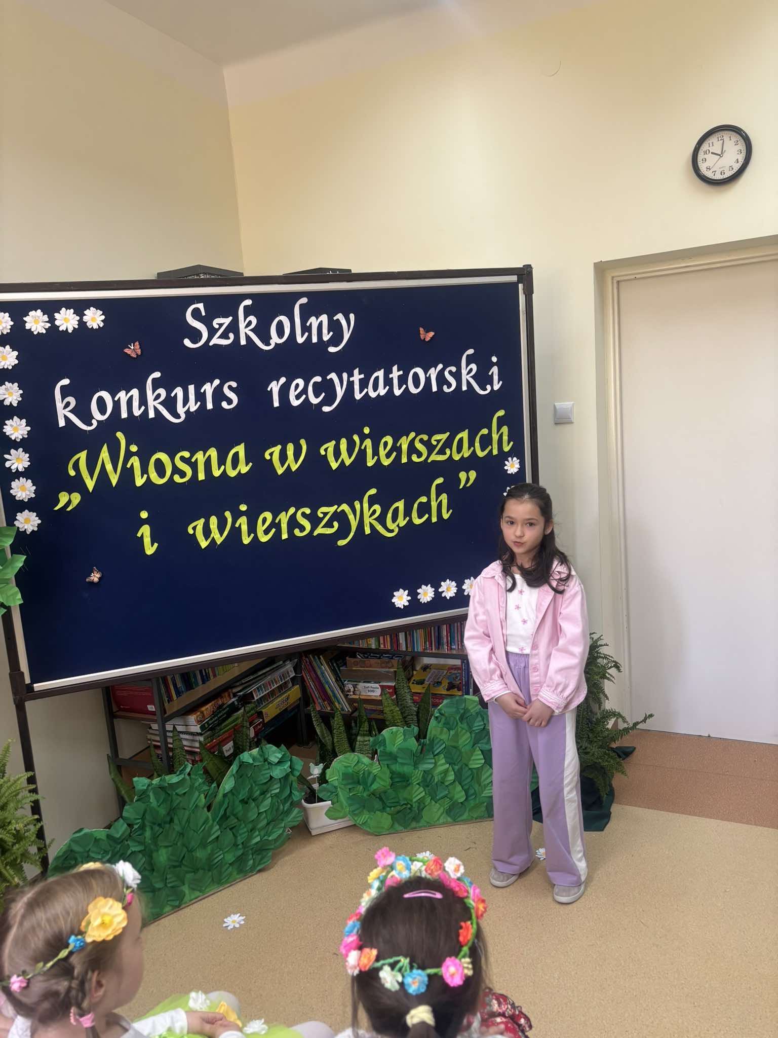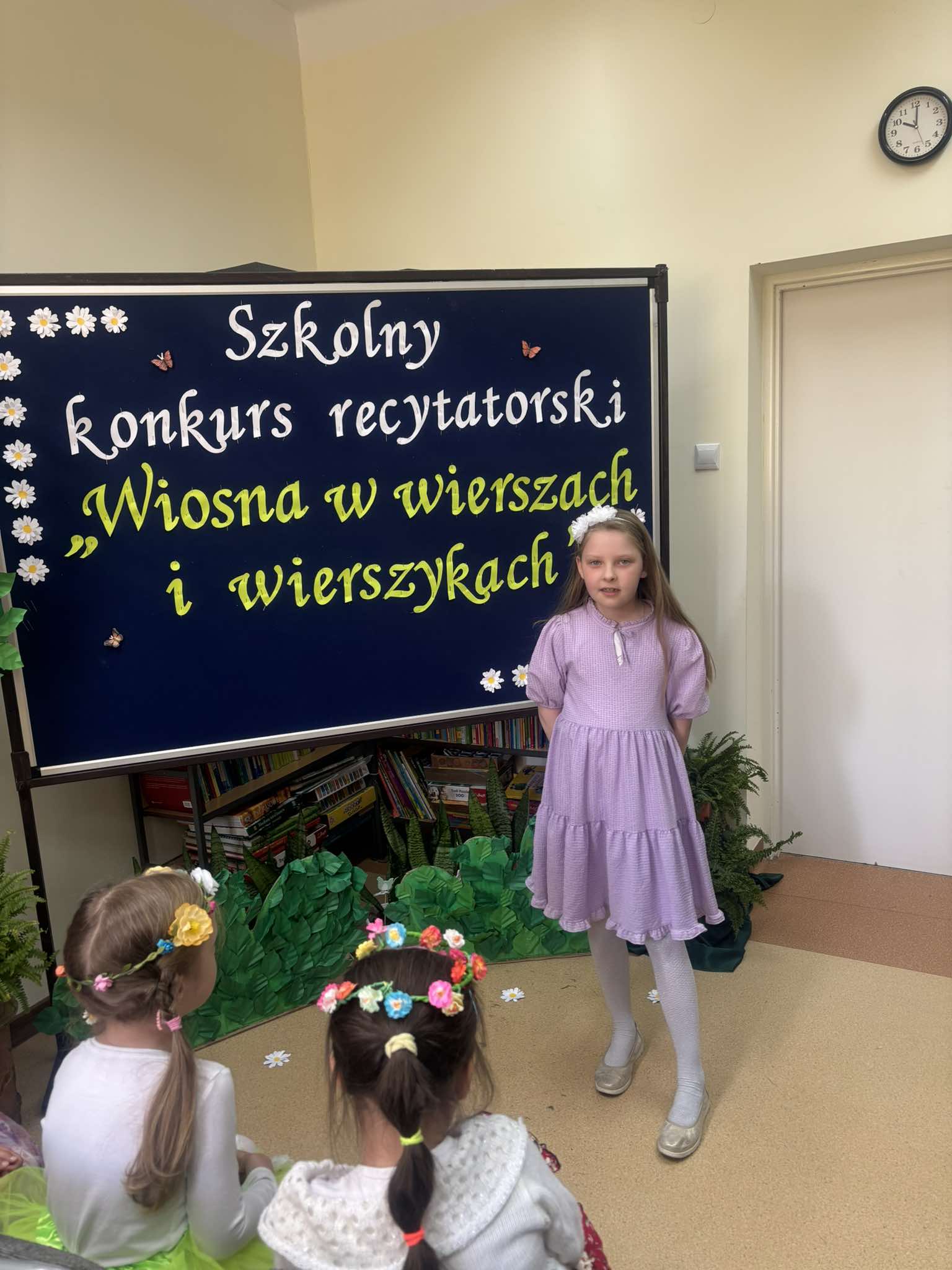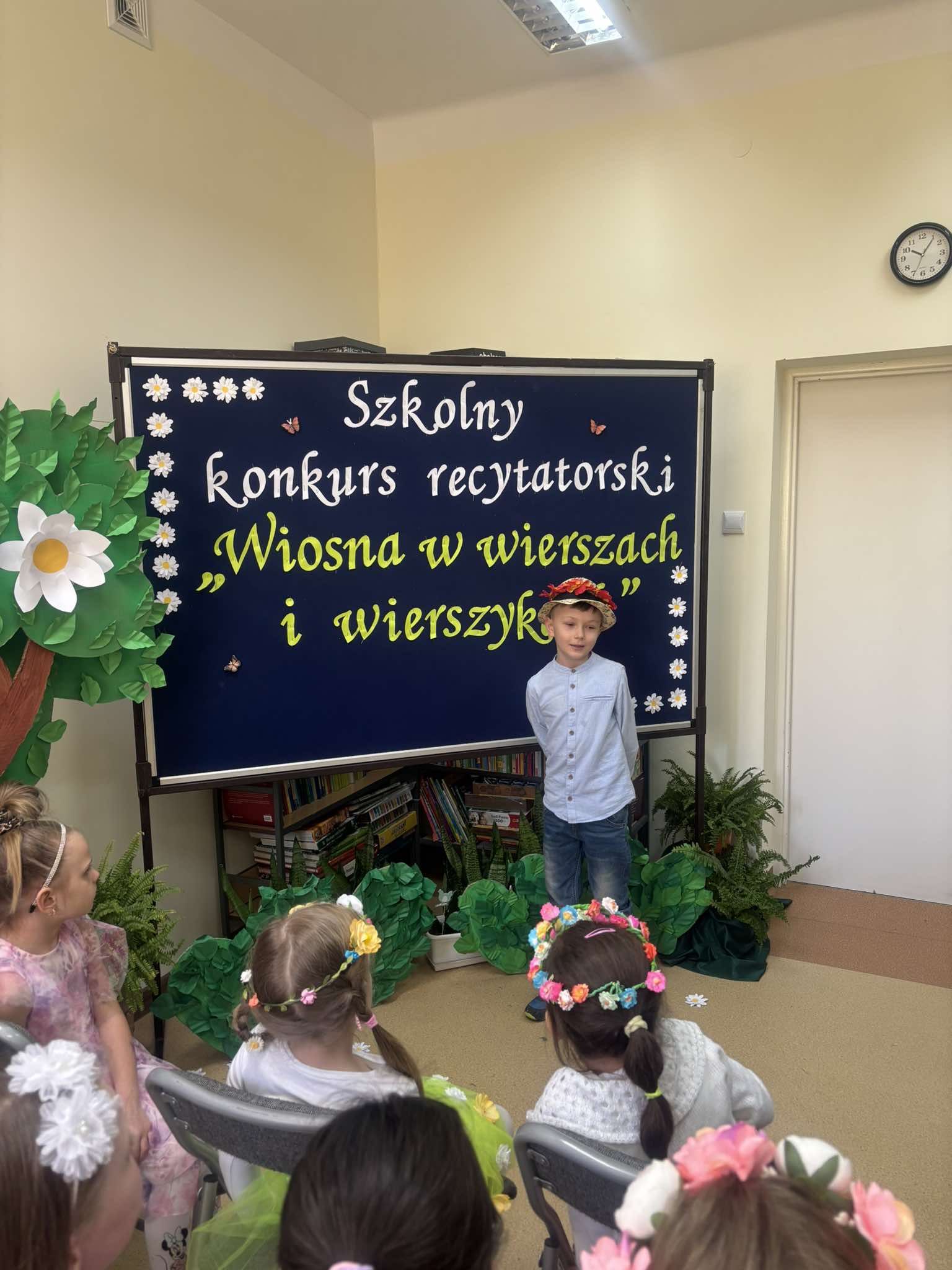 W tegorocznej edycji szkolnego konkursu recytatorskiego pod hasłem: „Wiosna w wierszach i wierszykach” wzięło udział 15 uczestników z klas młodszych i starszych. Pięknych wierszy o tematyce wiosennej wysłuchała komisja w składzie: przewodnicząca – p. Dorota Prokop, nauczyciel polonista –Mirosława Sacha oraz organizator konkursu – bibliotekarz szkolny Sabina Pantera- Migda. W repertuarze pojawili się popularni twórcy poezji dziecięcej, jak: Maria Konopnicka, Dorota Gellener, Julian Tuwim, Maria Terlikowska i inni. Ogólny wyraz artystyczny wzbogaciły wiosenne przebrania i kwiatowe dodatki niektórych uczestników. Po wyrecytowaniu przygotowanych wierszy przez wszystkich uczestników komisja zdecydowała o przyznaniu miejsc i wyróżnień.