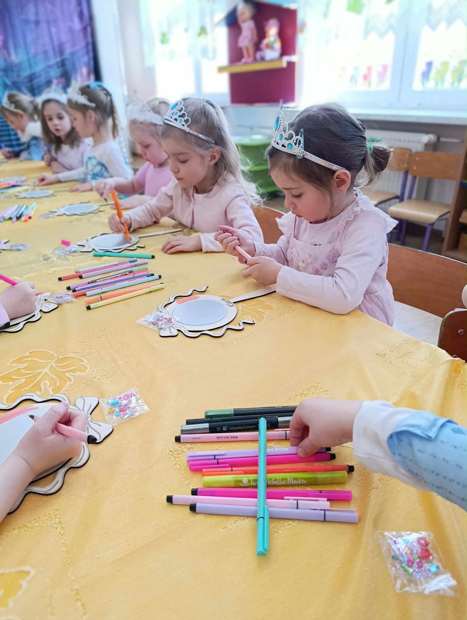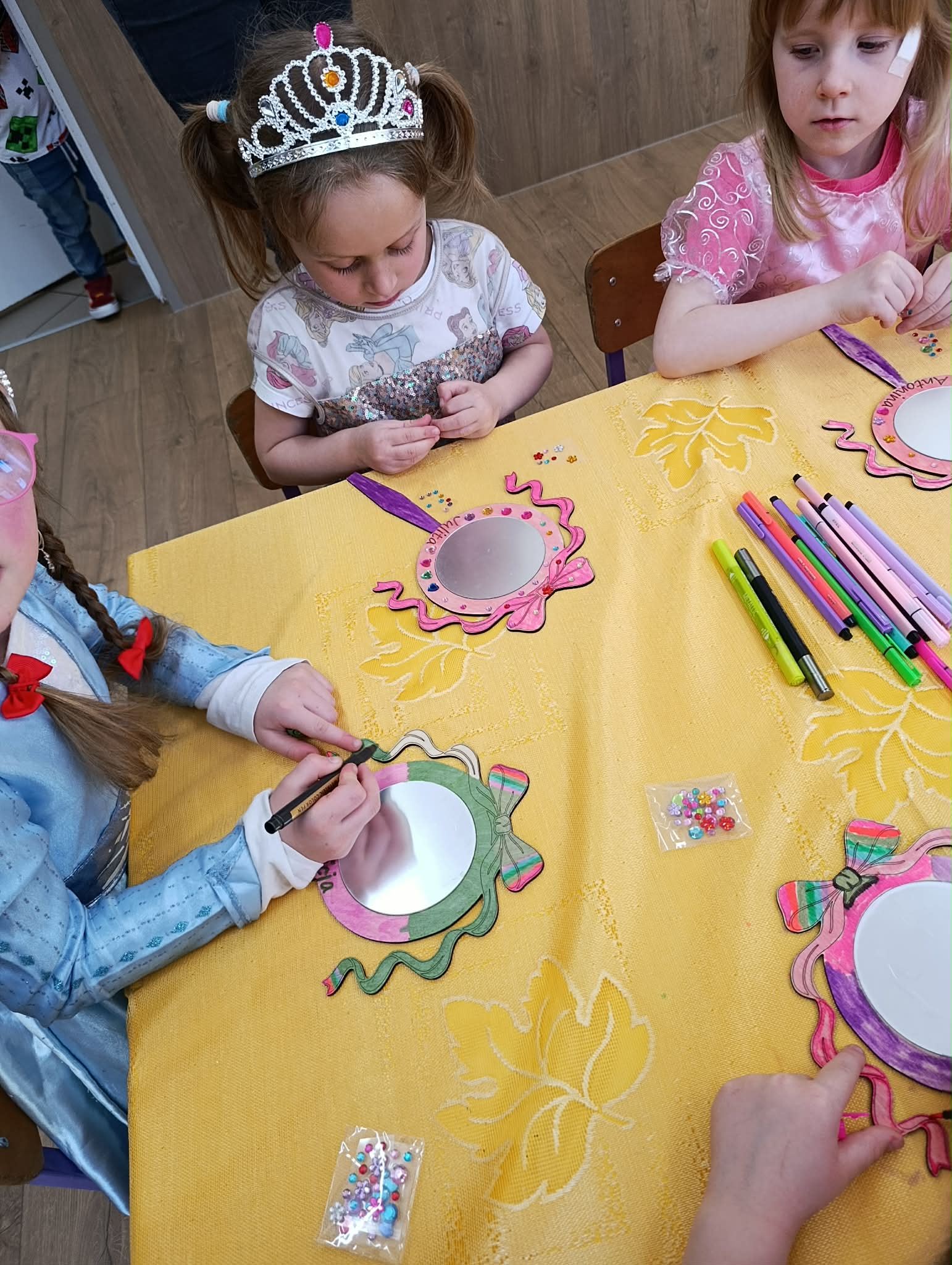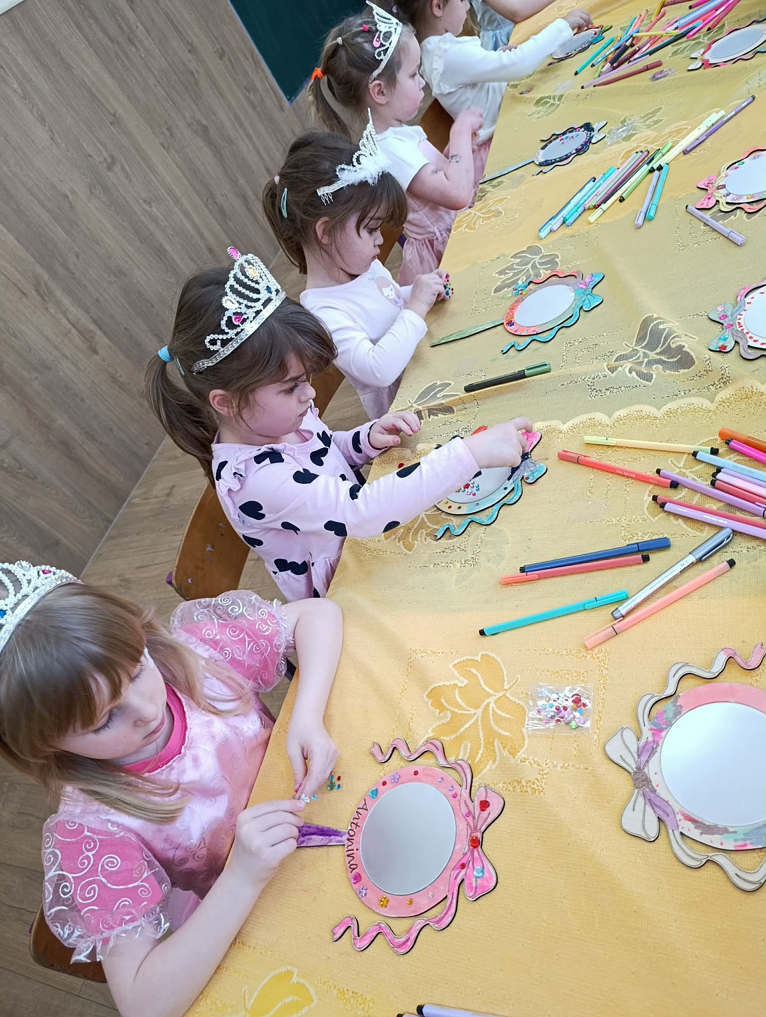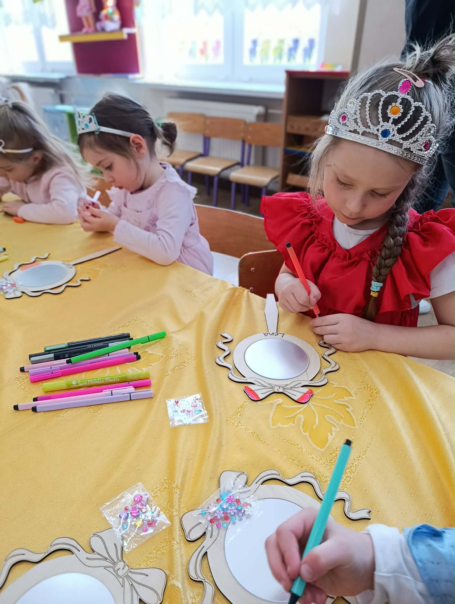 Dziś nasze dziewczynki z okazji Dnia Kobiet brały udział w “księżniczkowych warsztatach”, które poprowadziła mama Huberta- Pani Katarzyna Gacek. Księżniczki przygotowywały dla siebie lusterka, które malowały i ozdabiały, jak to przystało na księżniczki – diamentami. Wykonane lusterka będą im służyły w czasie zabaw tematycznych. Pani Kasi bardzo dziękujemy za przygotowanie i przeprowadzenie warsztatów, a Radzie Rodziców za ufundowanie lusterek i akcesoriów do ich udekorowania. Wszystkim Naszym małym kobietkom życzymy wszystkiego najlepszego z okazji ich święta.