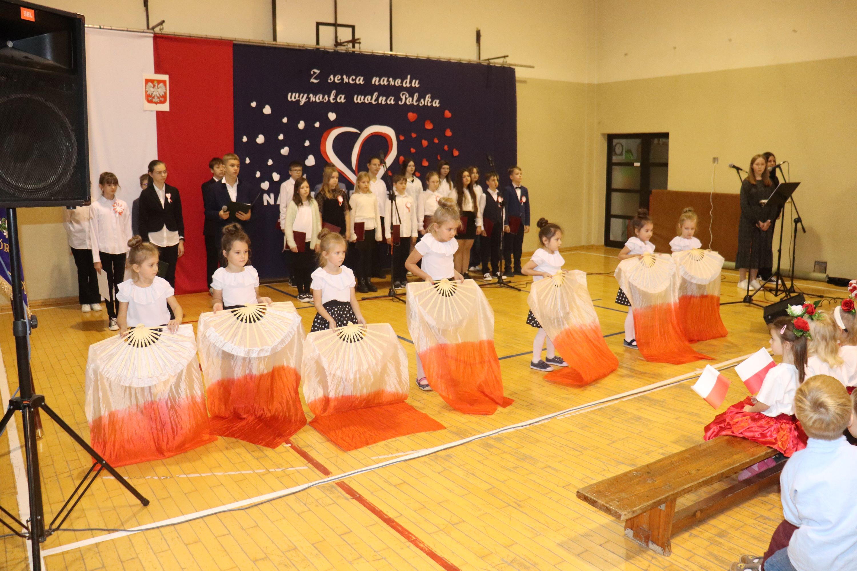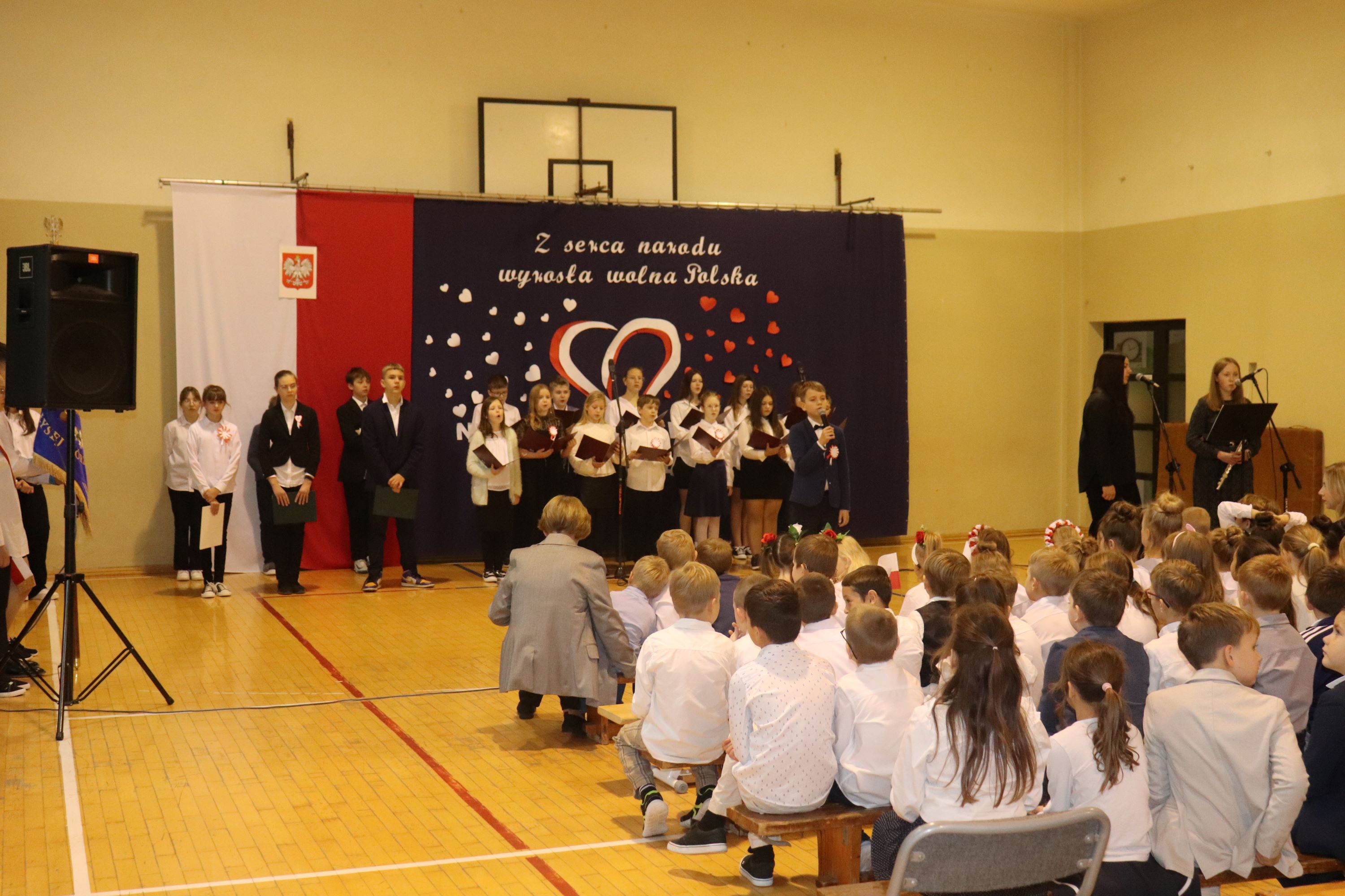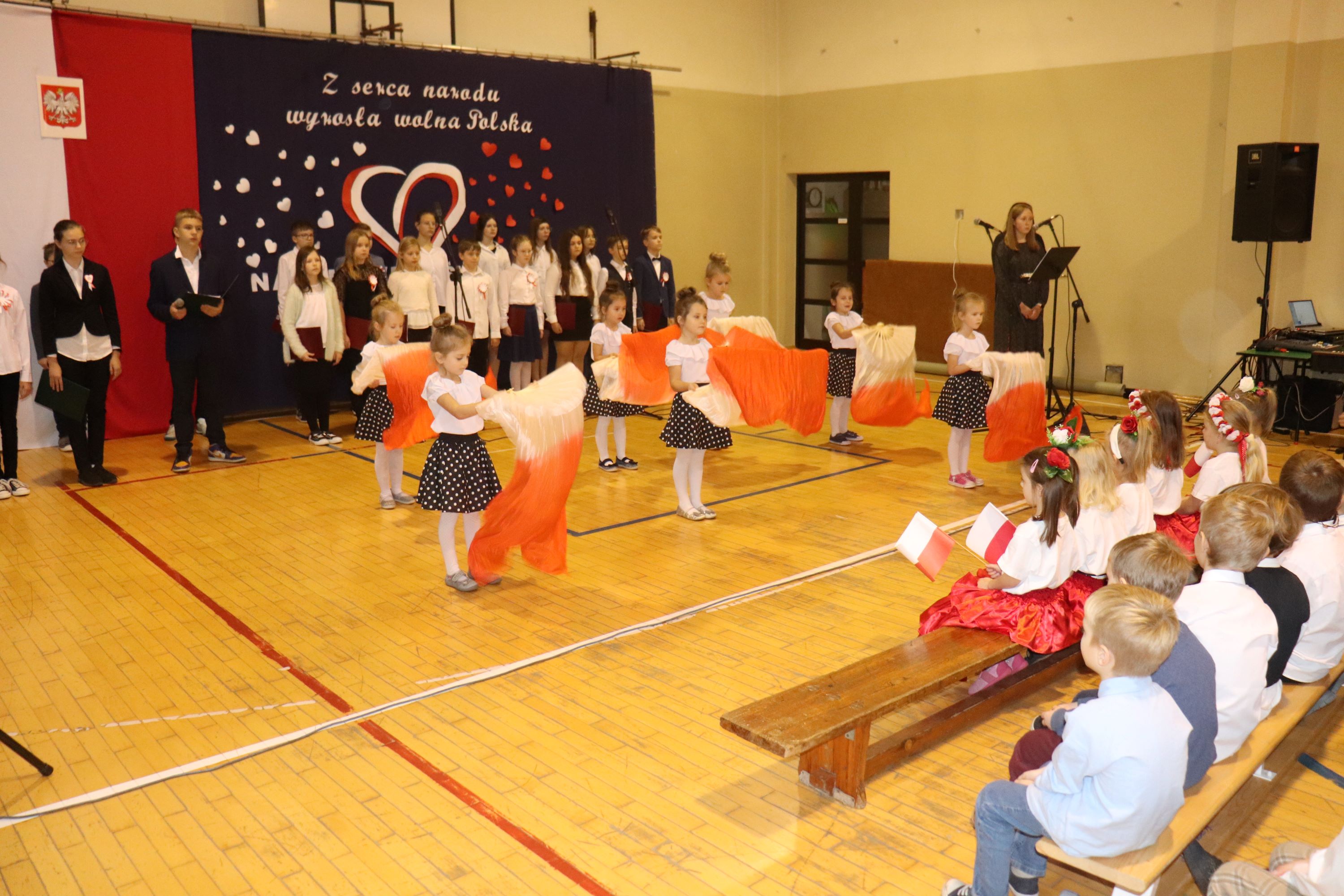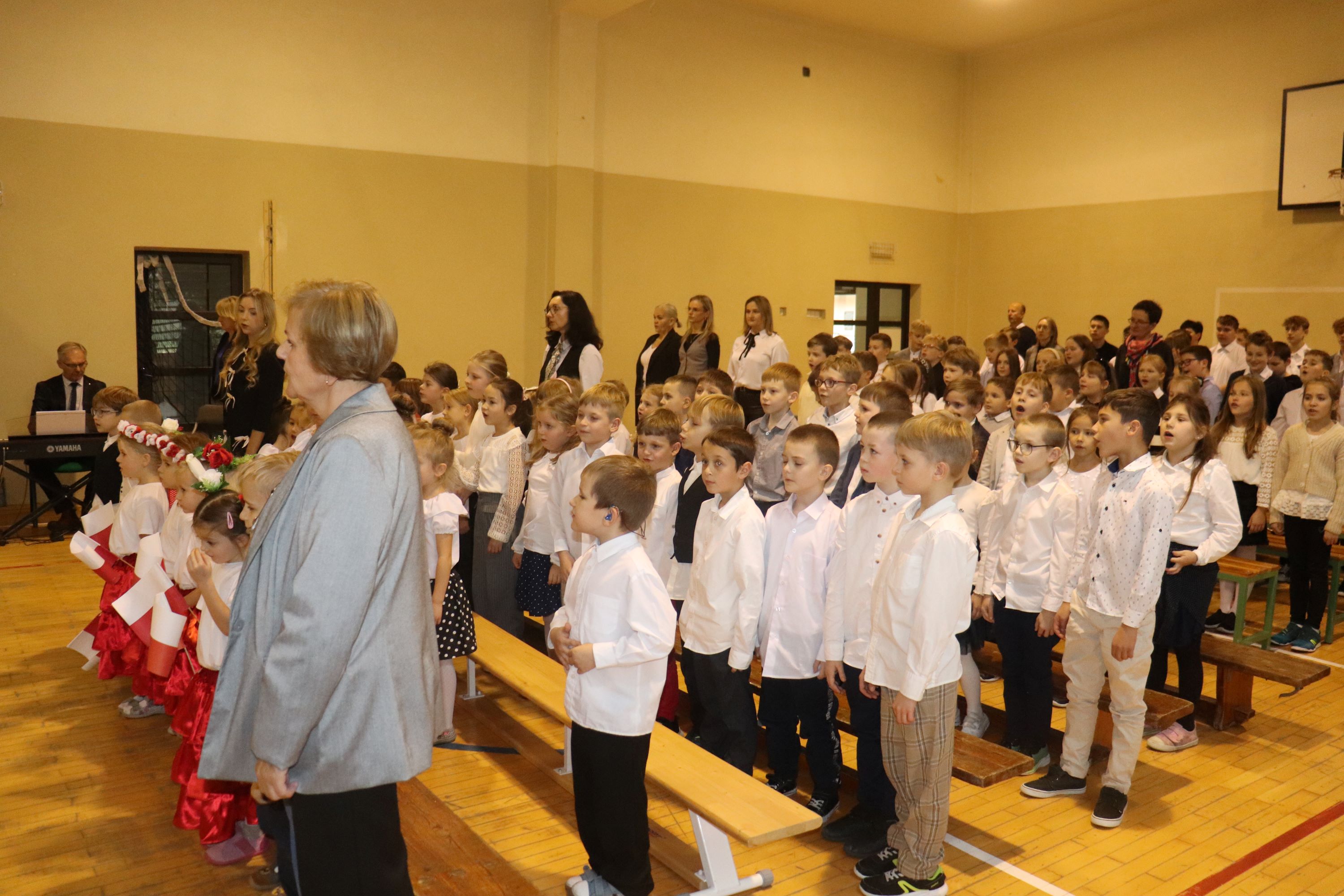 W tym roku wyjątkowo uroczyście obchodziliśmy Święto Niepodległości.. Uczciliśmy ten dzień głęboką refleksją nad Ojczyzną, przeszłością i patriotyzmem. Uczniowie naszego Zespołu Szkolno-Przedszkolnego przygotowali montaż słowno- muzyczny. Uroczystość, wzruszającym tańcem, rozpoczęły dziewczynki z zerówki. Następnie zaprezentowali się starsi uczniowie: recytatorzy i chór szkolny pod kierunkiem pana Dyrektora . Na koniec wspólnie zaśpiewaliśmy hymn, włączając się do ogólnopolskiej akcji: SZKOŁA DO HYMNU.