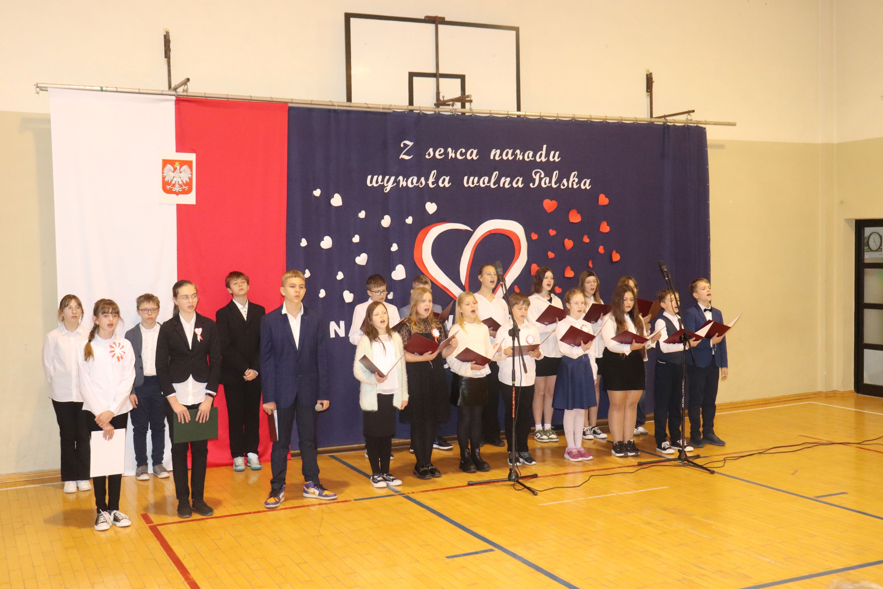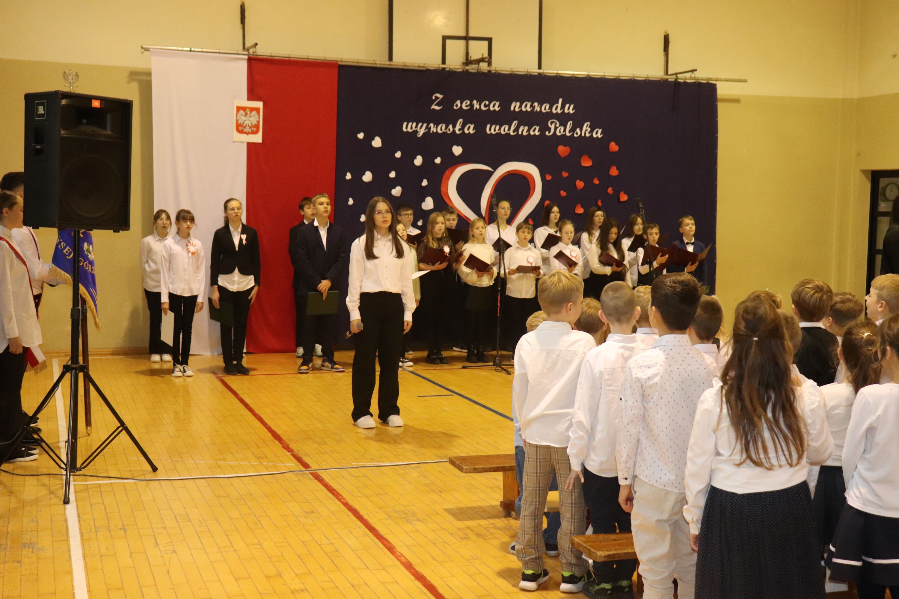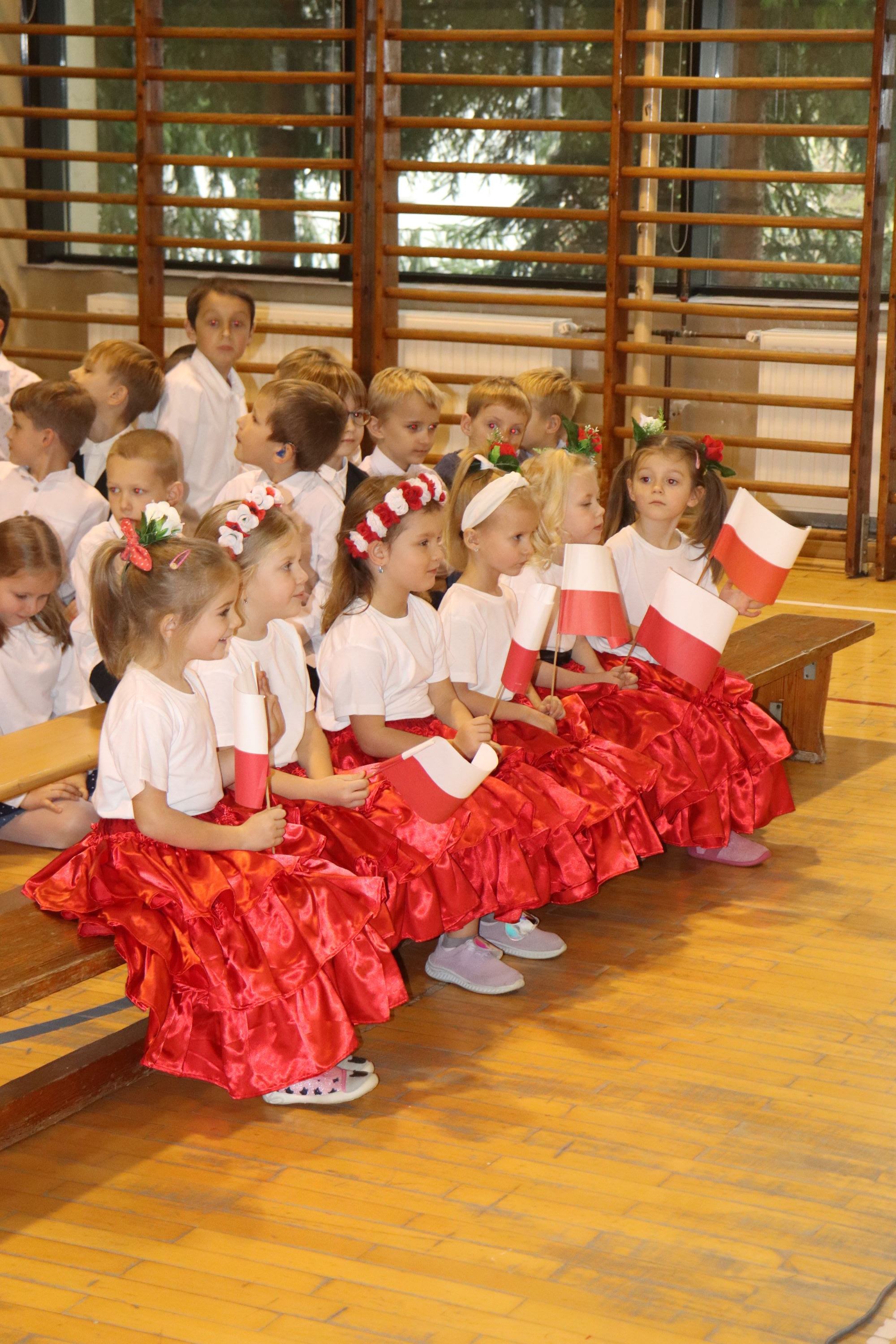 W tym roku wyjątkowo uroczyście obchodziliśmy Święto Niepodległości.. Uczciliśmy ten dzień głęboką refleksją nad Ojczyzną, przeszłością i patriotyzmem. Uczniowie naszego Zespołu Szkolno-Przedszkolnego przygotowali montaż słowno- muzyczny. Uroczystość, wzruszającym tańcem, rozpoczęły dziewczynki z zerówki. Następnie zaprezentowali się starsi uczniowie: recytatorzy i chór szkolny pod kierunkiem pana Dyrektora . Na koniec wspólnie zaśpiewaliśmy hymn, włączając się do ogólnopolskiej akcji: SZKOŁA DO HYMNU.