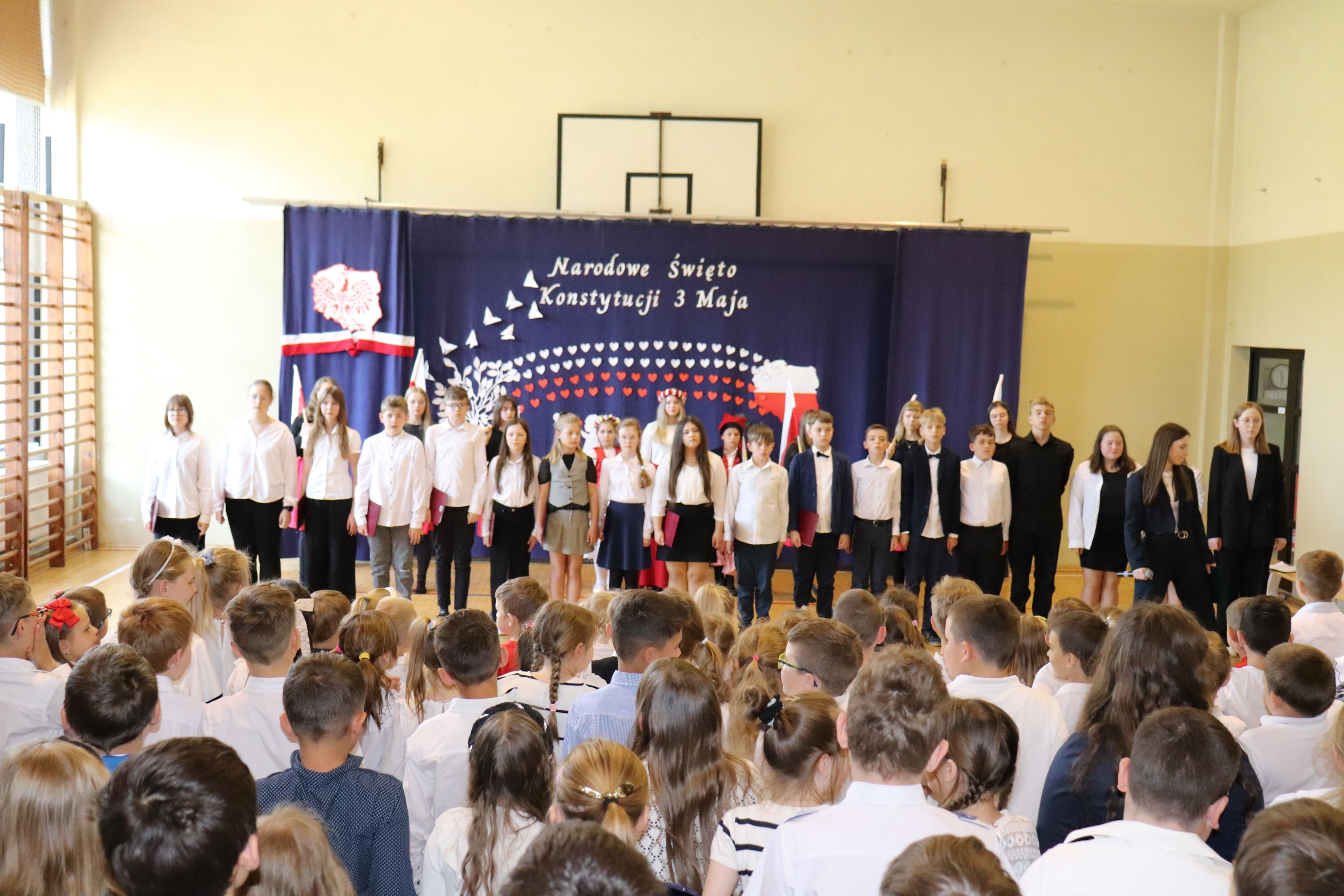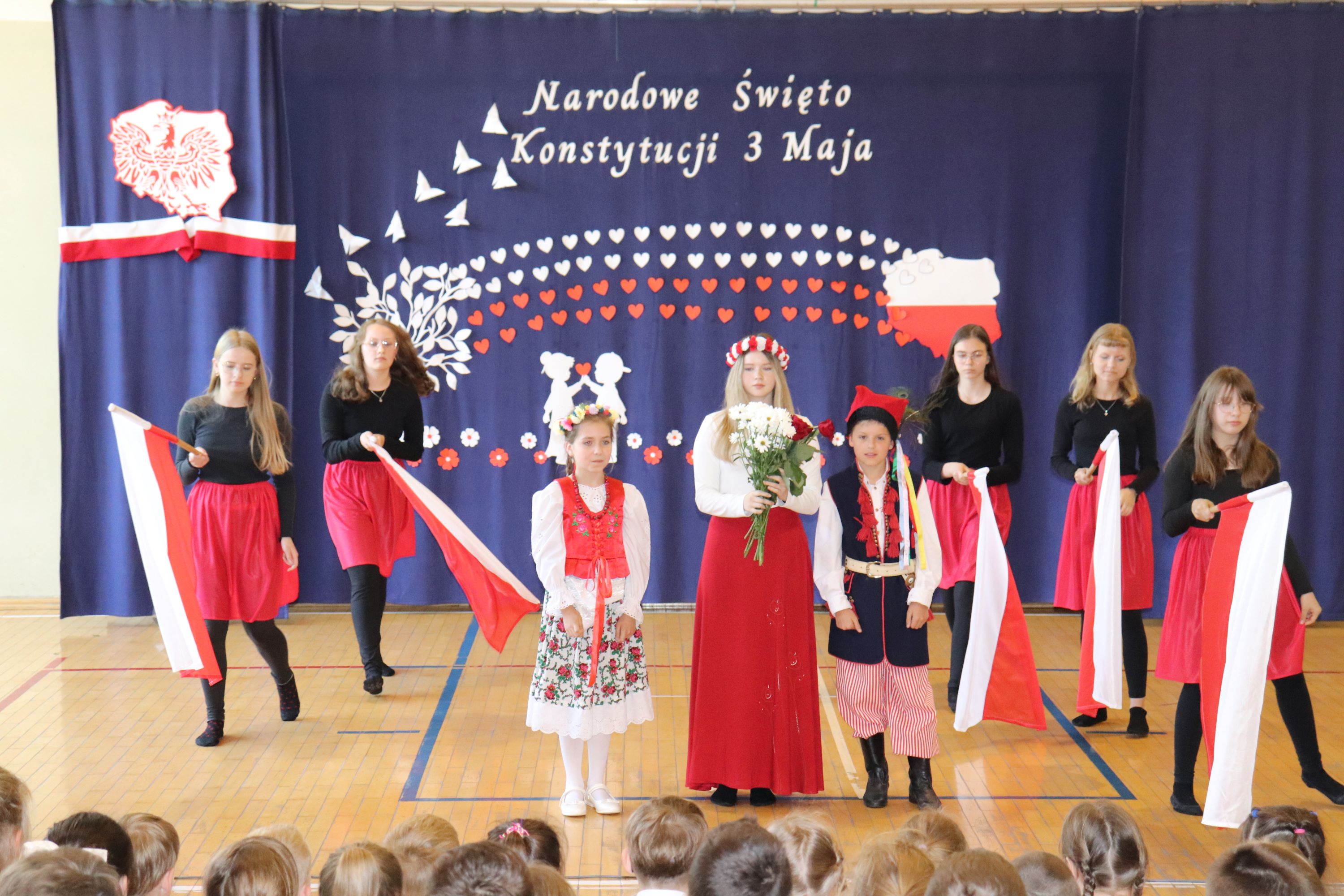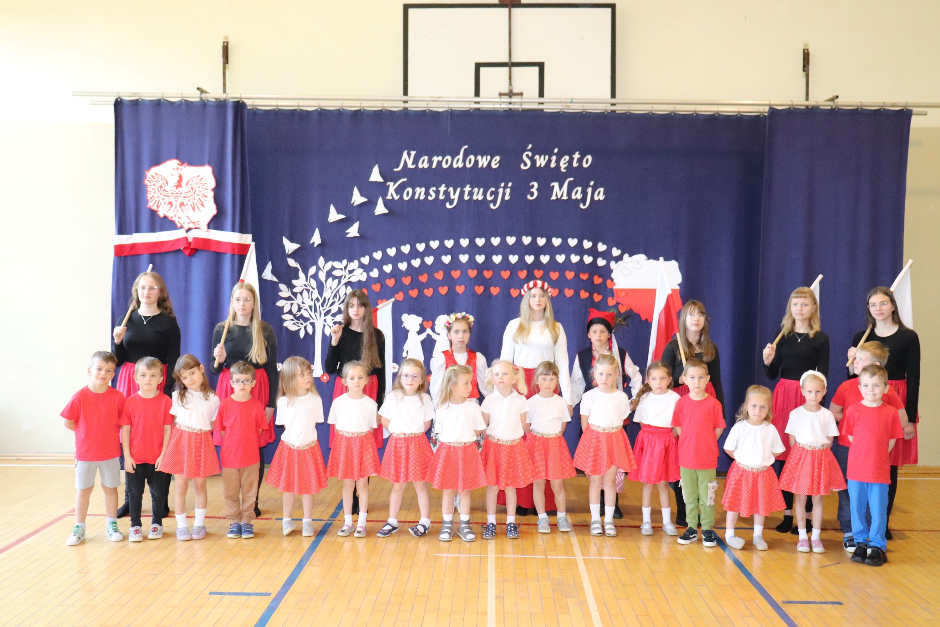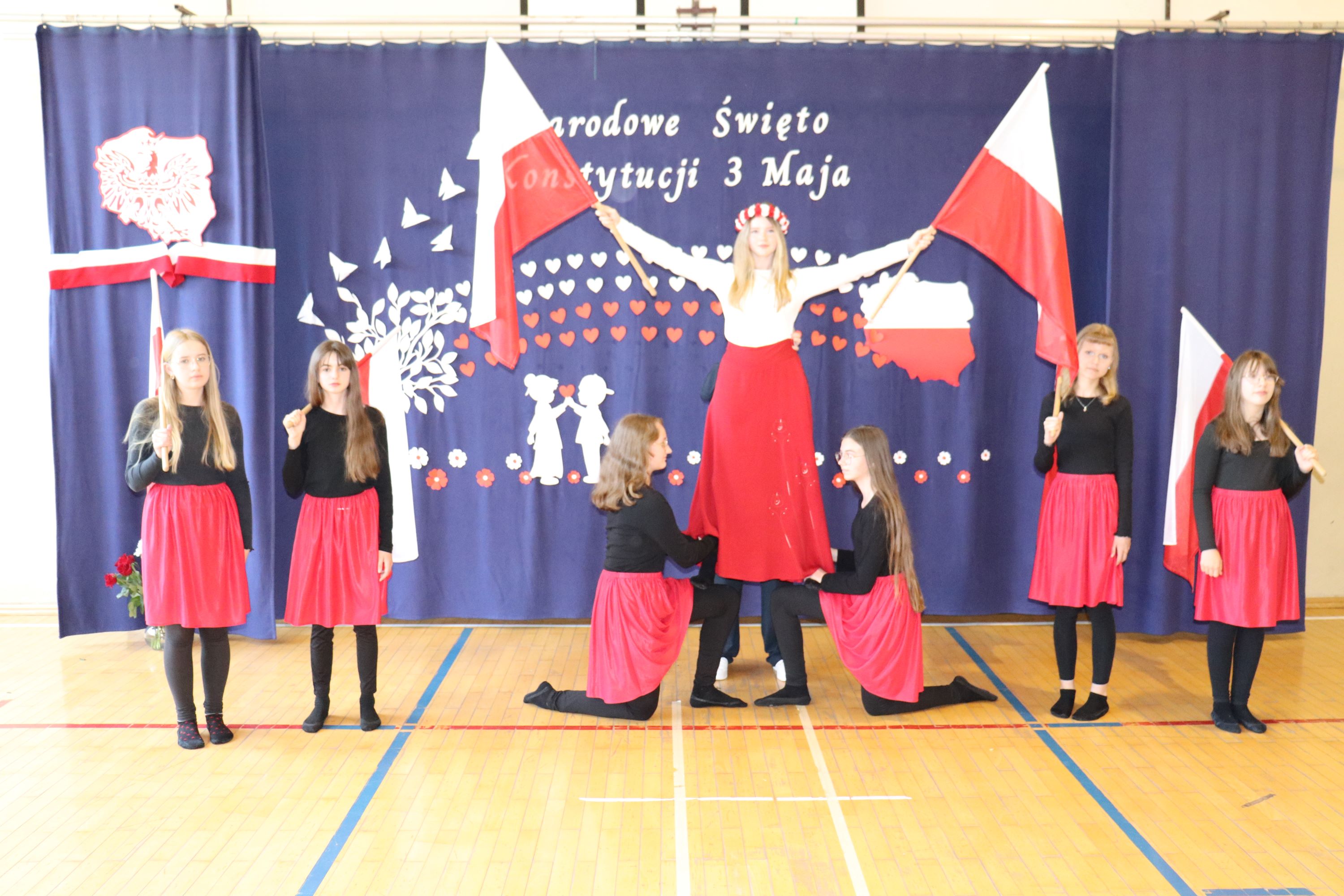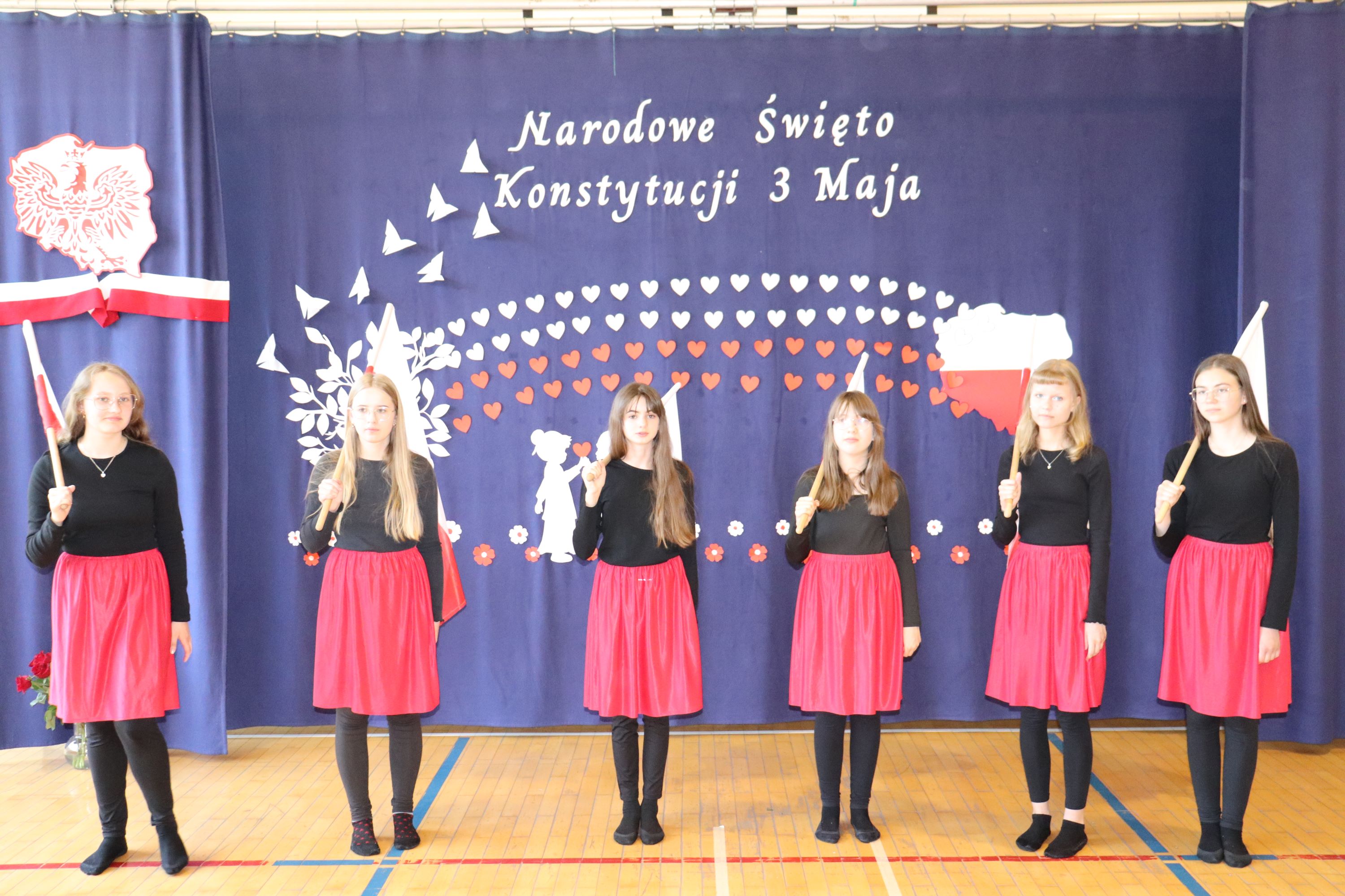 30 kwietnia odbyła się w naszej szkole uroczysta akademia z okazji rocznicy uchwalenia Konstytucji 3 Maja. Montaż słowno – muzyczny w wykonaniu uczniów starszych klas, przygotowany pod opieką wychowawczyni klasy V, pani Lidii Piechnik oraz polonistki, pani Renaty Wis, był dla szkolnej społeczności piękną lekcją historii i patriotyzmu. Niewątpliwą atrakcją uroczystości okazał się taniec z flagami, który podkreślił przywiązanie do tradycji i wzbogacił wartość artystyczną akademii. Choreografię układu wymyśliła przewodnicząca SU, uczennica klasy VII, Patrycja Danilewicz, która wraz z tańczącymi koleżankami poświęciła mnóstwo czasu i energii, aby osiągnąć tak piękny i poruszający efekt. Całości dopełniły patriotyczne piosenki, zaśpiewane przez szkolny chór i solistki. Uczniów do występu przygotował pan dyrektor Artur Potępa.