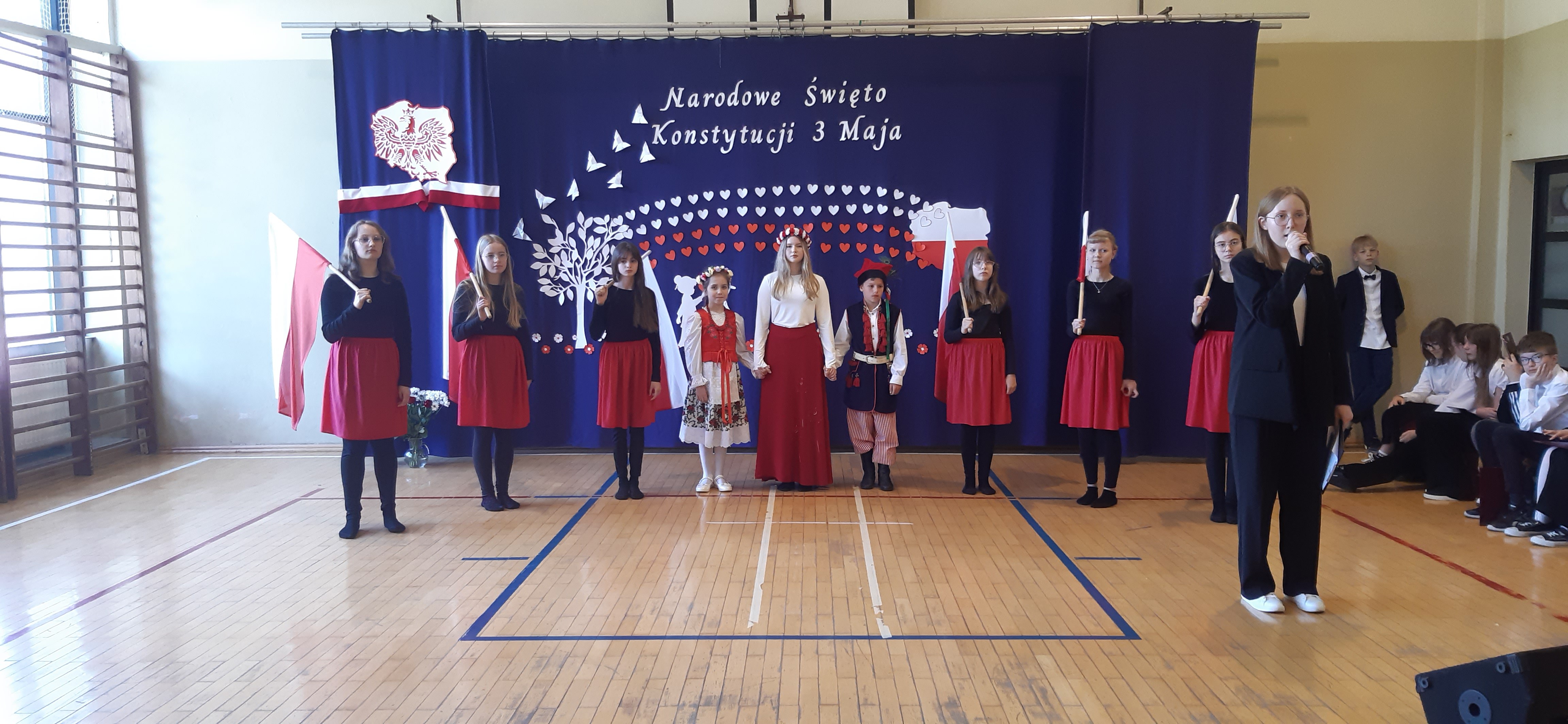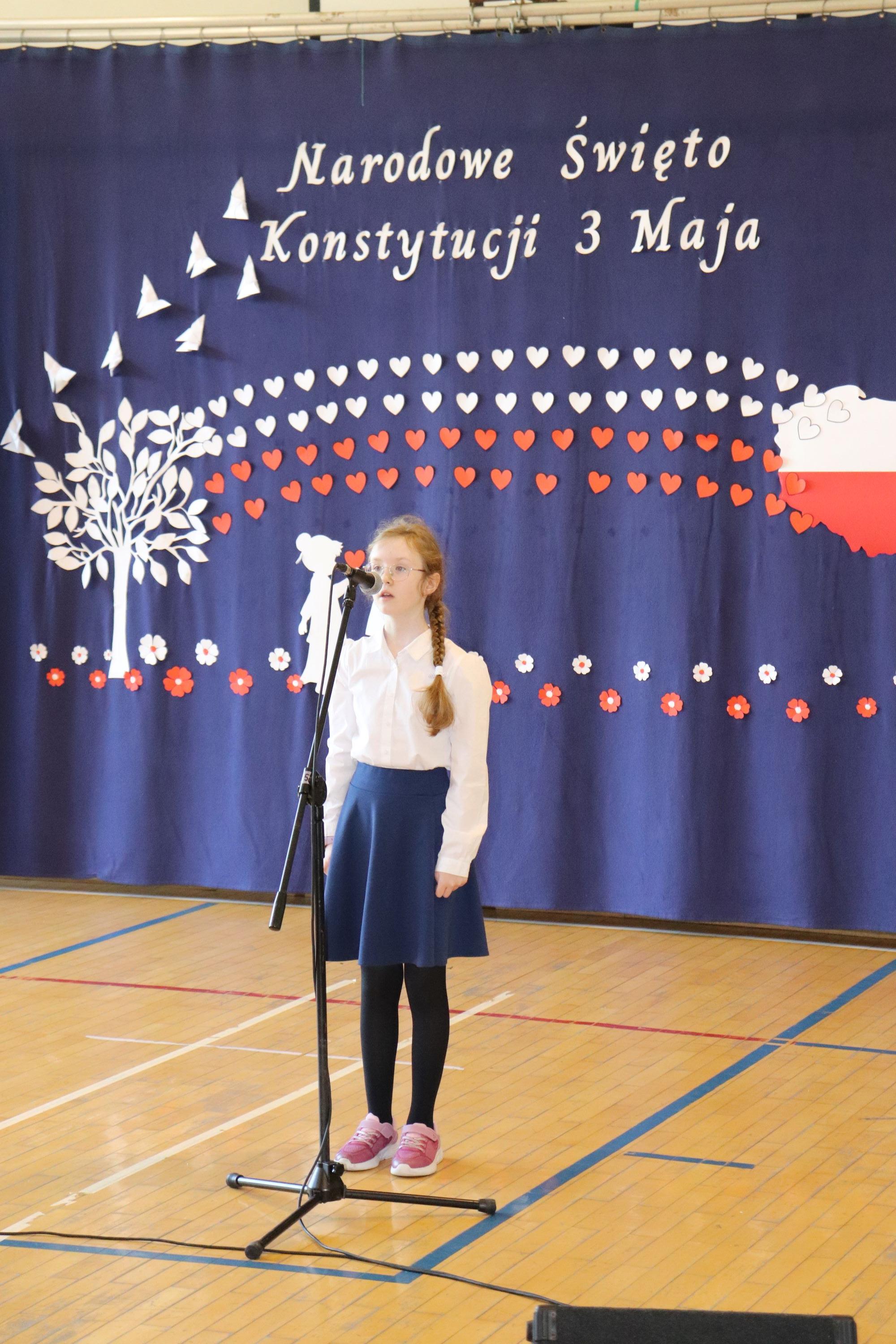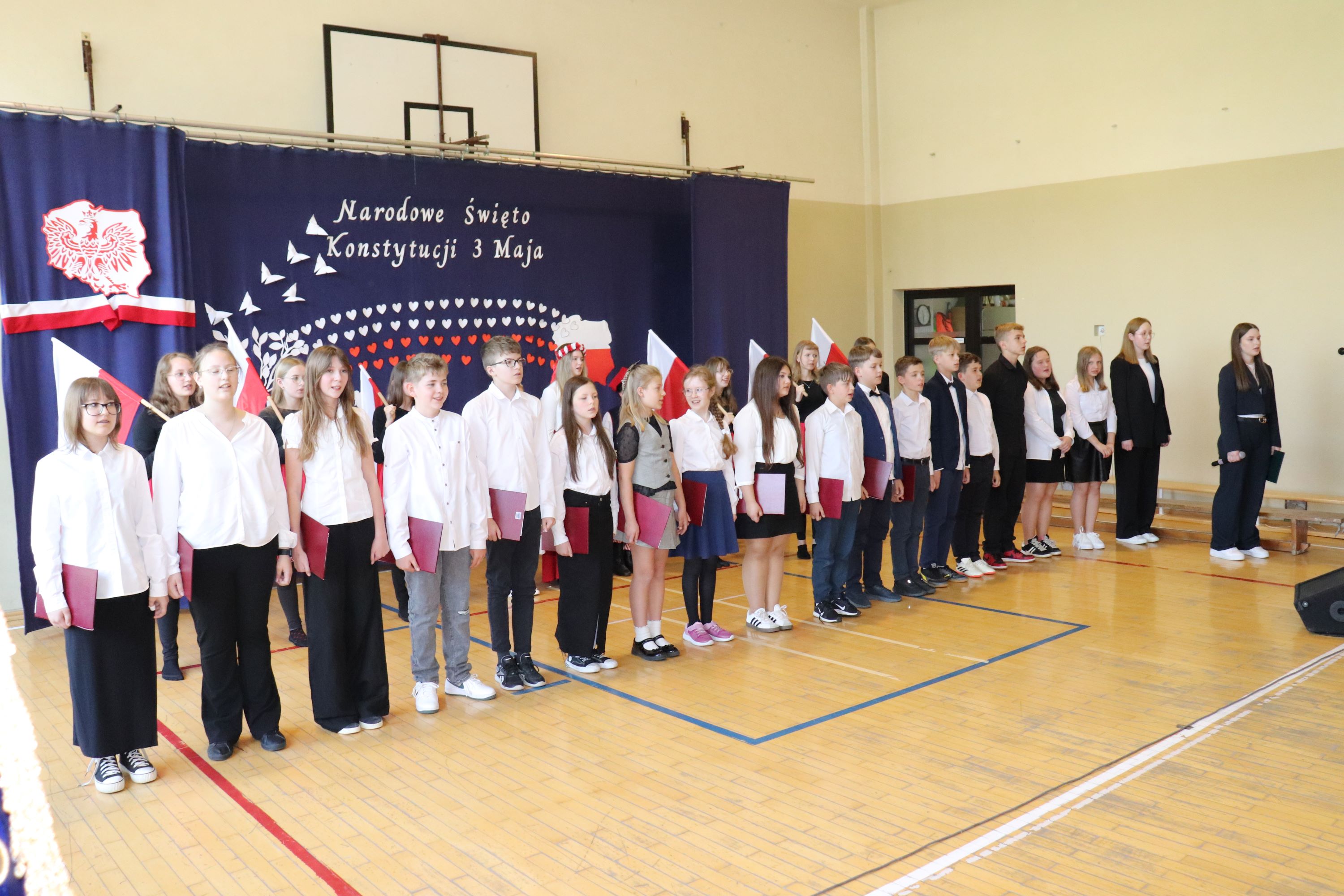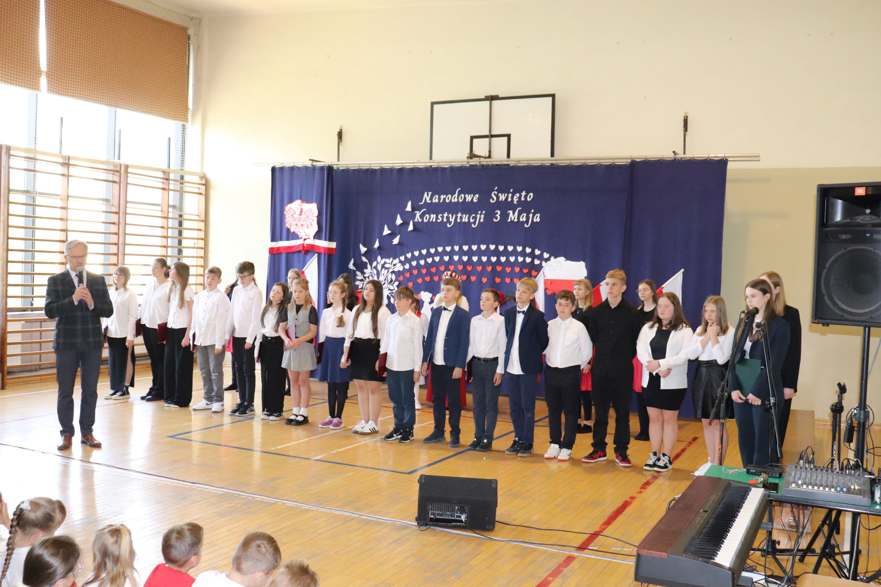 30 kwietnia odbyła się w naszej szkole uroczysta akademia z okazji rocznicy uchwalenia Konstytucji 3 Maja. Montaż słowno – muzyczny w wykonaniu uczniów starszych klas, przygotowany pod opieką wychowawczyni klasy V, pani Lidii Piechnik oraz polonistki, pani Renaty Wis, był dla szkolnej społeczności piękną lekcją historii i patriotyzmu. Niewątpliwą atrakcją uroczystości okazał się taniec z flagami, który podkreślił przywiązanie do tradycji i wzbogacił wartość artystyczną akademii. Choreografię układu wymyśliła przewodnicząca SU, uczennica klasy VII, Patrycja Danilewicz, która wraz z tańczącymi koleżankami poświęciła mnóstwo czasu i energii, aby osiągnąć tak piękny i poruszający efekt. Całości dopełniły patriotyczne piosenki, zaśpiewane przez szkolny chór i solistki. Uczniów do występu przygotował pan dyrektor Artur Potępa.
