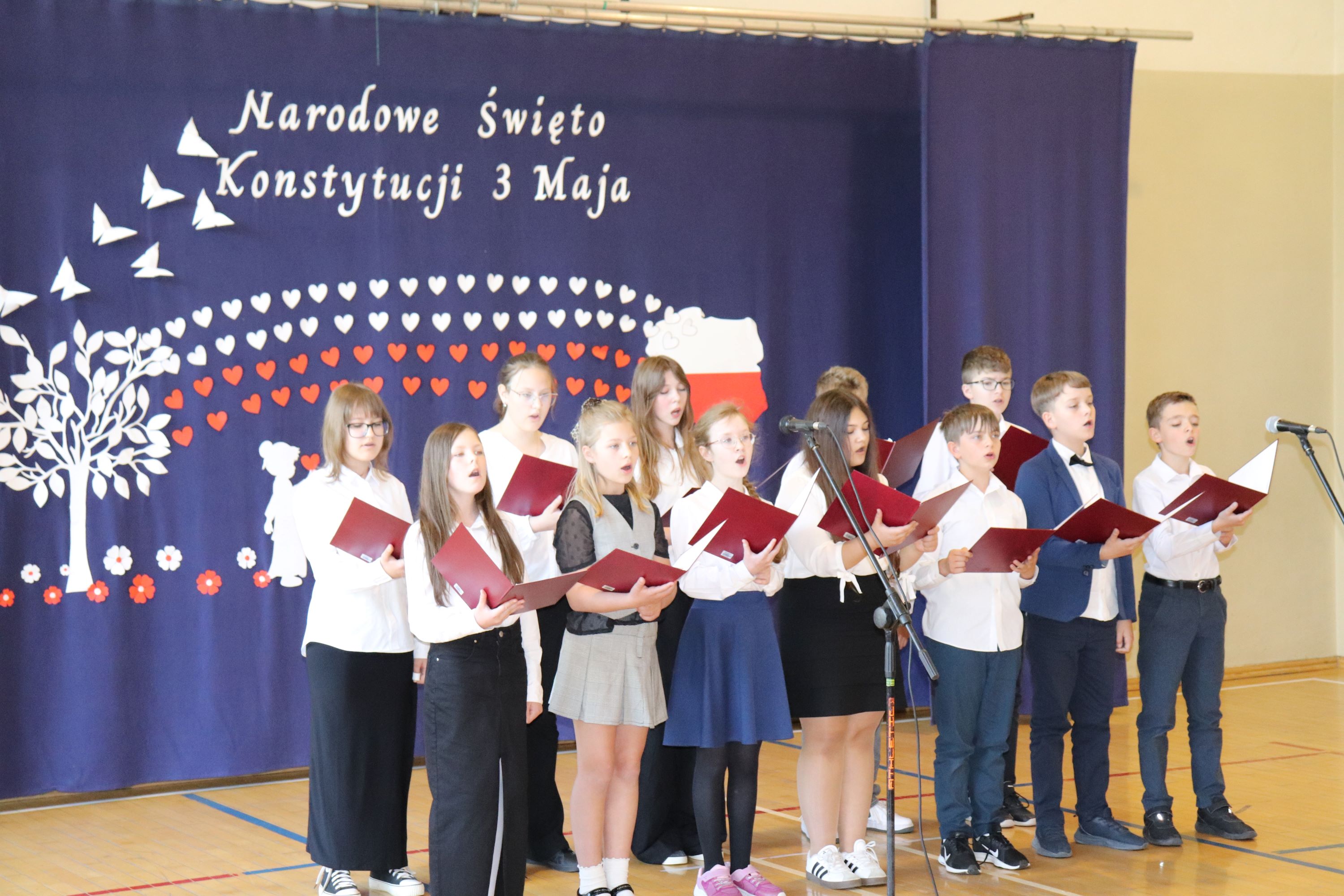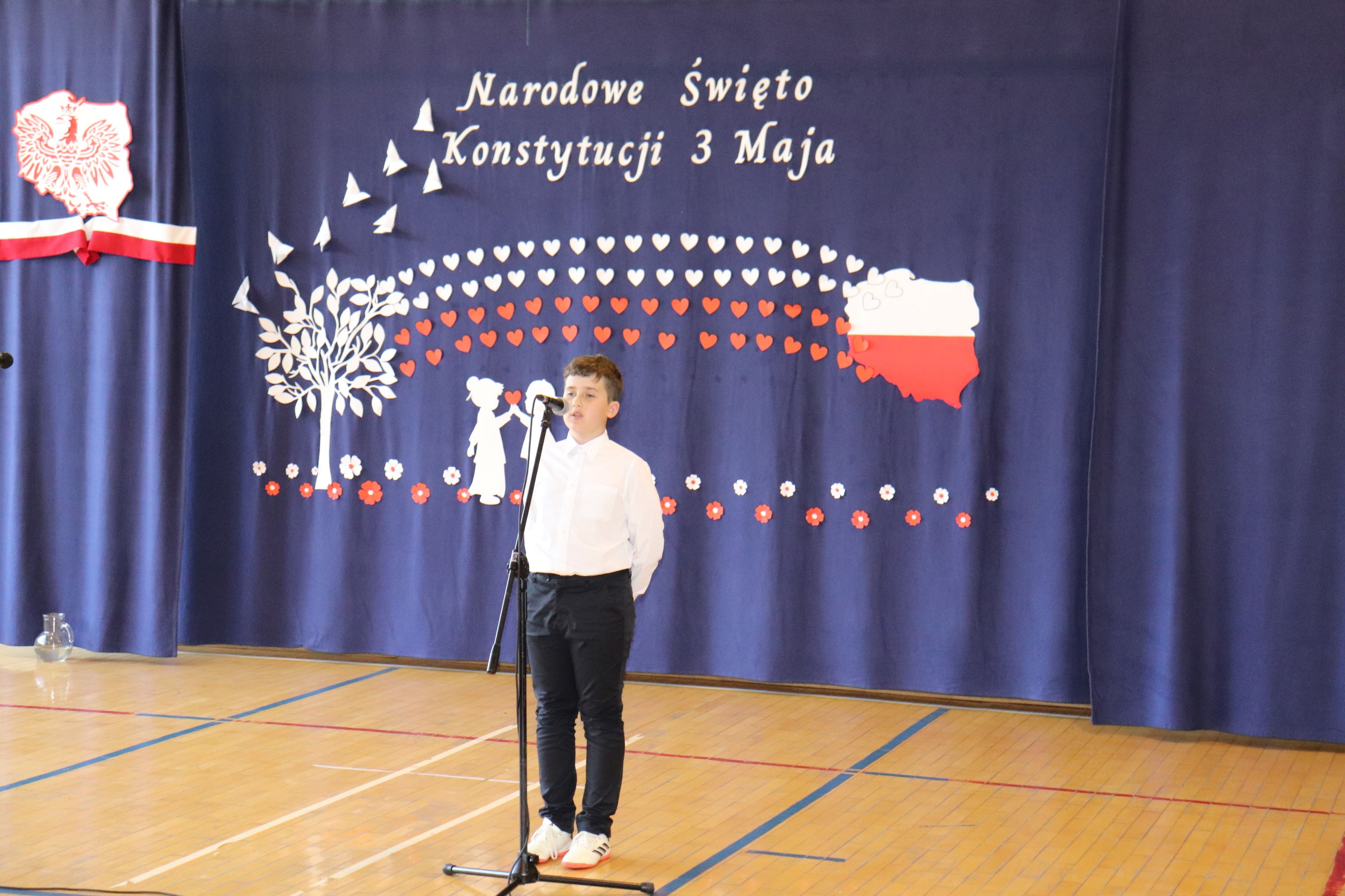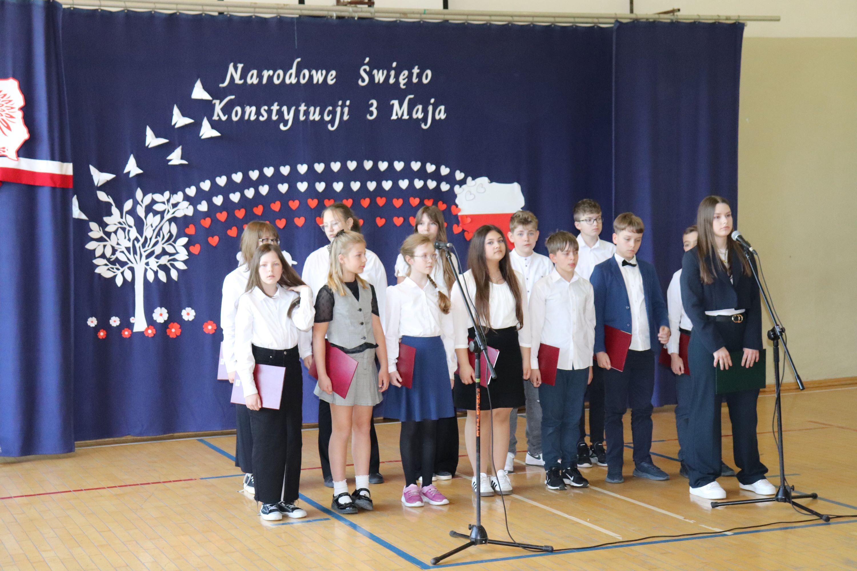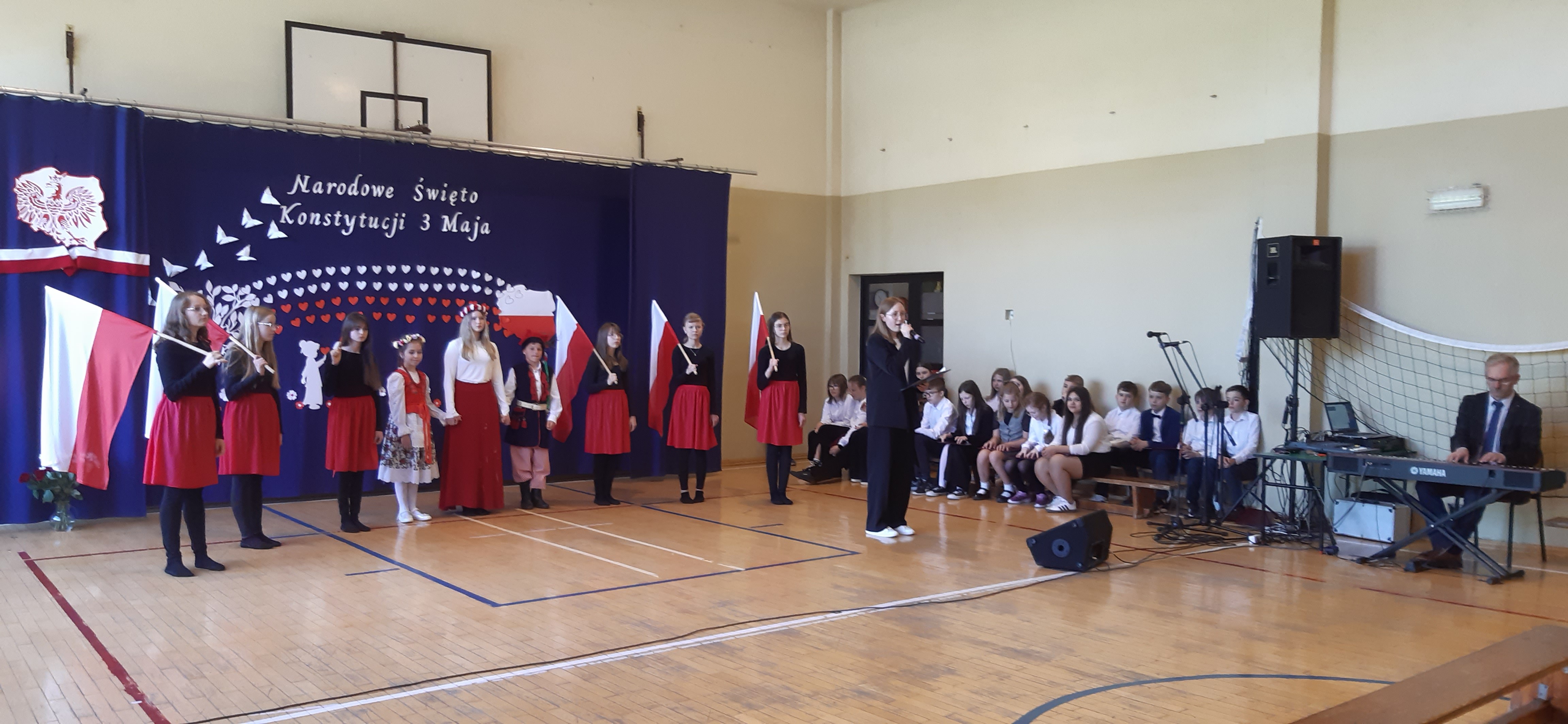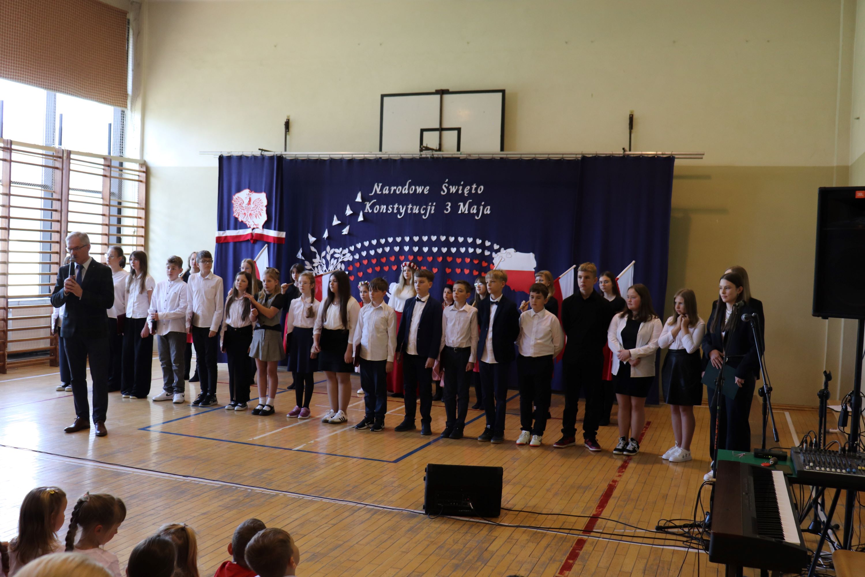 30 kwietnia odbyła się w naszej szkole uroczysta akademia z okazji rocznicy uchwalenia Konstytucji 3 Maja. Montaż słowno – muzyczny w wykonaniu uczniów starszych klas, przygotowany pod opieką wychowawczyni klasy V, pani Lidii Piechnik oraz polonistki, pani Renaty Wis, był dla szkolnej społeczności piękną lekcją historii i patriotyzmu. Niewątpliwą atrakcją uroczystości okazał się taniec z flagami, który podkreślił przywiązanie do tradycji i wzbogacił wartość artystyczną akademii. Choreografię układu wymyśliła przewodnicząca SU, uczennica klasy VII, Patrycja Danilewicz, która wraz z tańczącymi koleżankami poświęciła mnóstwo czasu i energii, aby osiągnąć tak piękny i poruszający efekt. Całości dopełniły patriotyczne piosenki, zaśpiewane przez szkolny chór i solistki. Uczniów do występu przygotował pan dyrektor Artur Potępa.