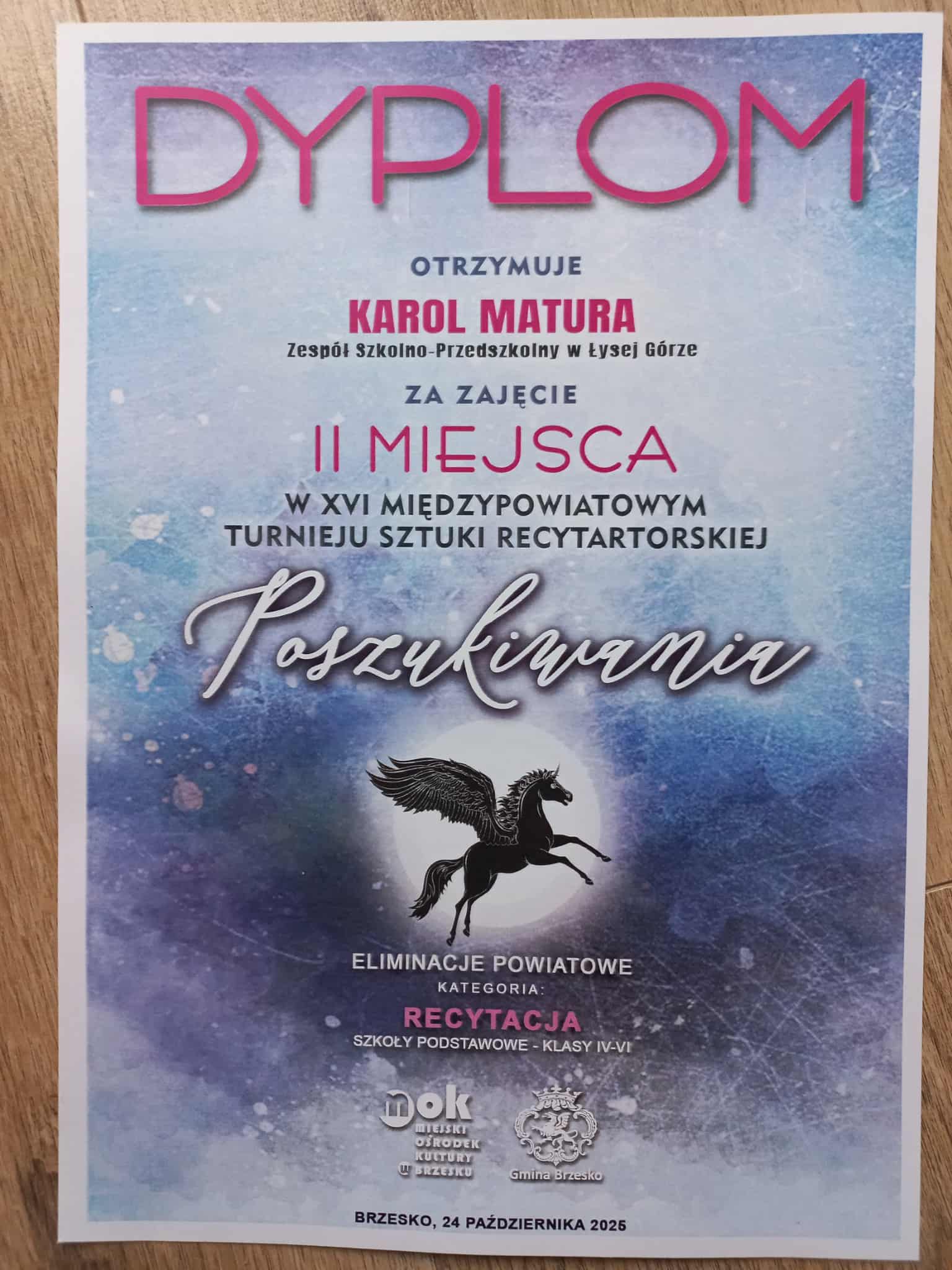 SUKCES KAROLA W TURNIEJU SZTUKI RECYTATORSKIEJ „POSZUKIWANIA”!
