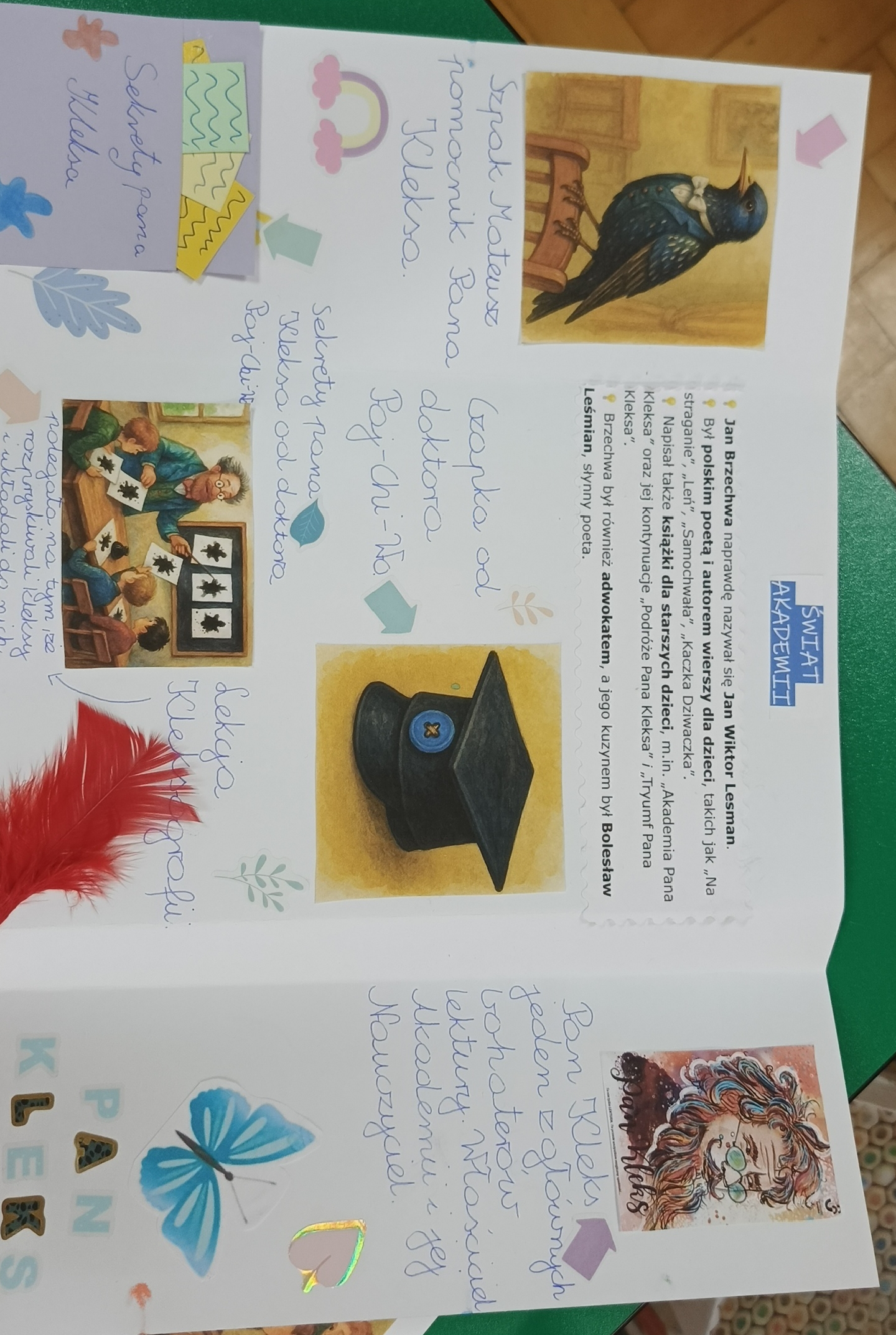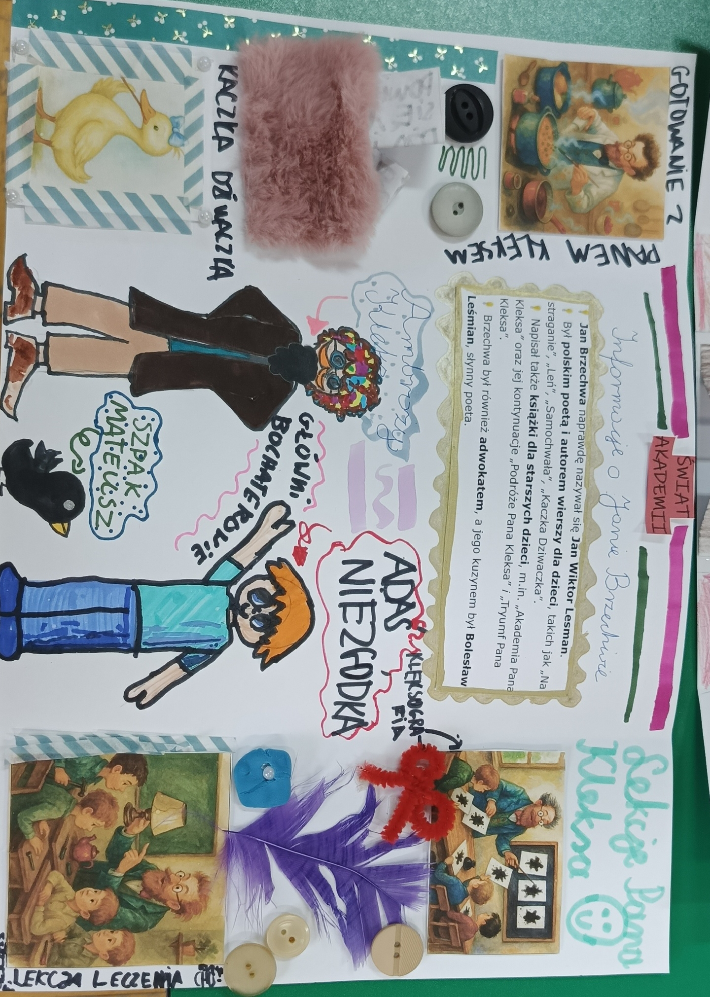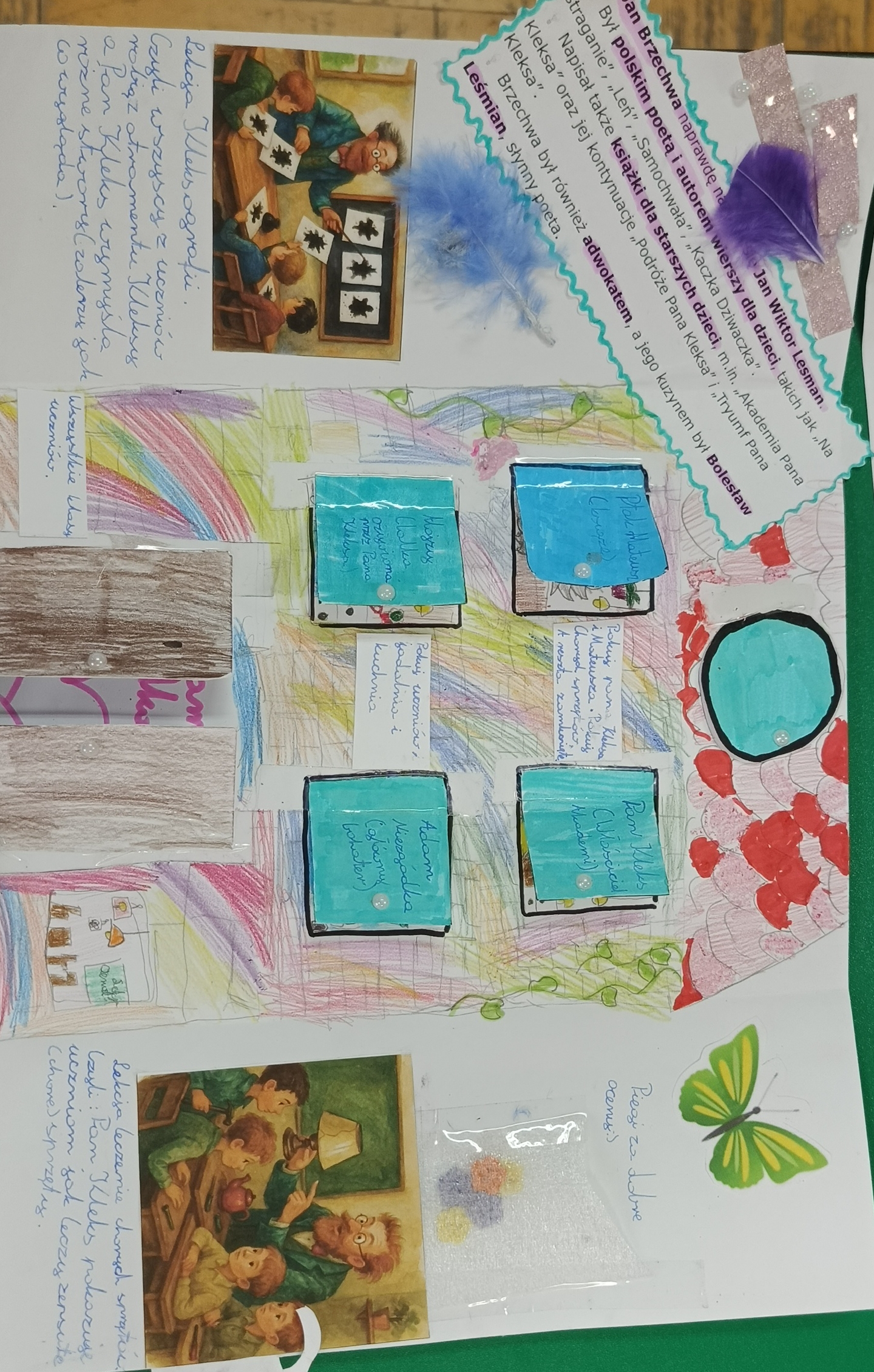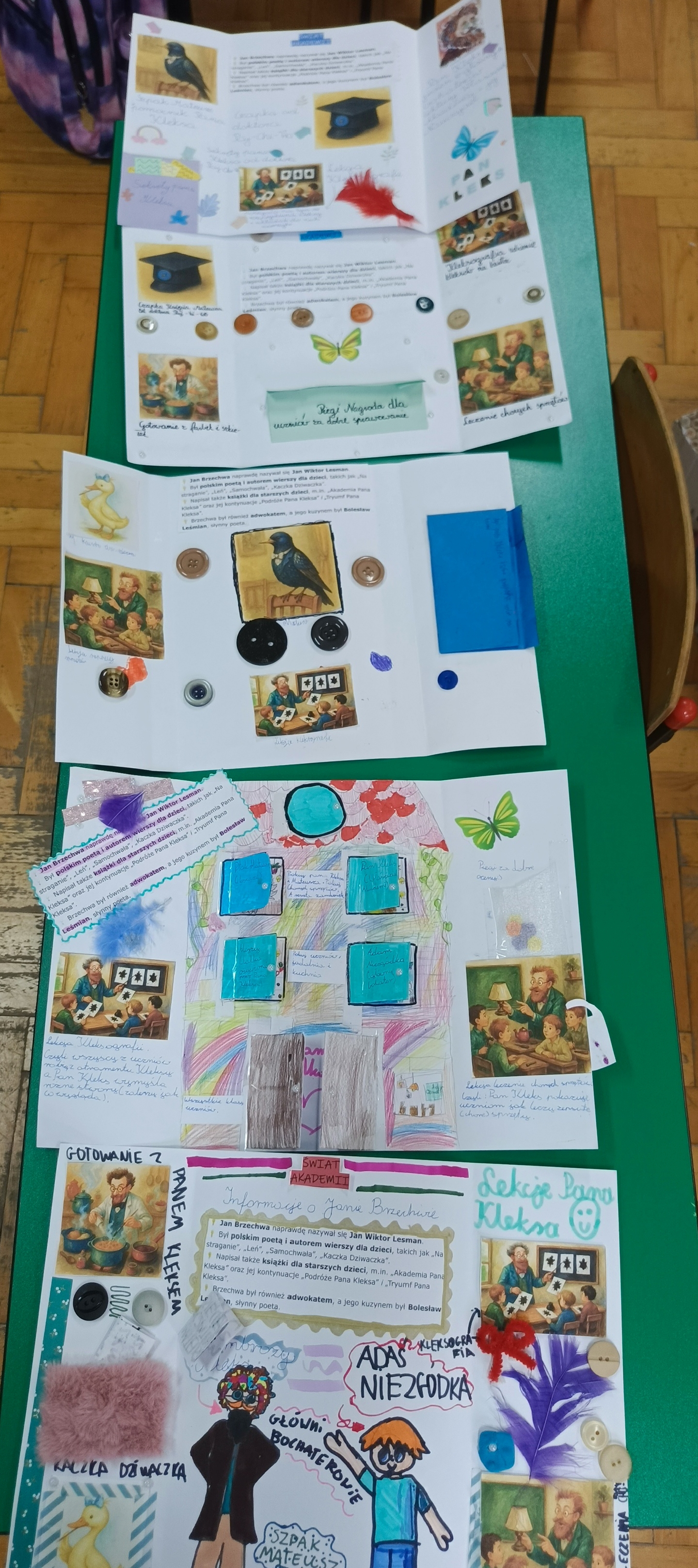 Uczniowie klasy 4 na podsumowanie pracy z lekturą „Akademia pana Kleksa” przygotowali w parach i grupach lapbooki inspirowane światem Ambrożego Kleksa. W swoich pracach uczniowie umieścili najważniejsze informacje o bohaterach, wydarzeniach i niezwykłych przygodach Adasia Niezgódki. Nie zabrakło kolorowych ilustracji, ciekawostek, cytatów i kreatywnych elementów ruchomych. Dzięki tej formie podsumowania lektury dzieci mogły w twórczy sposób utrwalić wiedzę, rozwijać wyobraźnię i pokazać, że nauka może być prawdziwą przygodą — niczym zajęcia w Akademii pana Kleksa!