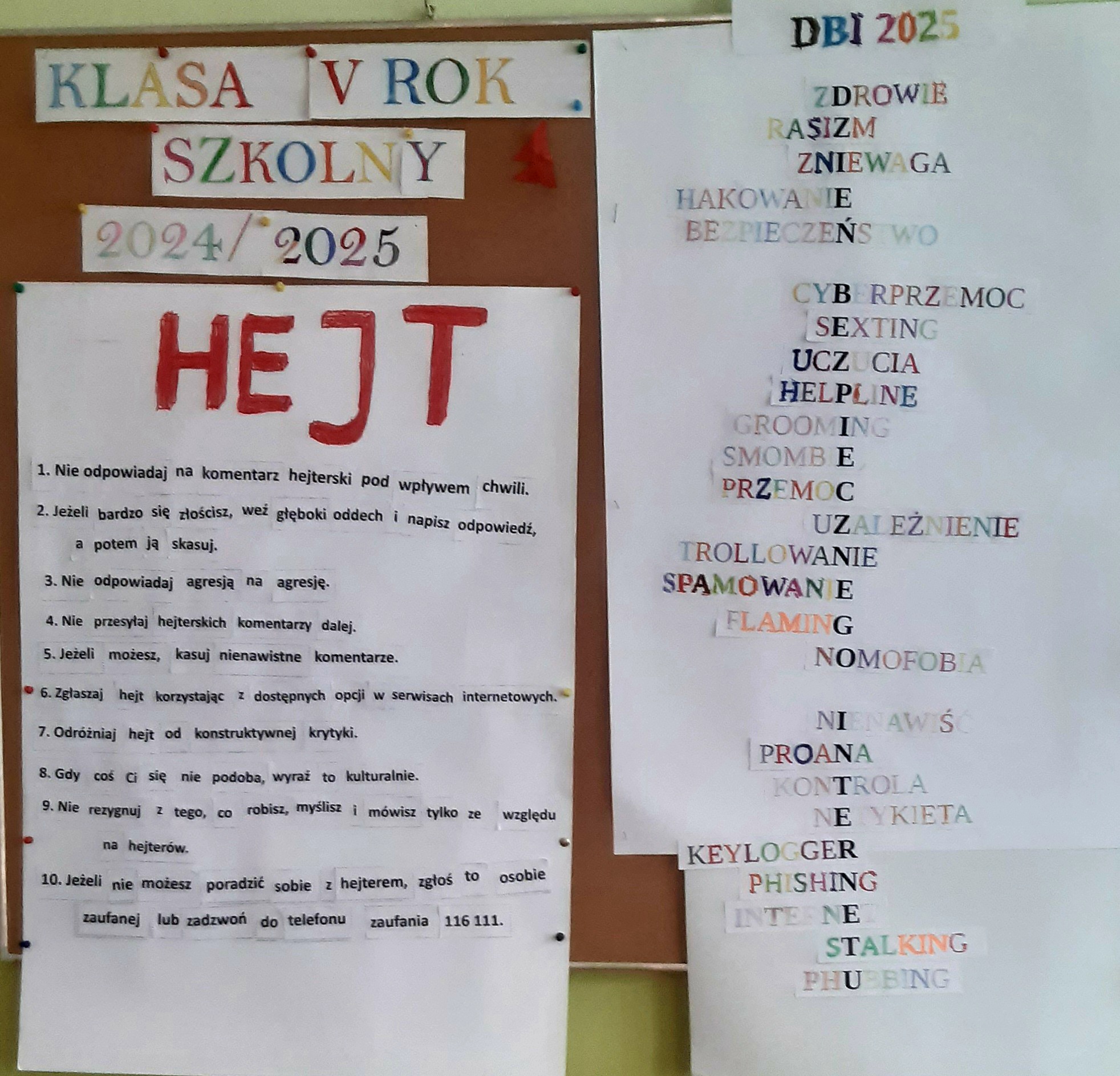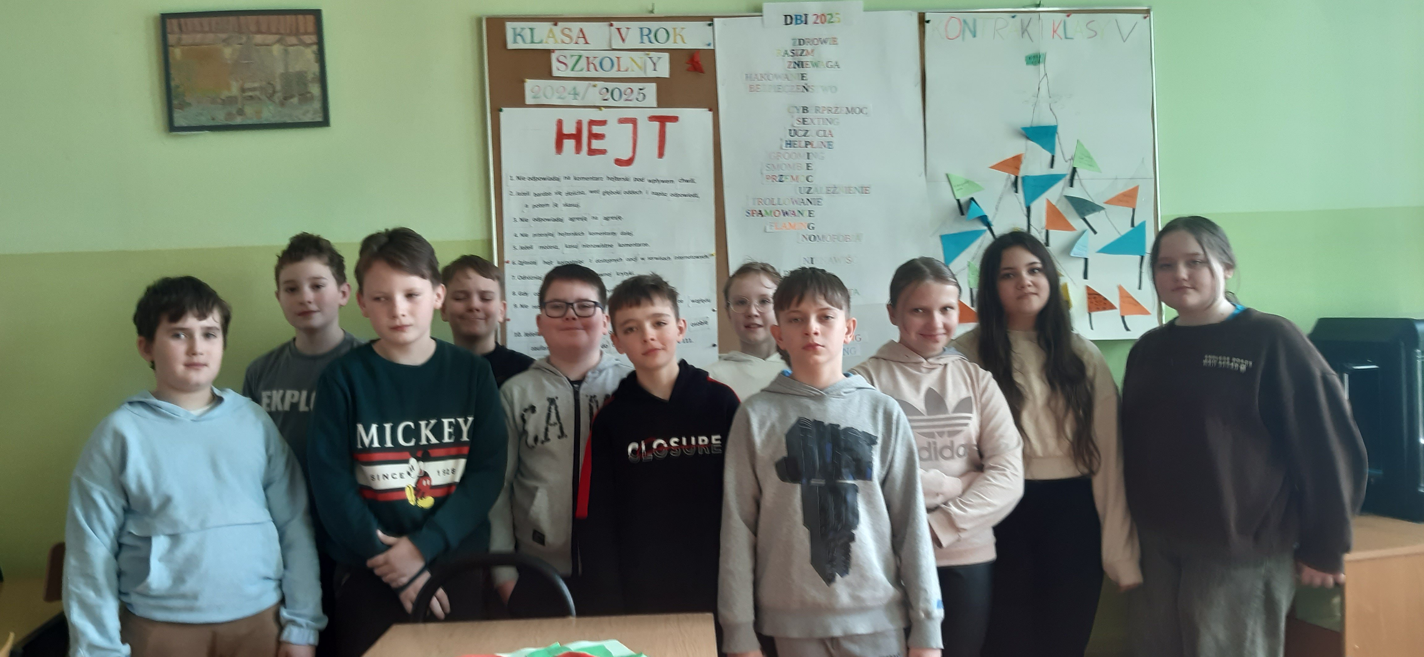 Klasy 1-3 skupiły się na poznaniu i omówieniu zagrożeń Internetowych poprzez obejrzenie animacji „3…2…1…Internet”, poruszających niebezpieczeństwa z jakimi mogą spotkać się mali użytkownicy sieci. Klasa 4 zapoznała się z bezpiecznymi zasadami poruszania się w Internecie w oparciu o materiały promocyjne Stowarzyszenie „Miasta w Internecie” (SMWI) – „Cyfrowo bezpieczni”. Natomiast klasy 5 i 6 pracowały wg materiałów fabularyzowanych „Dodaj znajomego” oraz „Gdzie jest Mimi?”, na których poruszono problem hejtu w kontaktach z rówieśnikami. Ponadto uczniowie wykonali krzyżówkę złożoną z haseł dotyczących zagrożeń internetowych i stworzyli listę zachowań eliminujących hejt. SELMA (ang. Social and Emotional Learning for Mutual Awareness – Kompetencje społeczne i emocjonalne przeciw krzywdzeniu) to europejski projekt edukacyjny, który porusza problem mowy nienawiści i hejtu online poprzez rozwijanie i zwiększanie świadomości, tolerancji i szacunku i to właśnie ten projekt został zrealizowany w klasie 7, a w trakcie jego trwania uczniowie mogli wypowiedzieć się na temat nietolerancji wśród nastolatków. Klasa 8 przekonała się, że bycie offline może być również atrakcyjnym sposobem spędzenia czasu wolnego, pracując wg scenariusza „Chill w realu”.