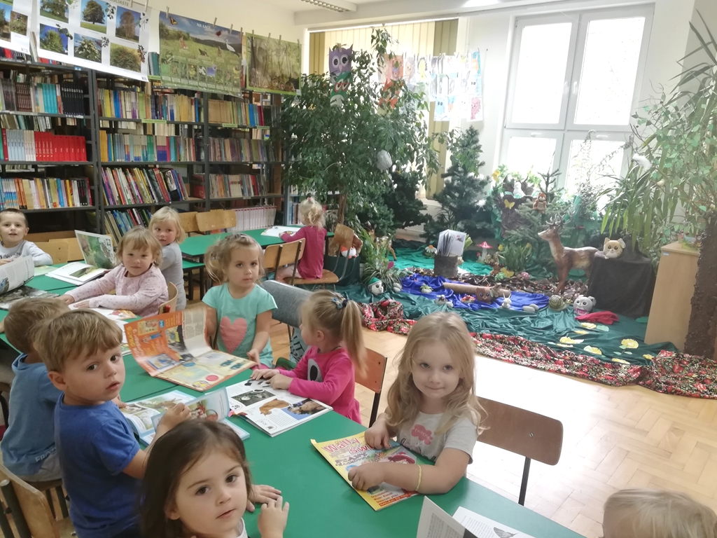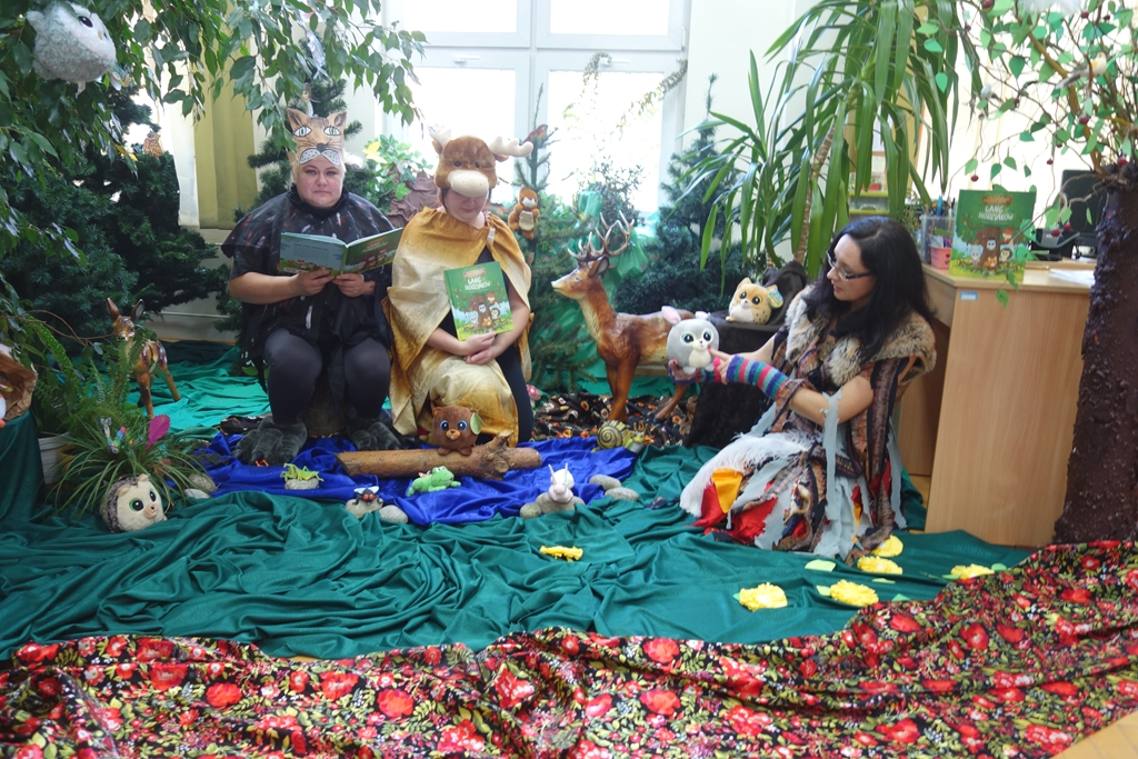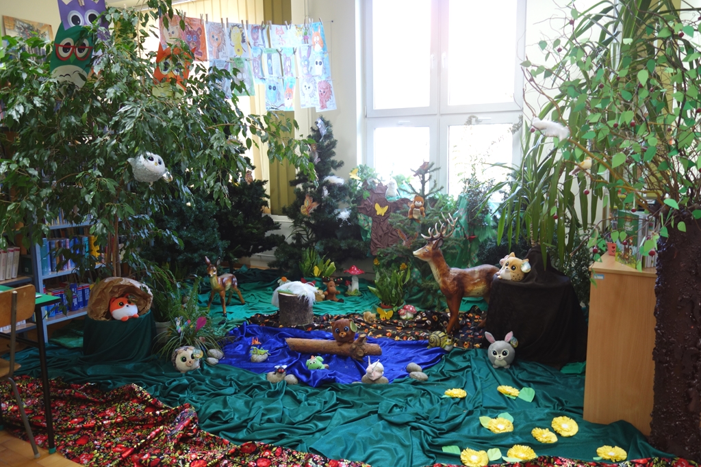 Na kilka dni biblioteka szkolna stała się leśną polaną, a pani bibliotekarka wcieliła się w rolę Mądrej Sowy i czytała wybrane przygody Słodziaków: o tym, jak zajęczyca Zuzia chciała wszystkim pomagać, jak Lisek Lucek chciał miał problemy z dochowaniem tajemnicy, a  Ryś Rysio nie chciał być już rysiem.
