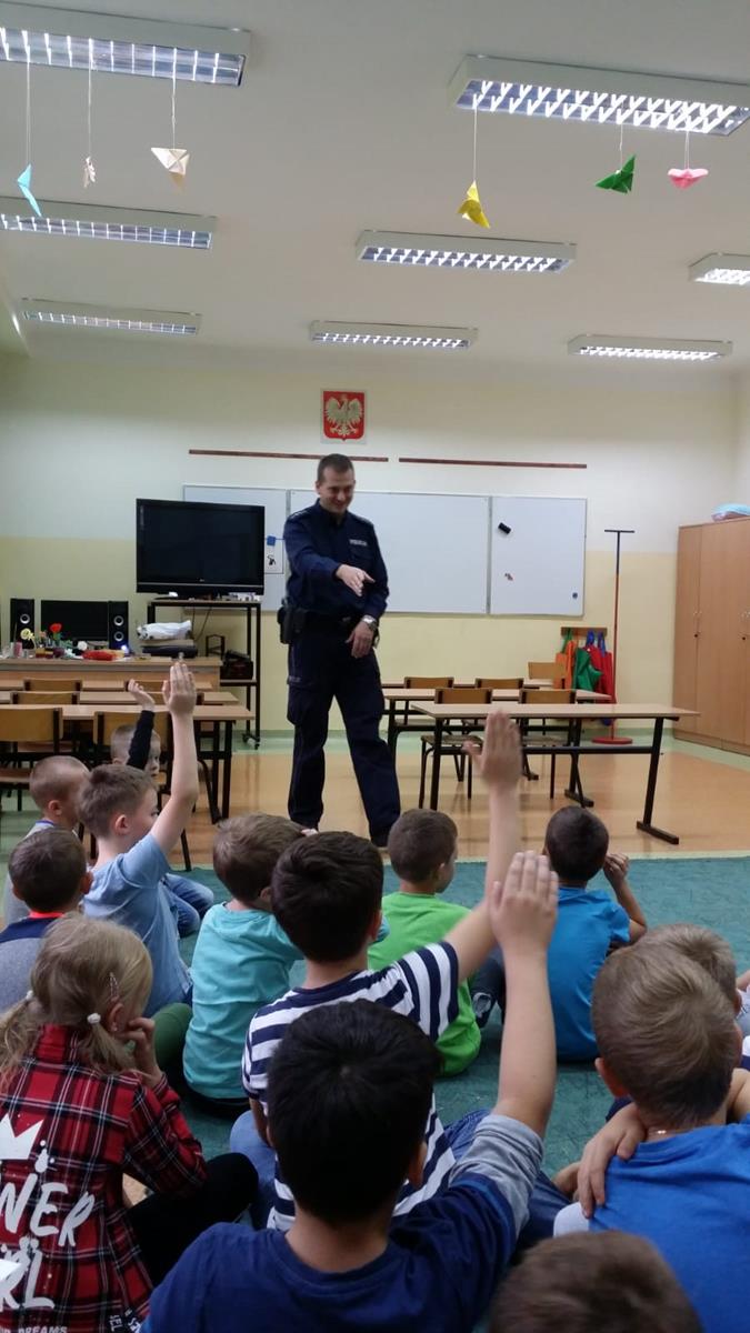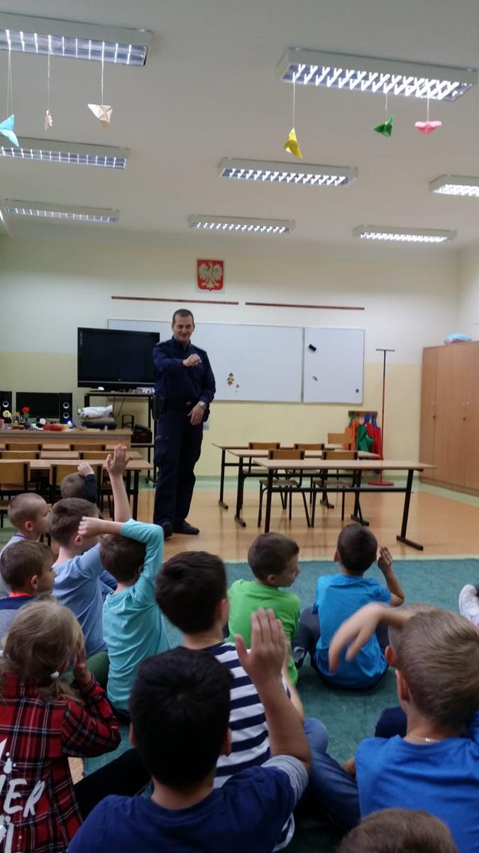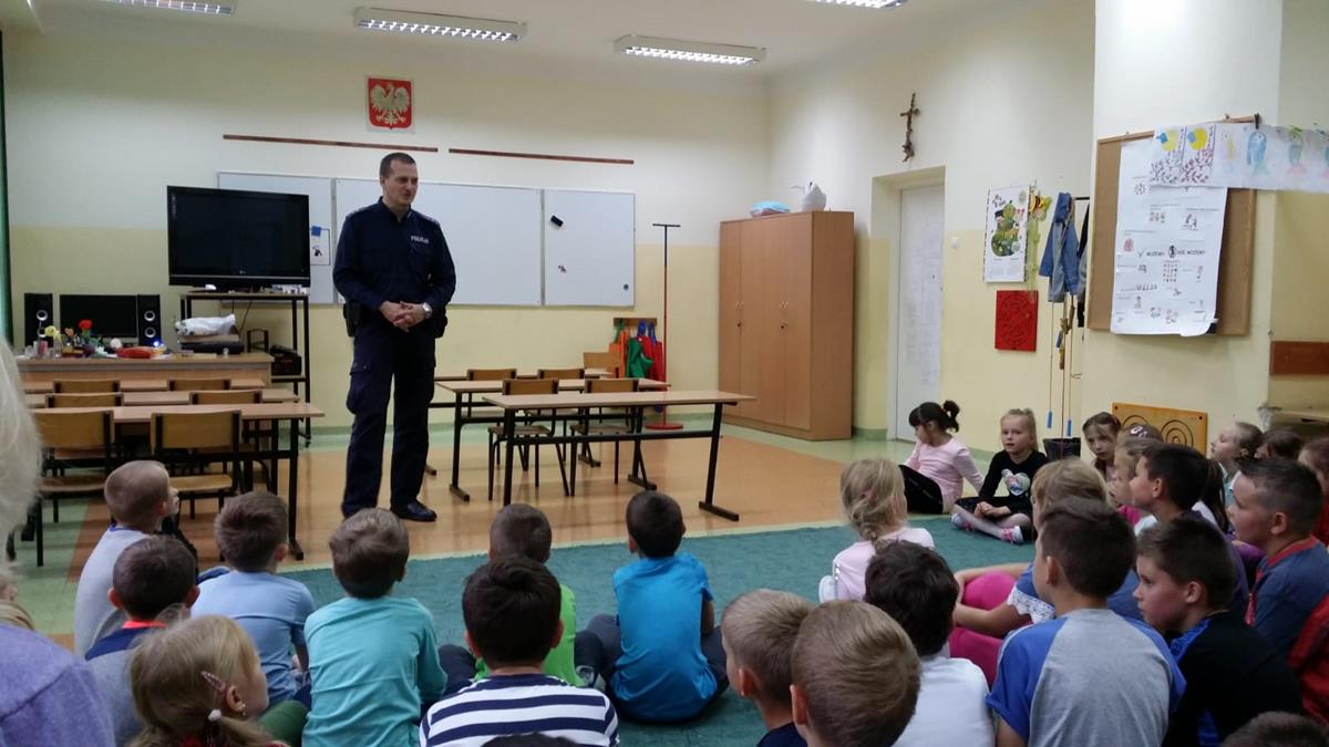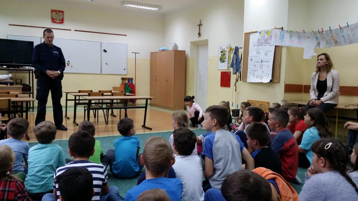 W myśl jednego z podstawowych kierunków realizacji polityki oświatowej państwa, jakim w roku szkolnym 2019/2020 jest m.in. “Profilaktyka uzależnień w szkołach i placówkach oświatowych”, zaprosiliśmy do naszej podstawówki policjanta.