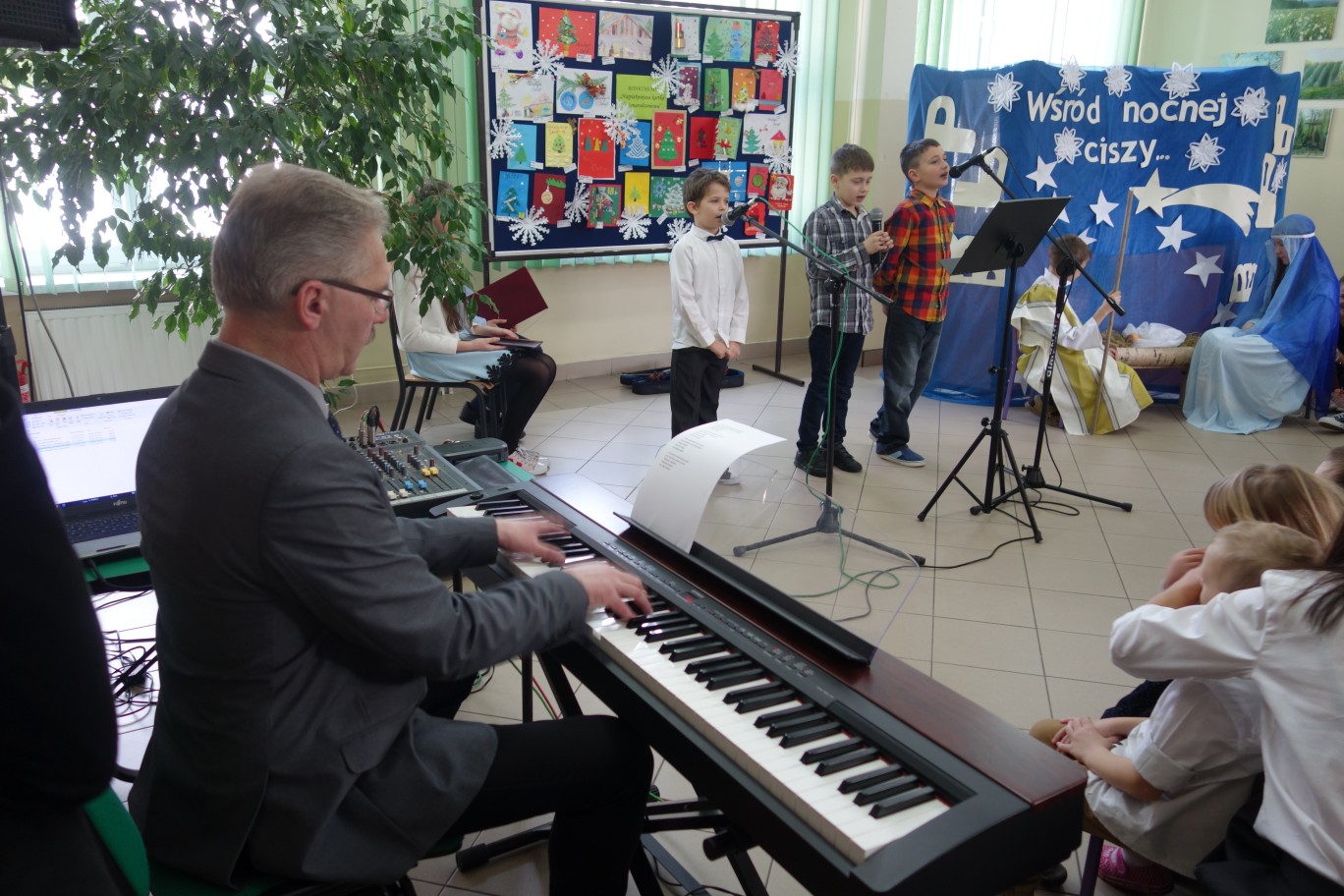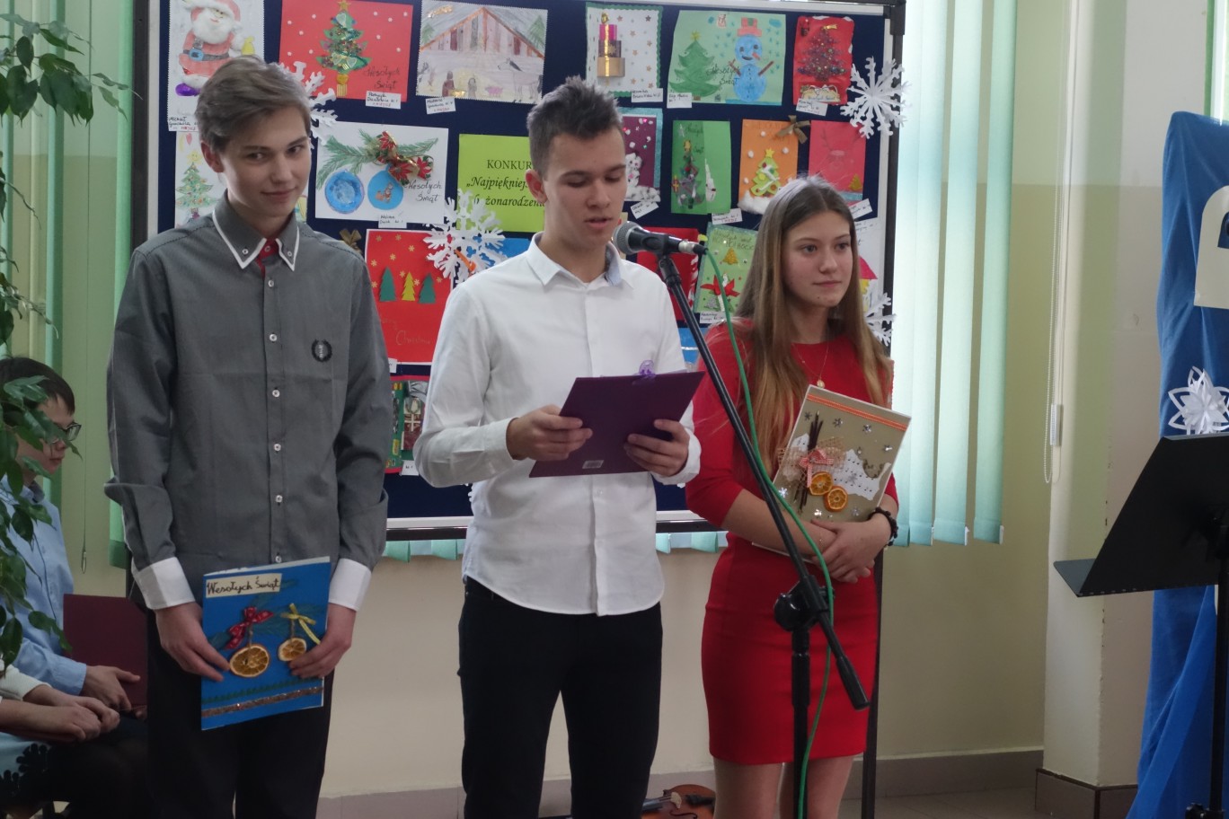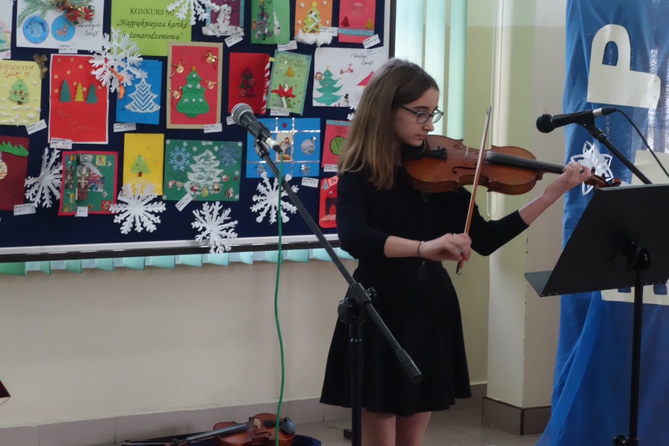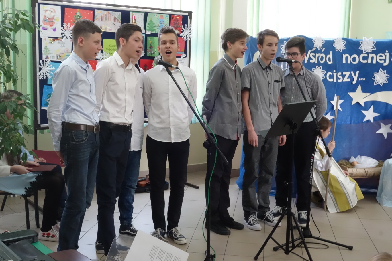 Zgodnie ze szkolną tradycją w ostatnim dniu przed przerwą świąteczną uczniowie, nauczyciele oraz pracownicy naszej szkoły zebrali się, by wysłuchać kolęd i pastorałek w wykonaniu przedstawicieli niemal wszystkich klas. Co więcej, ku zaskoczeniu
