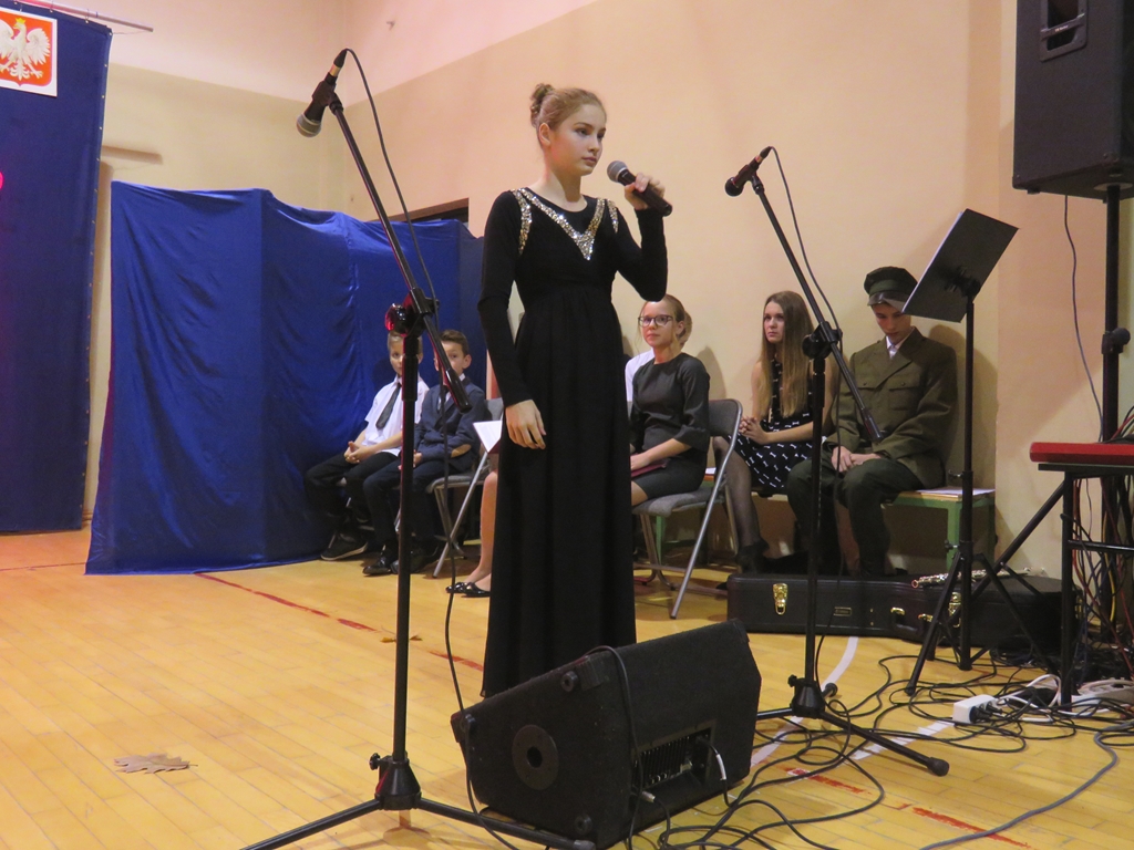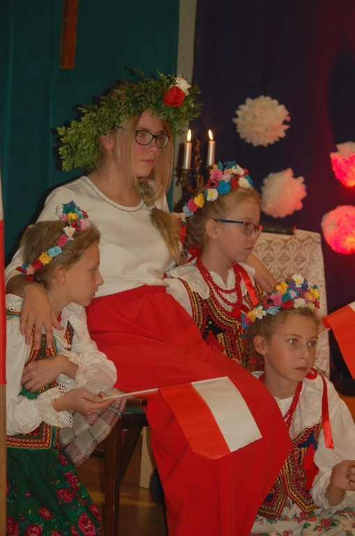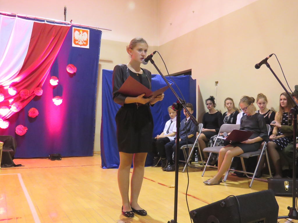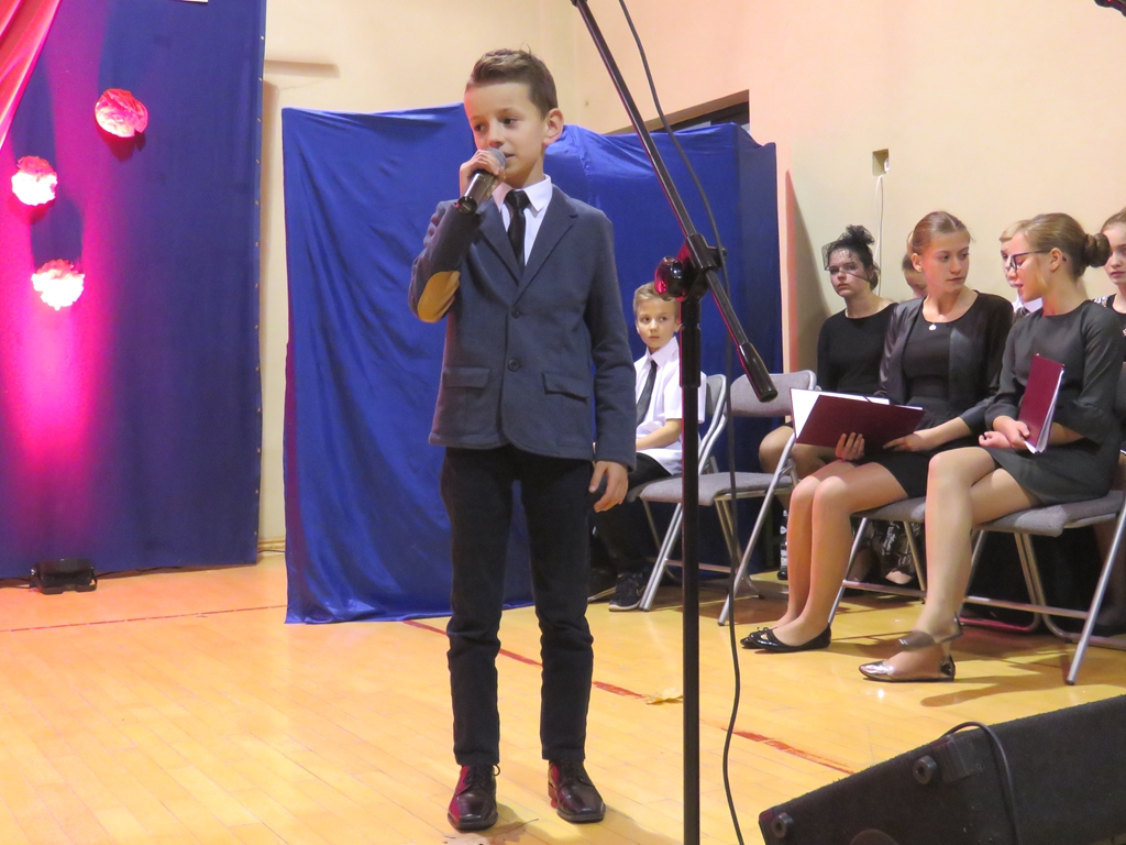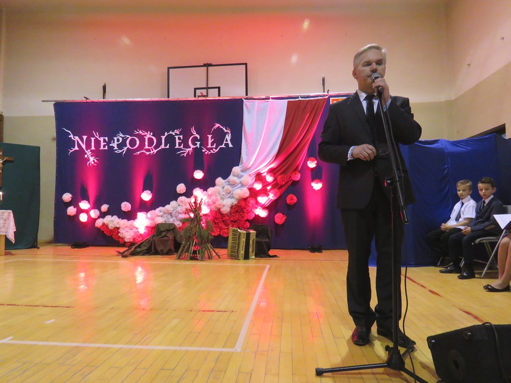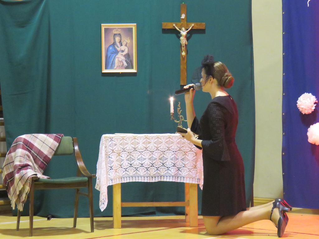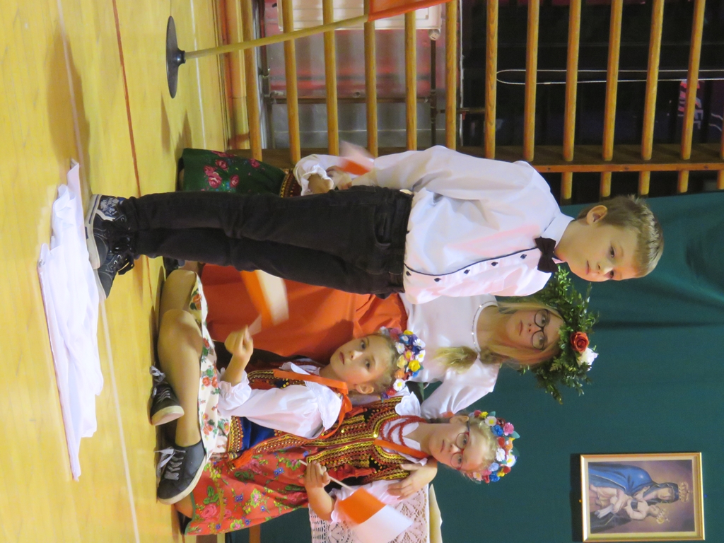 „Słuchaj więc i patrz”- naszą wieczornicę rozpoczęliśmy zapowiedzią konferansjerek, a potem popłynęły wzruszające słowa wierszy i piosenek. Uczniowie z zaangażowaniem prezentowali symboliczne  sceny dramowe, a  najmłodsze dzieci – zerówiaki, cudownie zatańczyły taniec z szarfami oraz poloneza. Całości dopełniała skromna, ale niezwykle wymowna scenografia. Pojawił się także wyjątkowy akcent- hejnał zagrany na żywo przez pana Józefa Brzezińskiego, na co dzień organistę łysogórskiej parafii, a prywatnie dziadka jednej z tańczących dziewczynek.