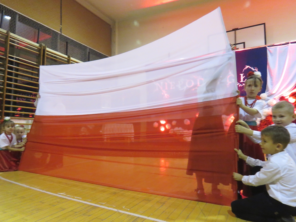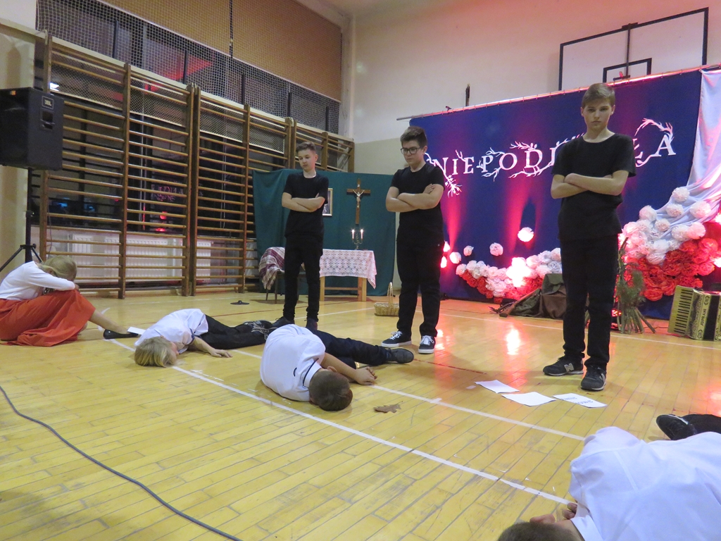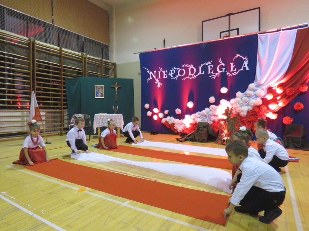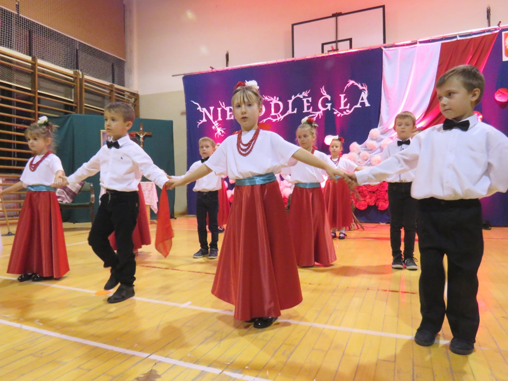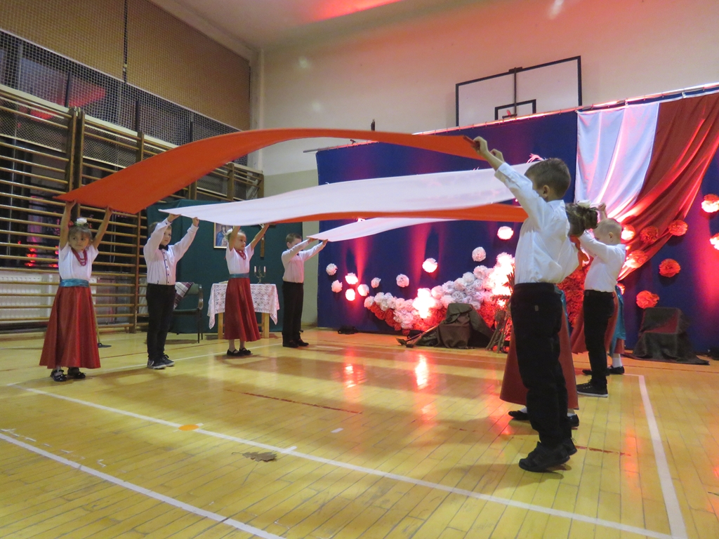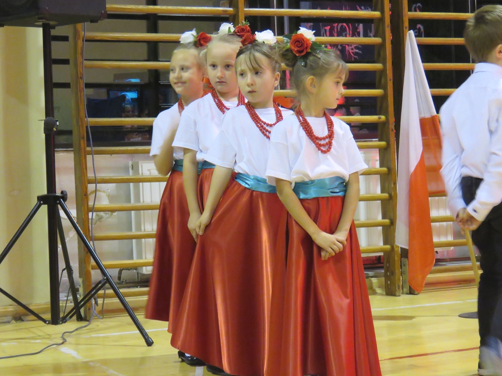 „Słuchaj więc i patrz”- naszą wieczornicę rozpoczęliśmy zapowiedzią konferansjerek, a potem popłynęły wzruszające słowa wierszy i piosenek. Uczniowie z zaangażowaniem prezentowali symboliczne  sceny dramowe, a  najmłodsze dzieci – zerówiaki, cudownie zatańczyły taniec z szarfami oraz poloneza. Całości dopełniała skromna, ale niezwykle wymowna scenografia. Pojawił się także wyjątkowy akcent- hejnał zagrany na żywo przez pana Józefa Brzezińskiego, na co dzień organistę łysogórskiej parafii, a prywatnie dziadka jednej z tańczących dziewczynek.