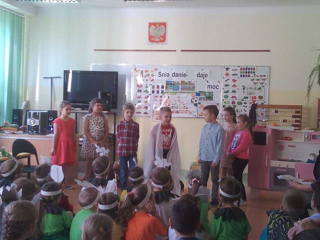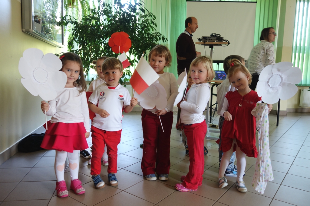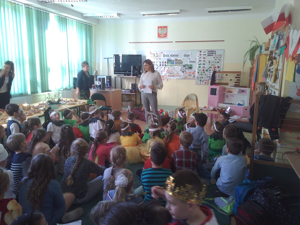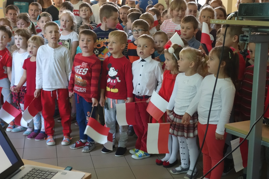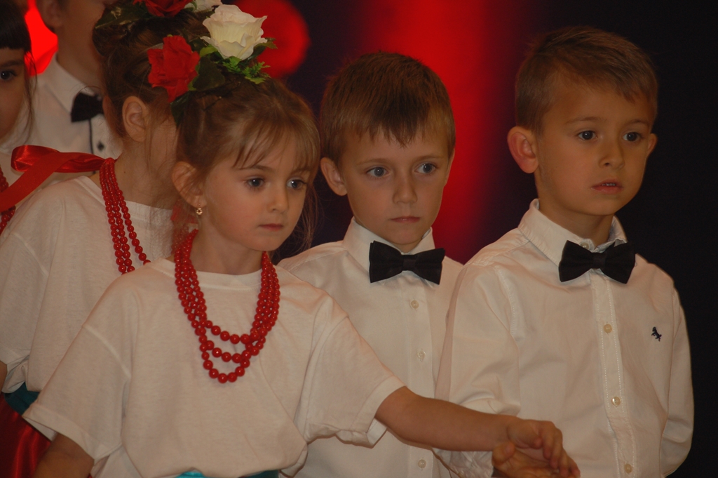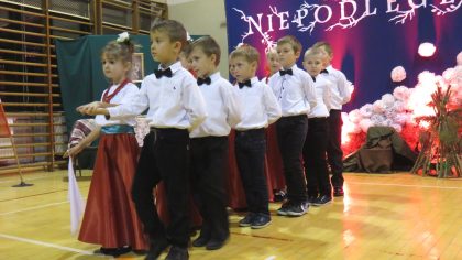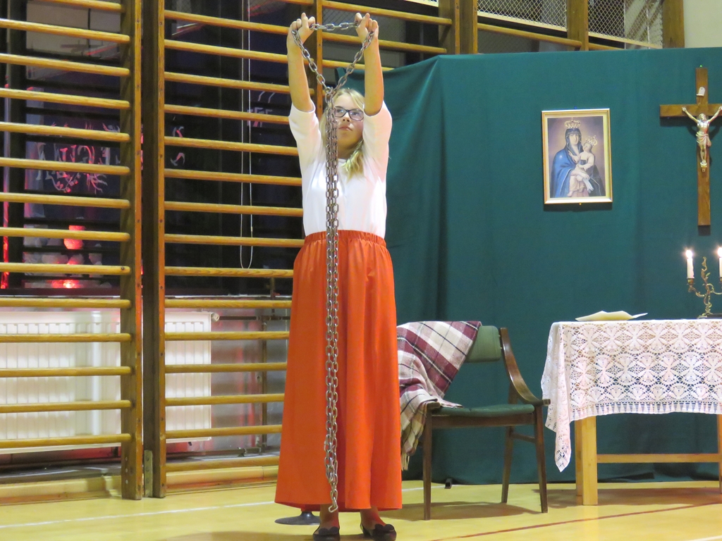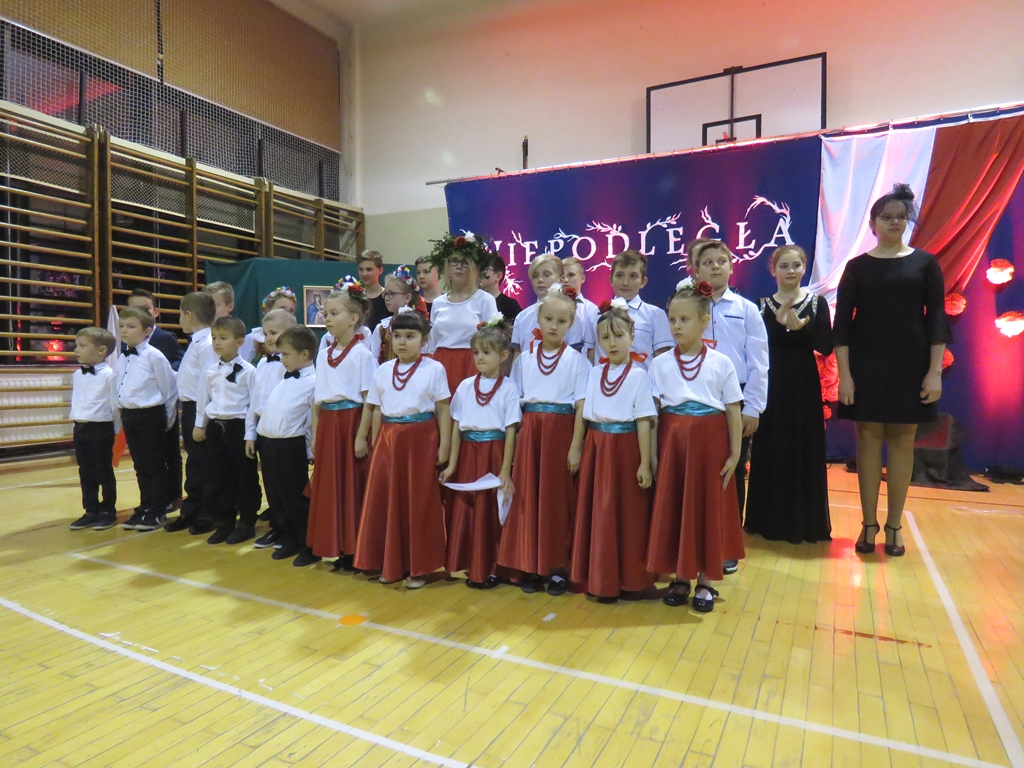 „Słuchaj więc i patrz”- naszą wieczornicę rozpoczęliśmy zapowiedzią konferansjerek, a potem popłynęły wzruszające słowa wierszy i piosenek. Uczniowie z zaangażowaniem prezentowali symboliczne  sceny dramowe, a  najmłodsze dzieci – zerówiaki, cudownie zatańczyły taniec z szarfami oraz poloneza. Całości dopełniała skromna, ale niezwykle wymowna scenografia. Pojawił się także wyjątkowy akcent- hejnał zagrany na żywo przez pana Józefa Brzezińskiego, na co dzień organistę łysogórskiej parafii, a prywatnie dziadka jednej z tańczących dziewczynek.