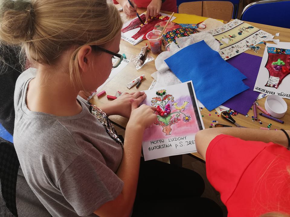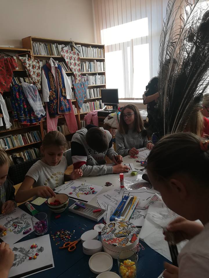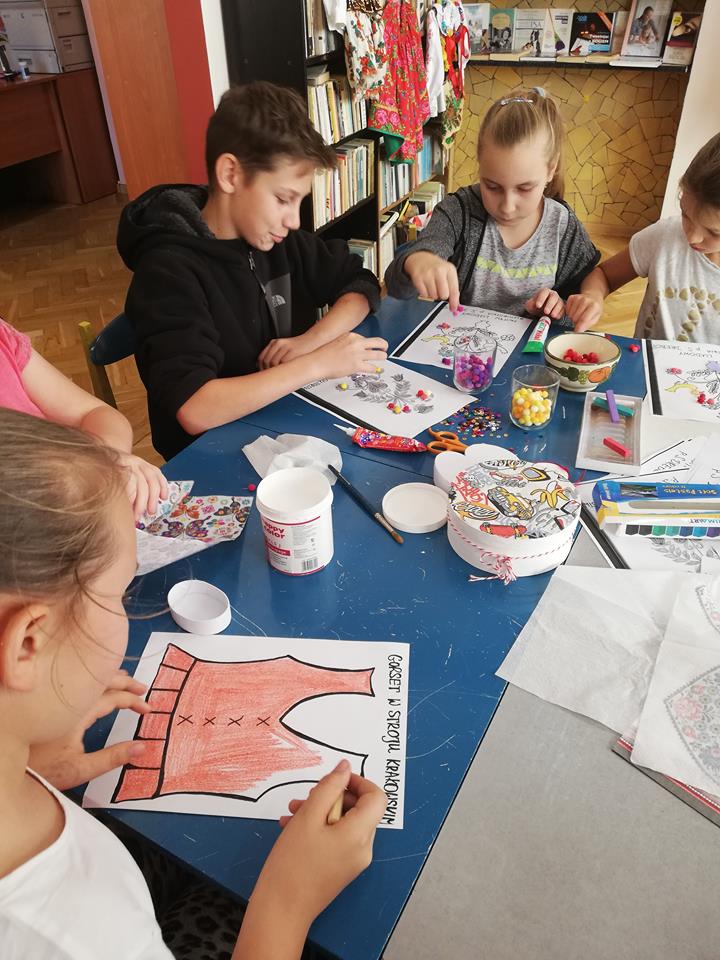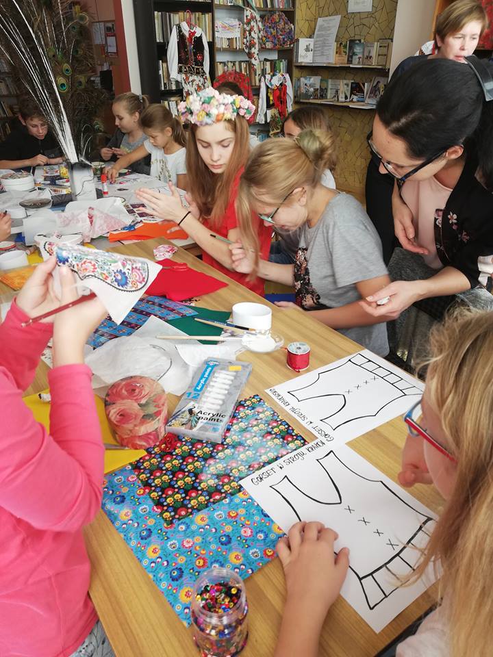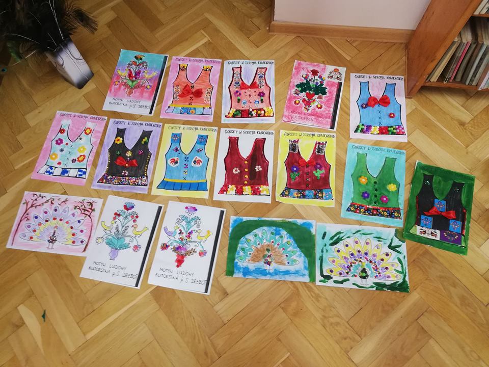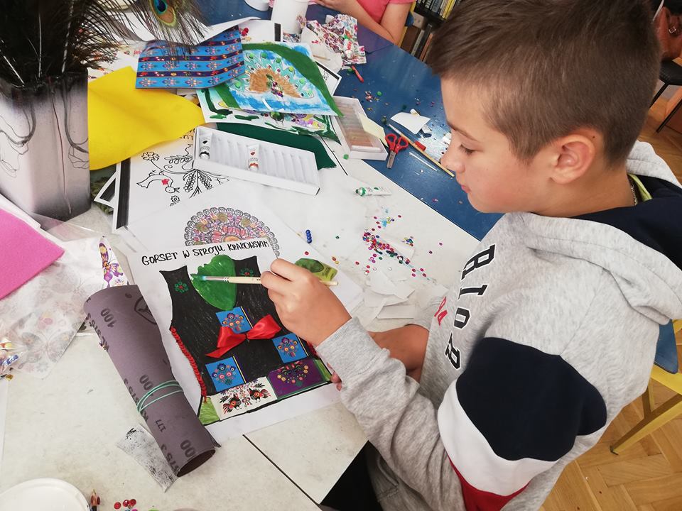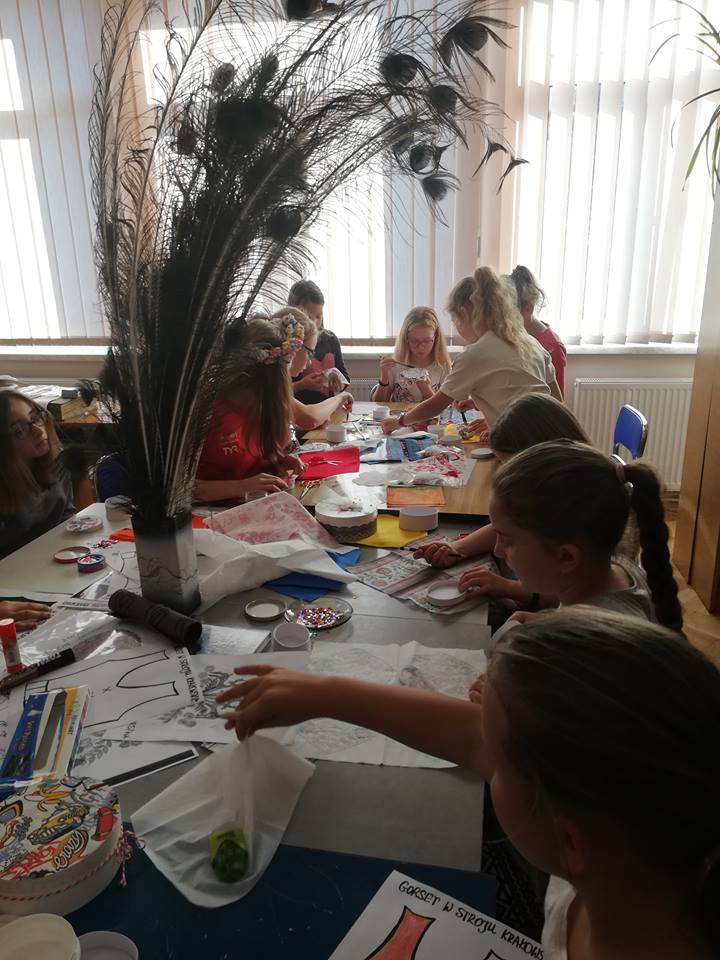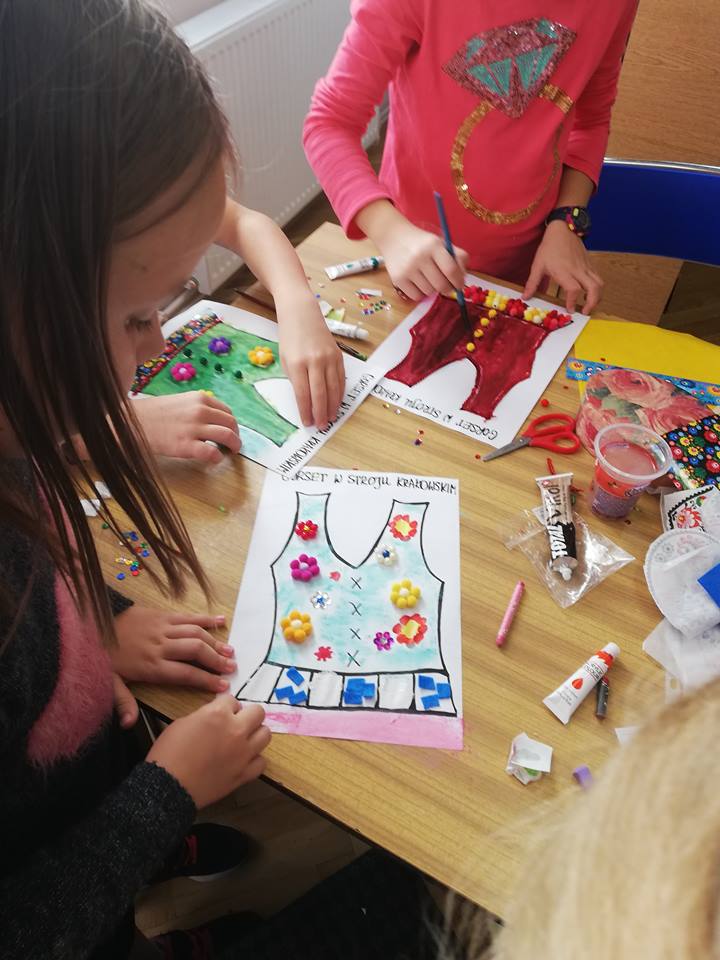 W zajęciach warsztatowych wzięło udział 15 uczniów   z klas IV- VII. Wykonanie prac podczas zajęć warsztatowych poprzedzone zostało mini wykładem  p. Doroty Prokop na temat wyglądu damskiego i męskiego  stroju krakowskiego (scharakteryzowała  ona poszczególne elementy stroju, kolorystykę, dodatki i inne). Podczas dwugodzinnych warsztatów uczniowie wykonali po dwie prace: pudełeczka techniką decoupage oraz wyklejanki przedstawiające damskie gorsety stroju ludowego.  Część uczestników wybrała ozdabianie motywu ludowego – szkicu autorstwa p. Stefanii Drebot, który udostępniła uczniom. Do stworzenia prac wykorzystane zostały m.in. serwetki z motywami ludowymi, kolorowe materiały, cekiny, koraliki, farby oraz gotowe wzory folklorystyczne. Piękne pawie piórka wyeksponowane w wazonie przekazała p. Justyna Grochola.